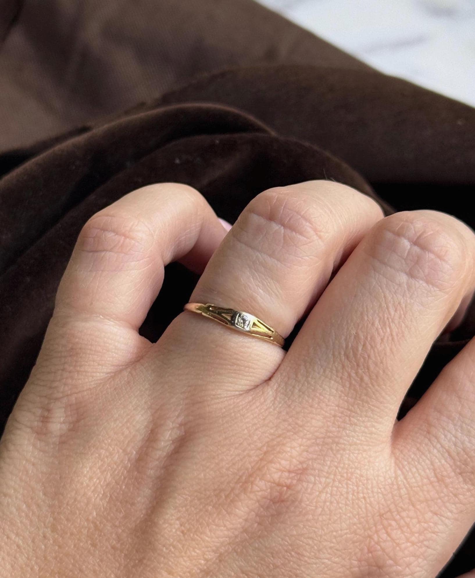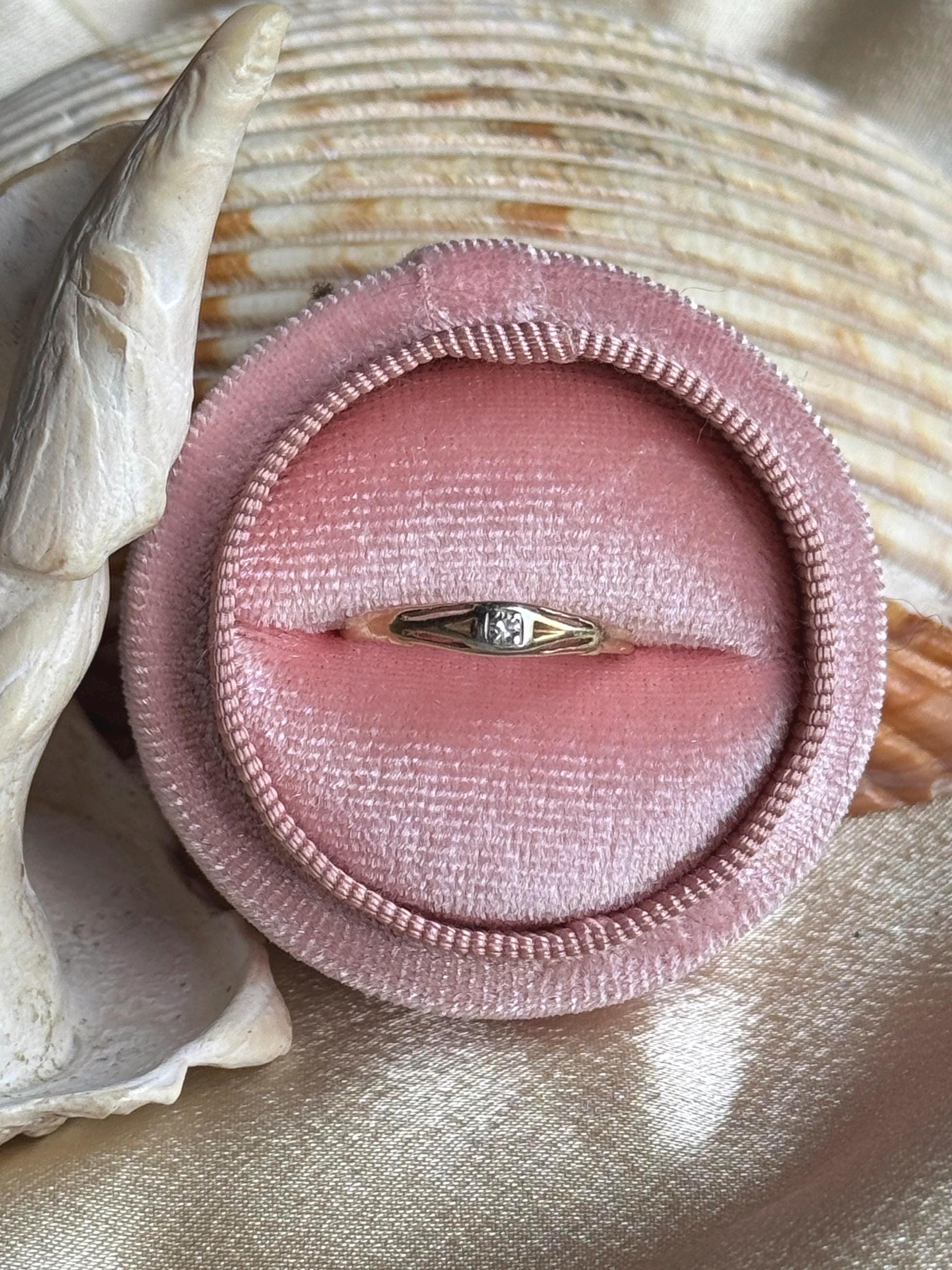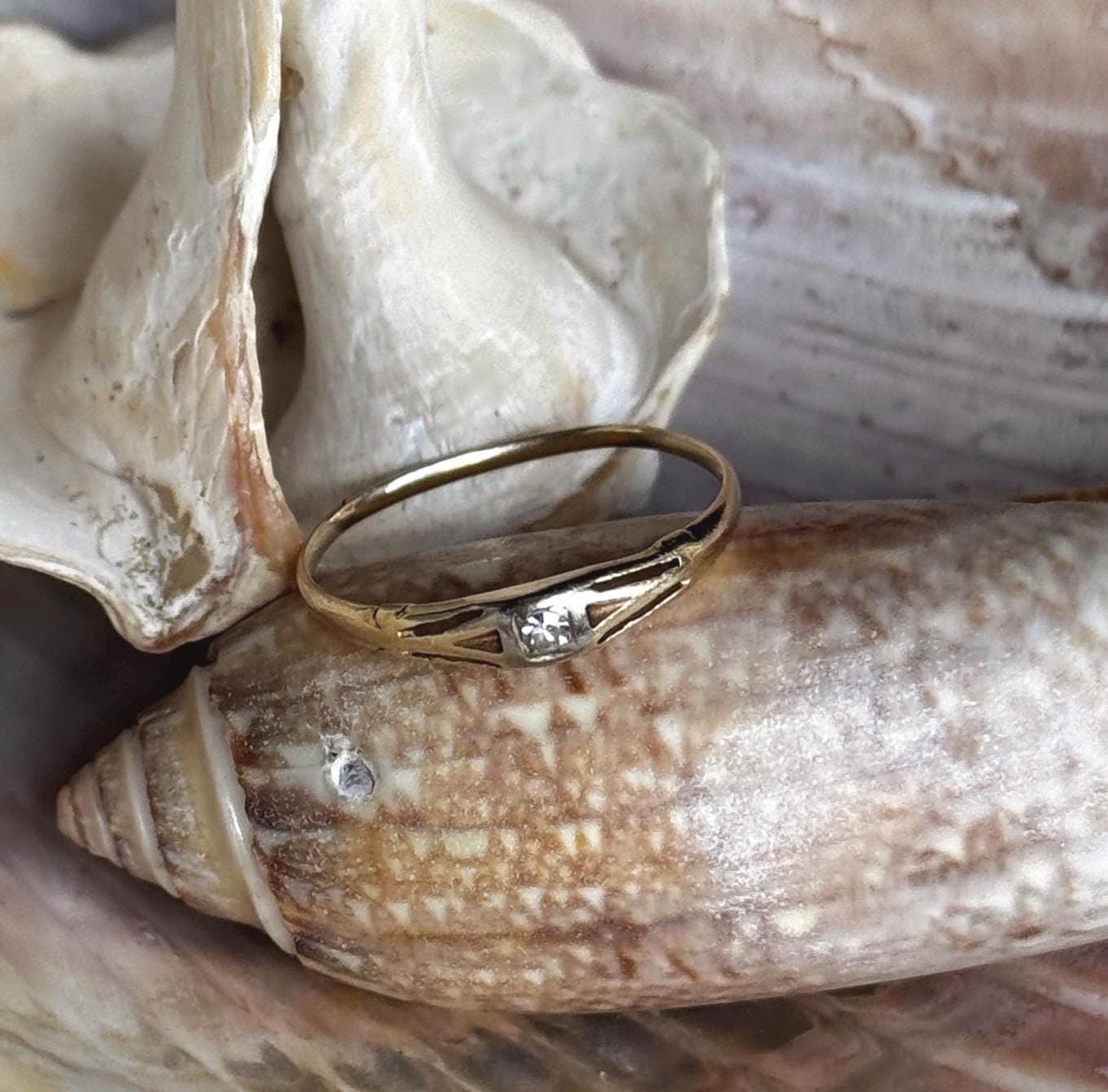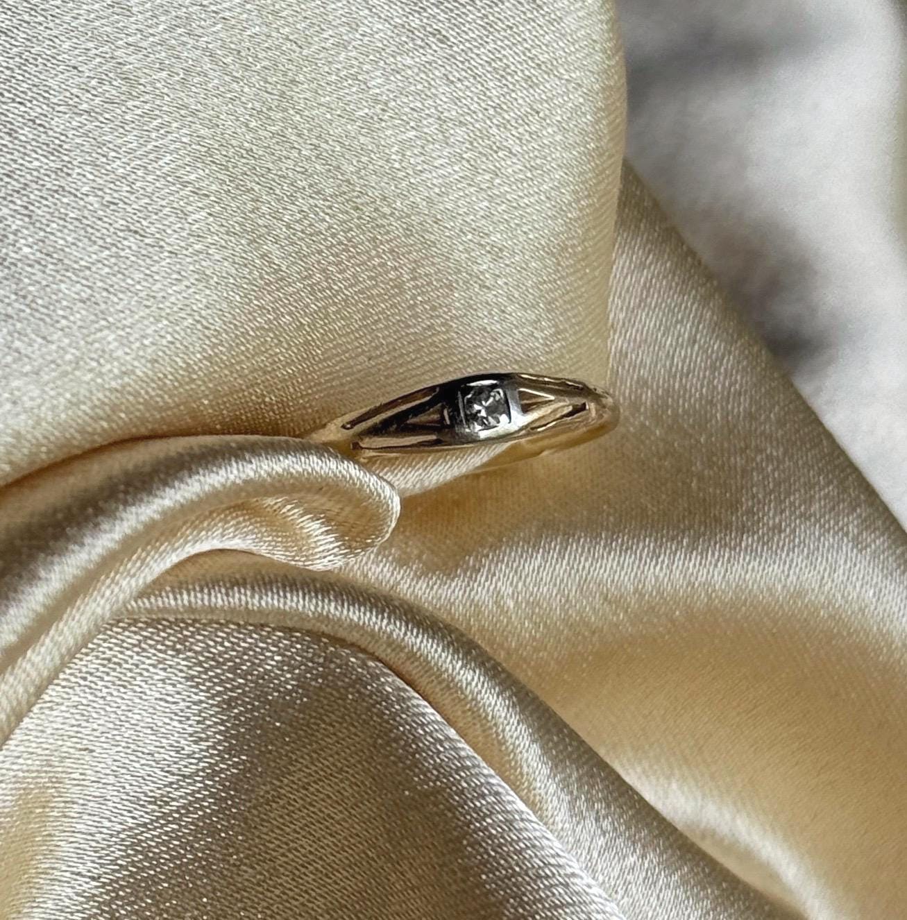 This is the most darling antique (c.1920/30s) 14k gold diamond ring! This one features a white gold halo surrounding the center diamond to give it a little extra shine, and the prettiest open work designs on each shoulder that are so iconic of its era. It would have originally been worn as a wedding ring, so it stands beautifully on its own on the ring finger, but it is also the perfect size to add to any ring stack and looks so charming with company.
