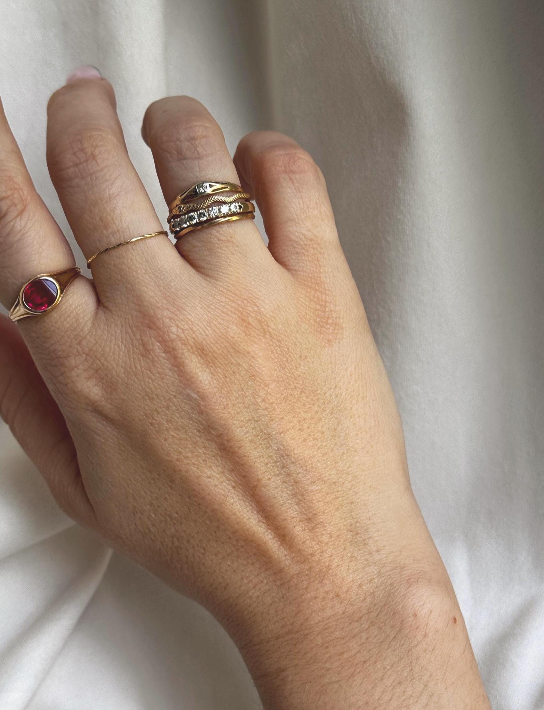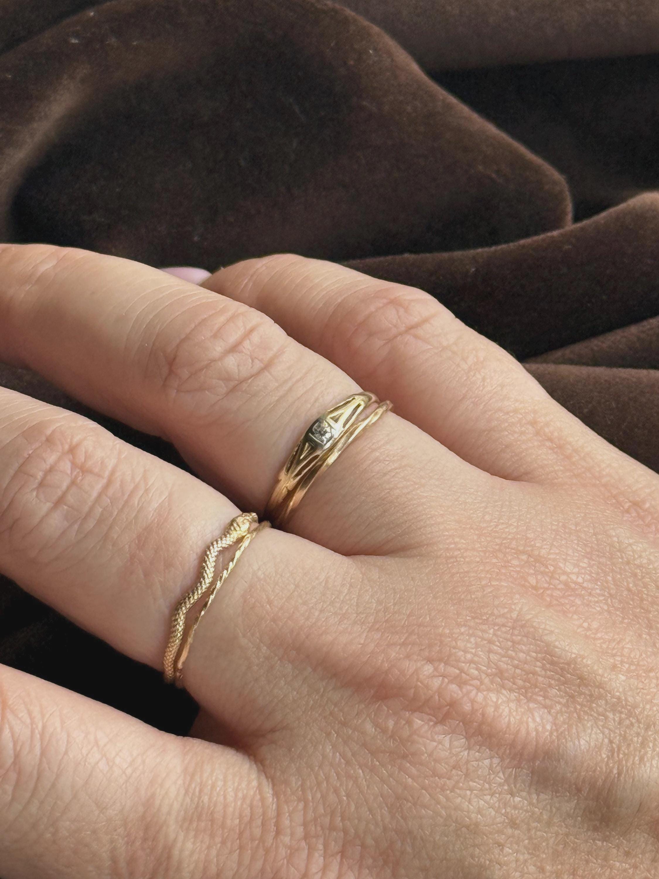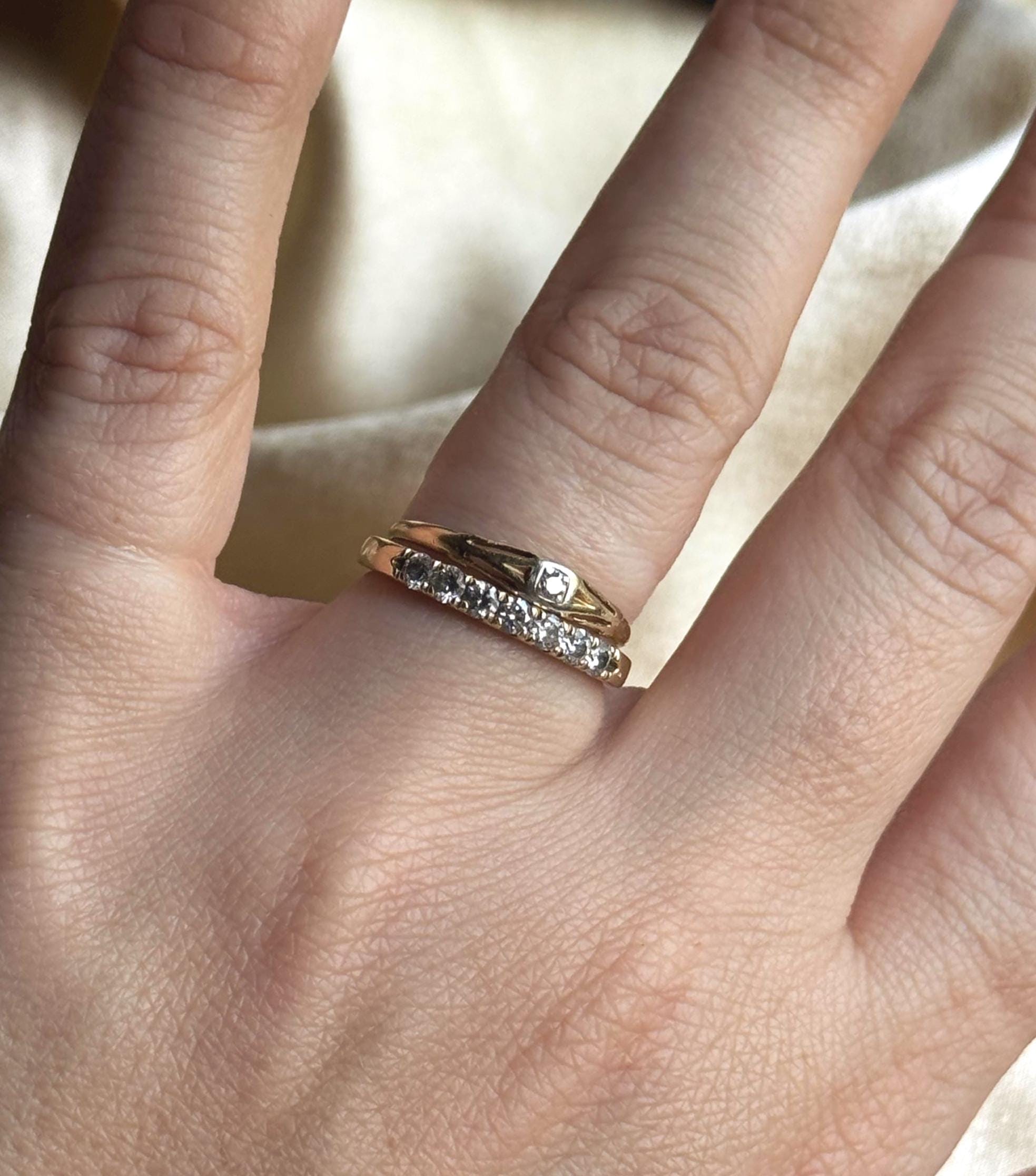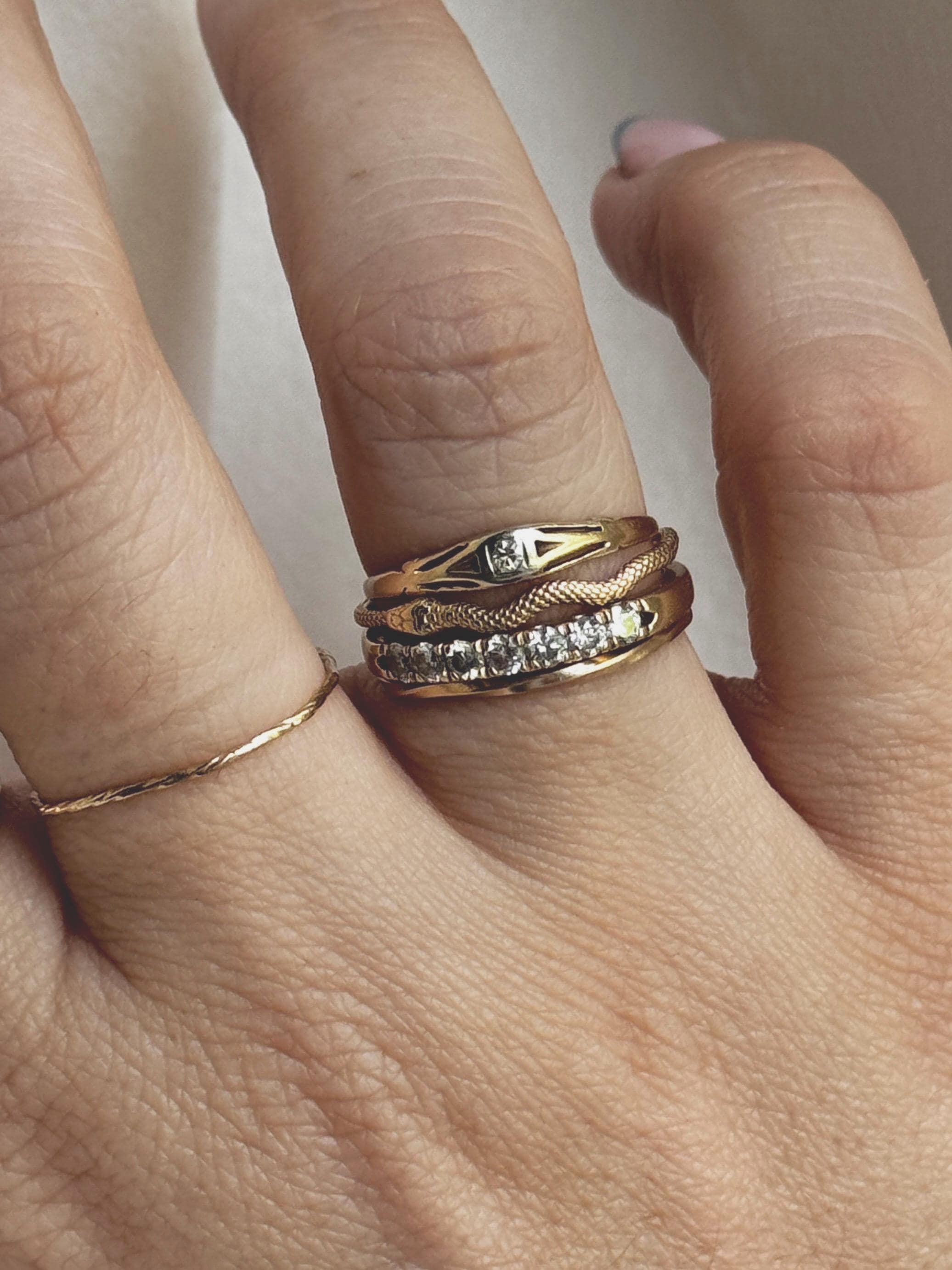 This is the most darling antique (c.1920/30s) 14k gold diamond ring! This one features a white gold halo surrounding the center diamond to give it a little extra shine, and the prettiest open work designs on each shoulder that are so iconic of its era. It would have originally been worn as a wedding ring, so it stands beautifully on its own on the ring finger, but it is also the perfect size to add to any ring stack and looks so charming with company.