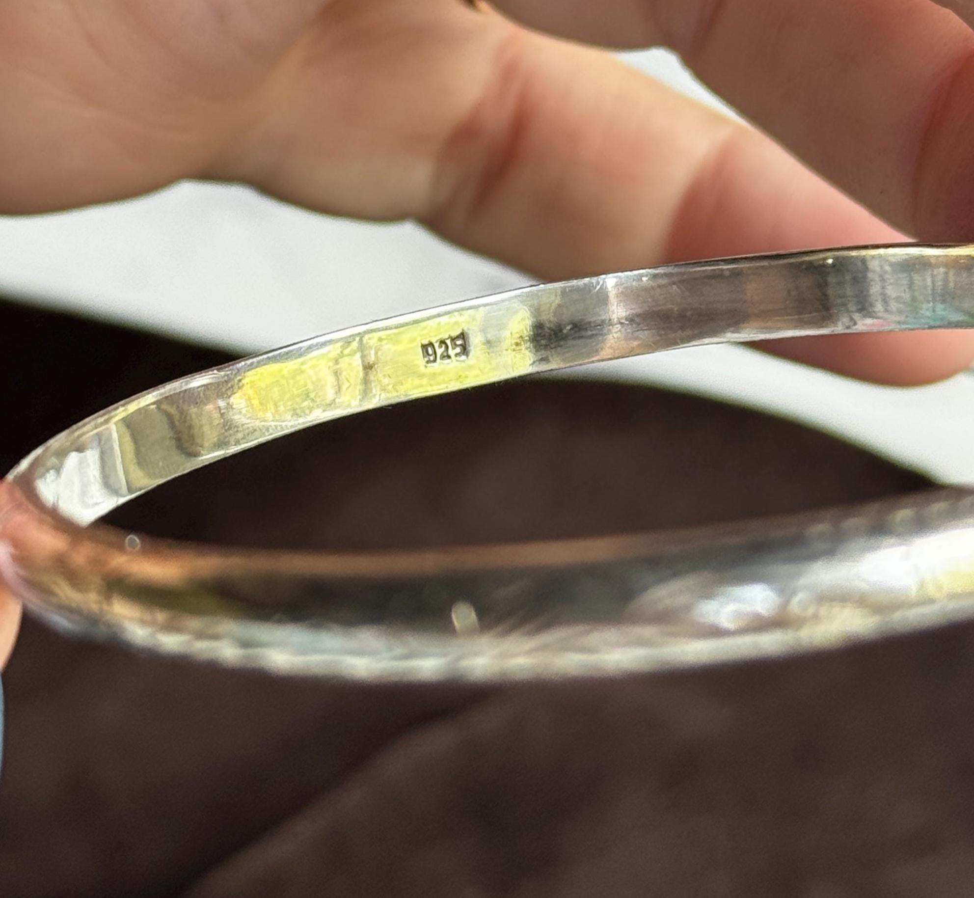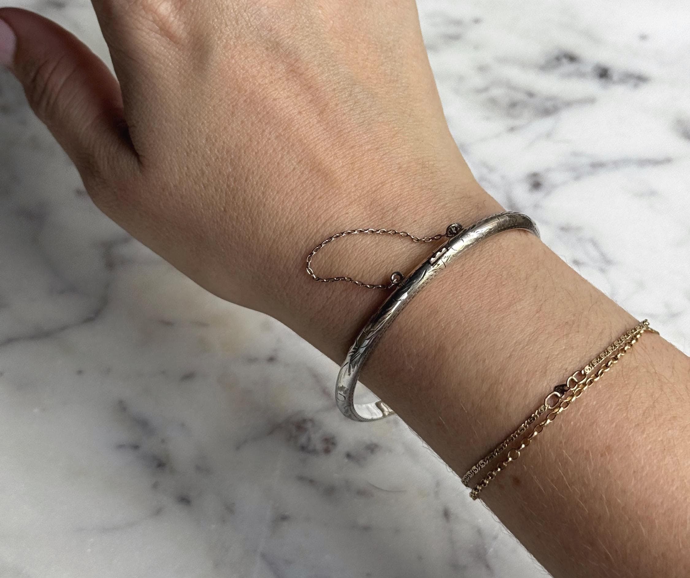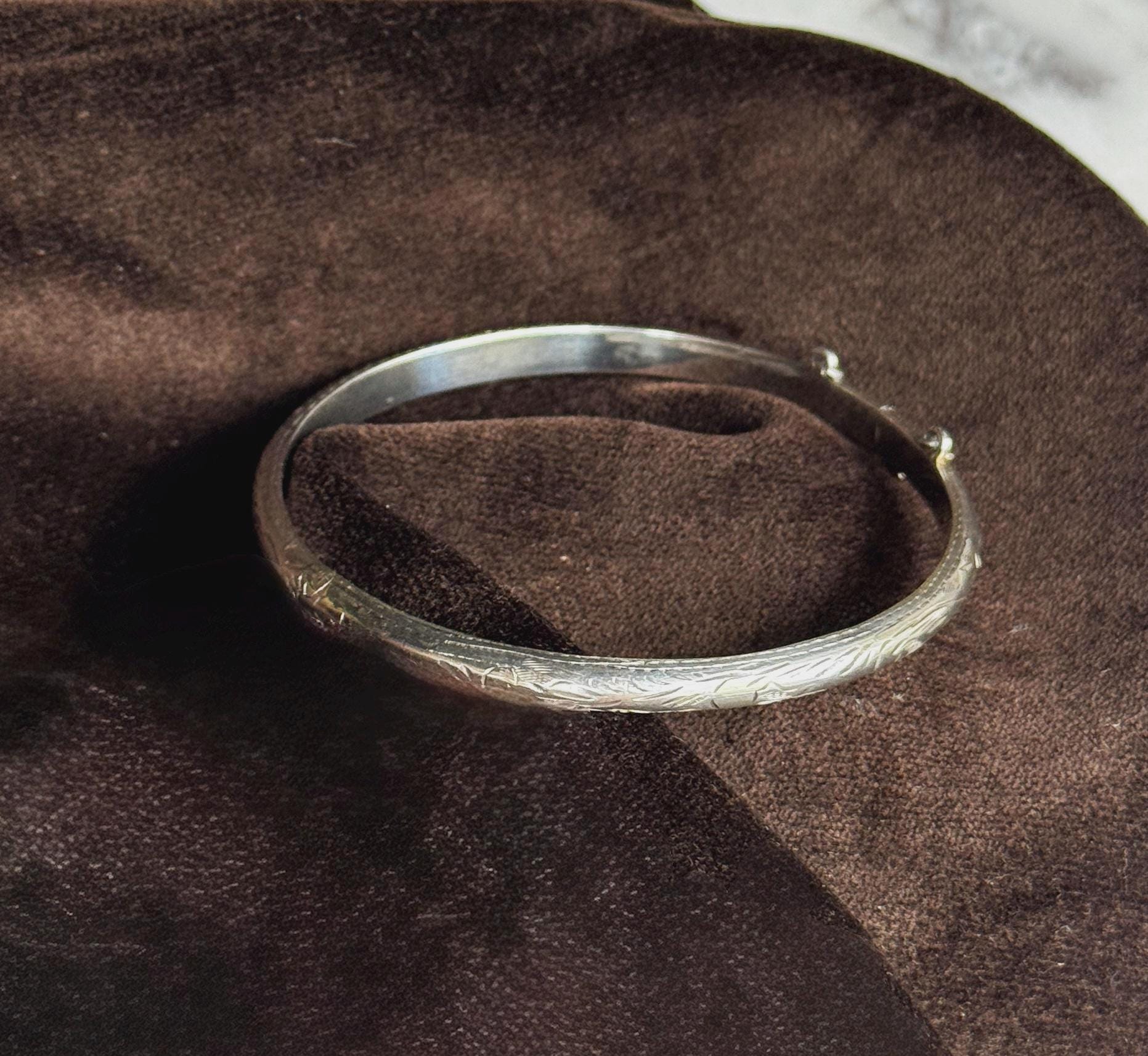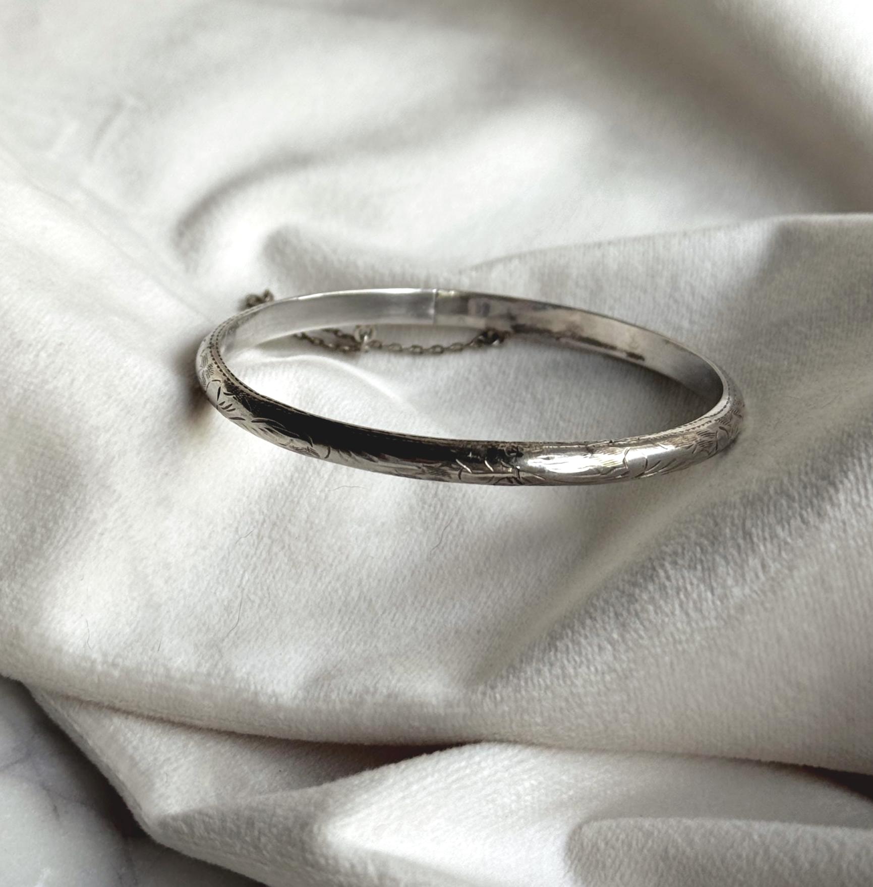 A classic sterling silver hinged bangle with a hand-etched floral design. This piece has a safety chain attached and opens and closes with ease. It's a very pretty piece that will add interest to a stack, or create a look on its own.