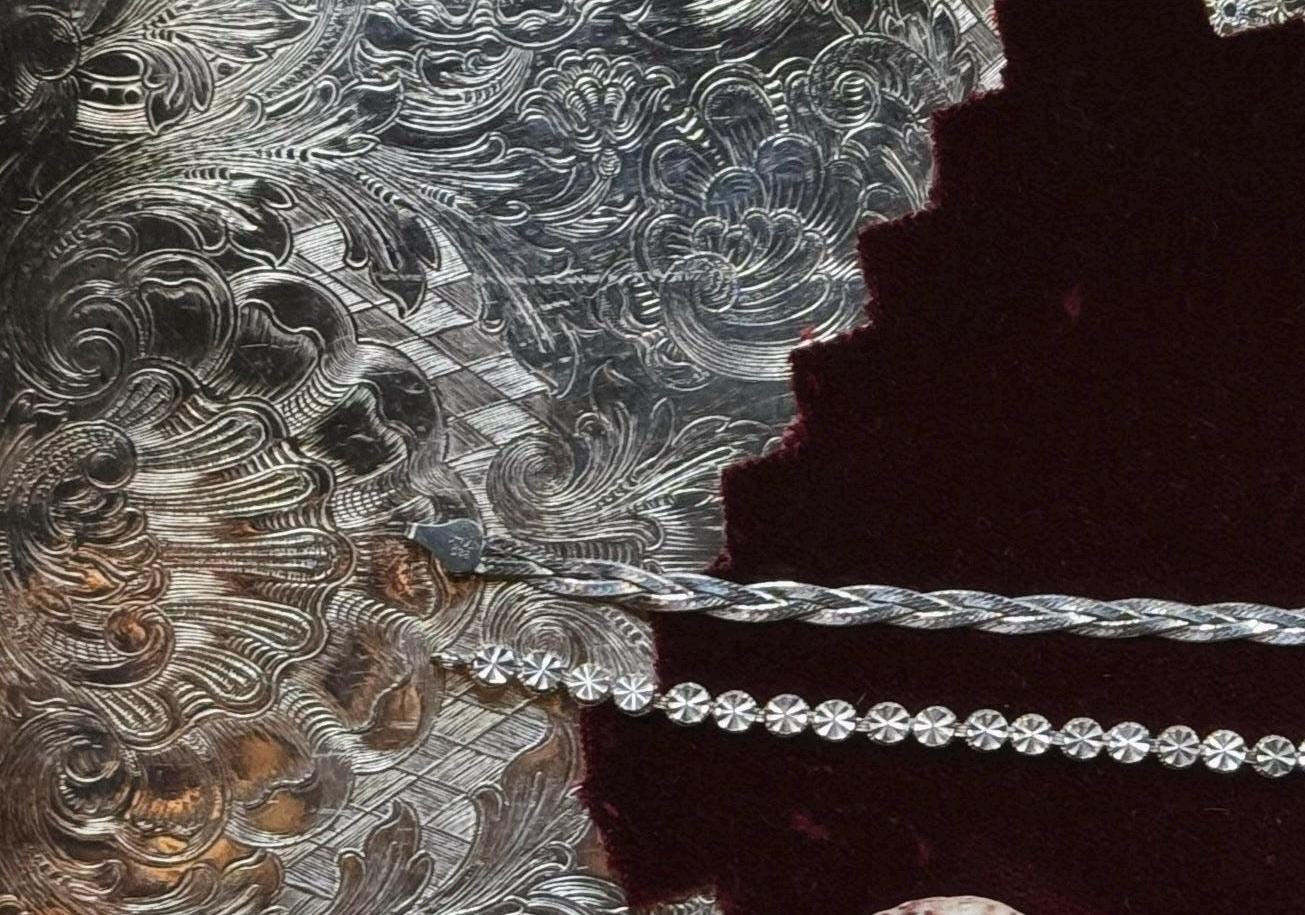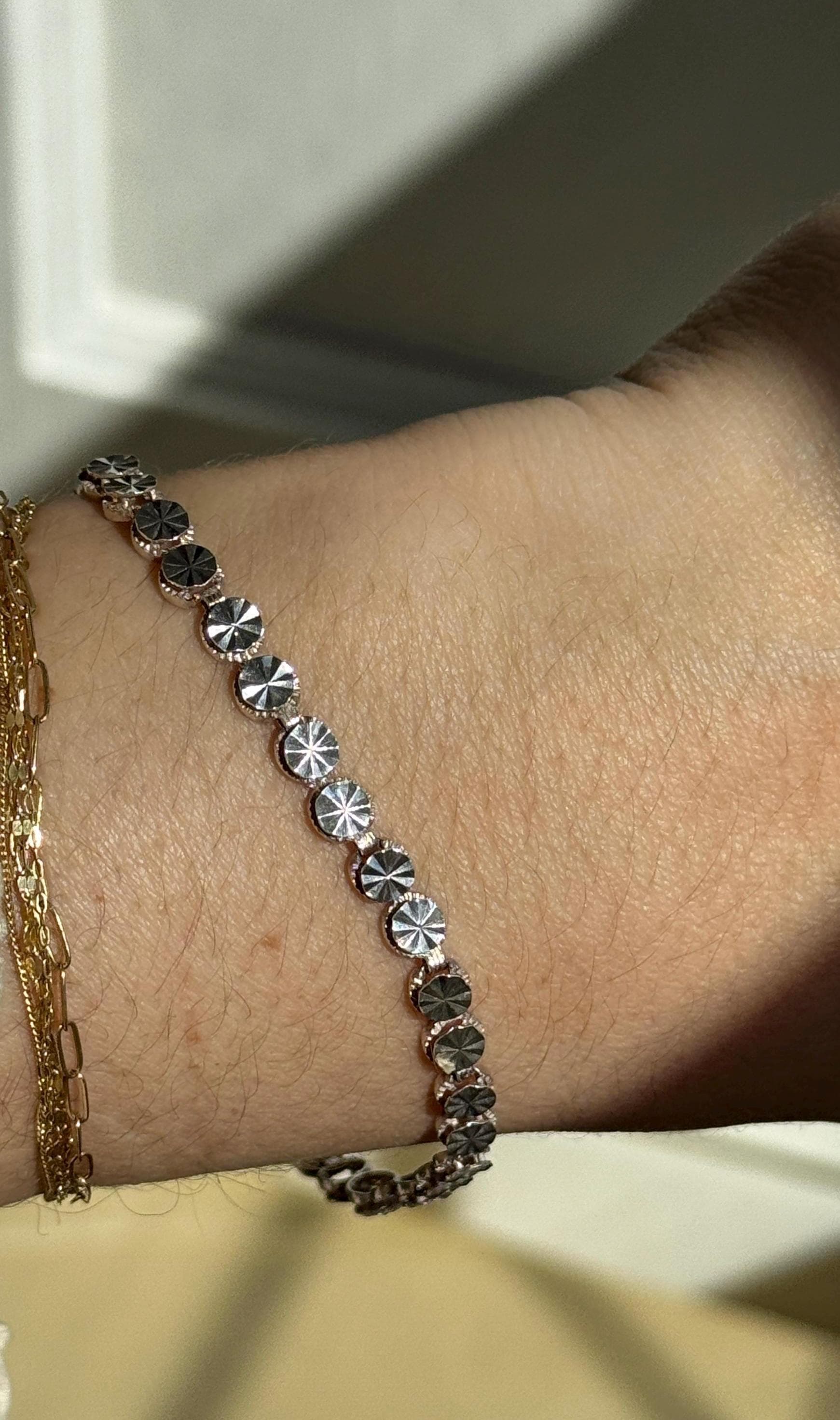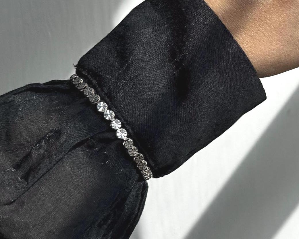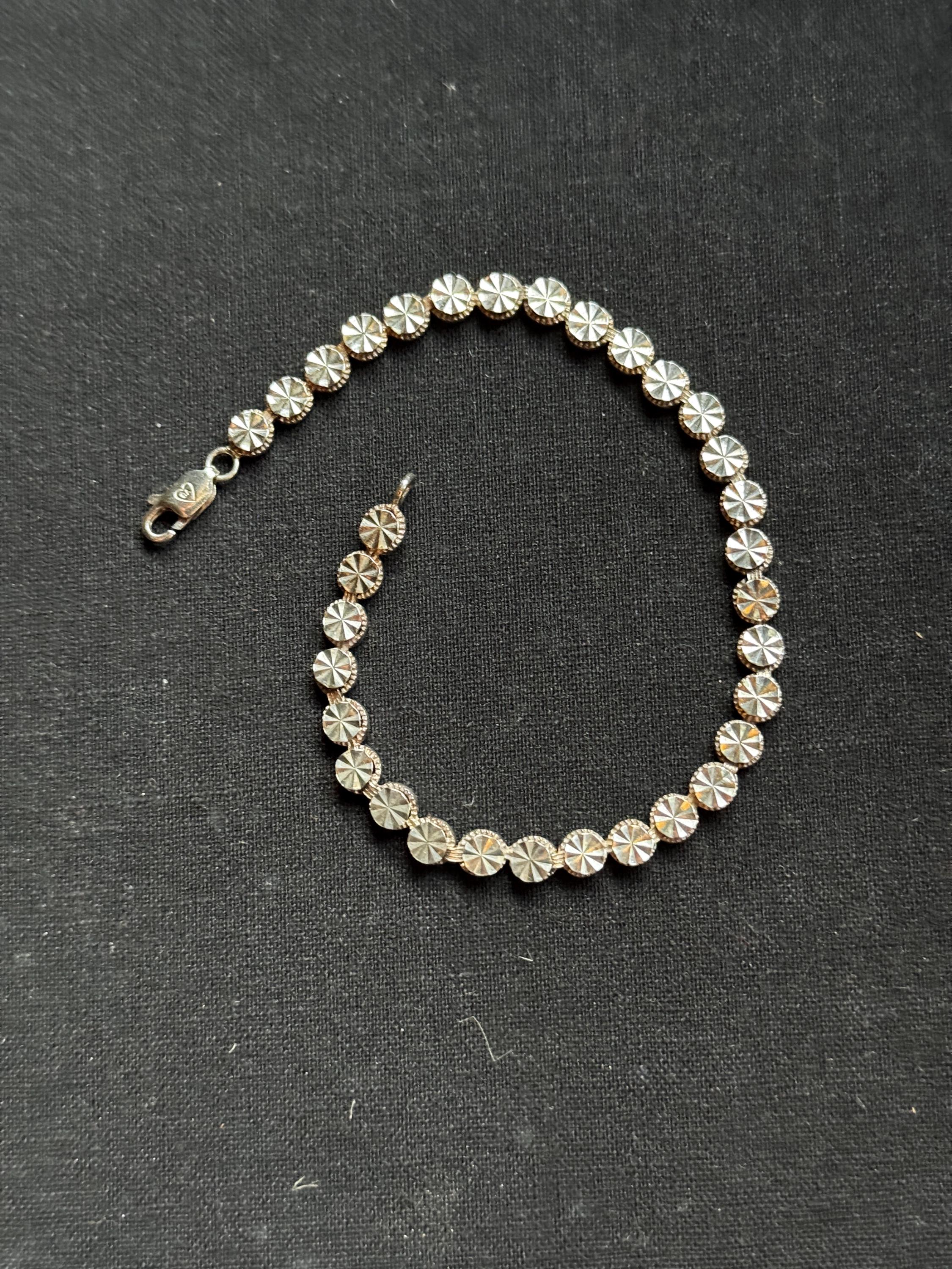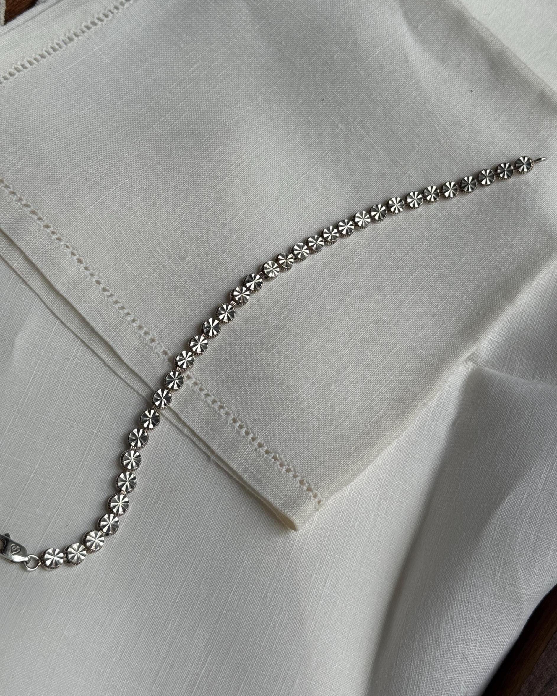 A vintage sterling silver bracelet with little starburst-shaped links that glisten in the light. Measures at approximately 7 inches.