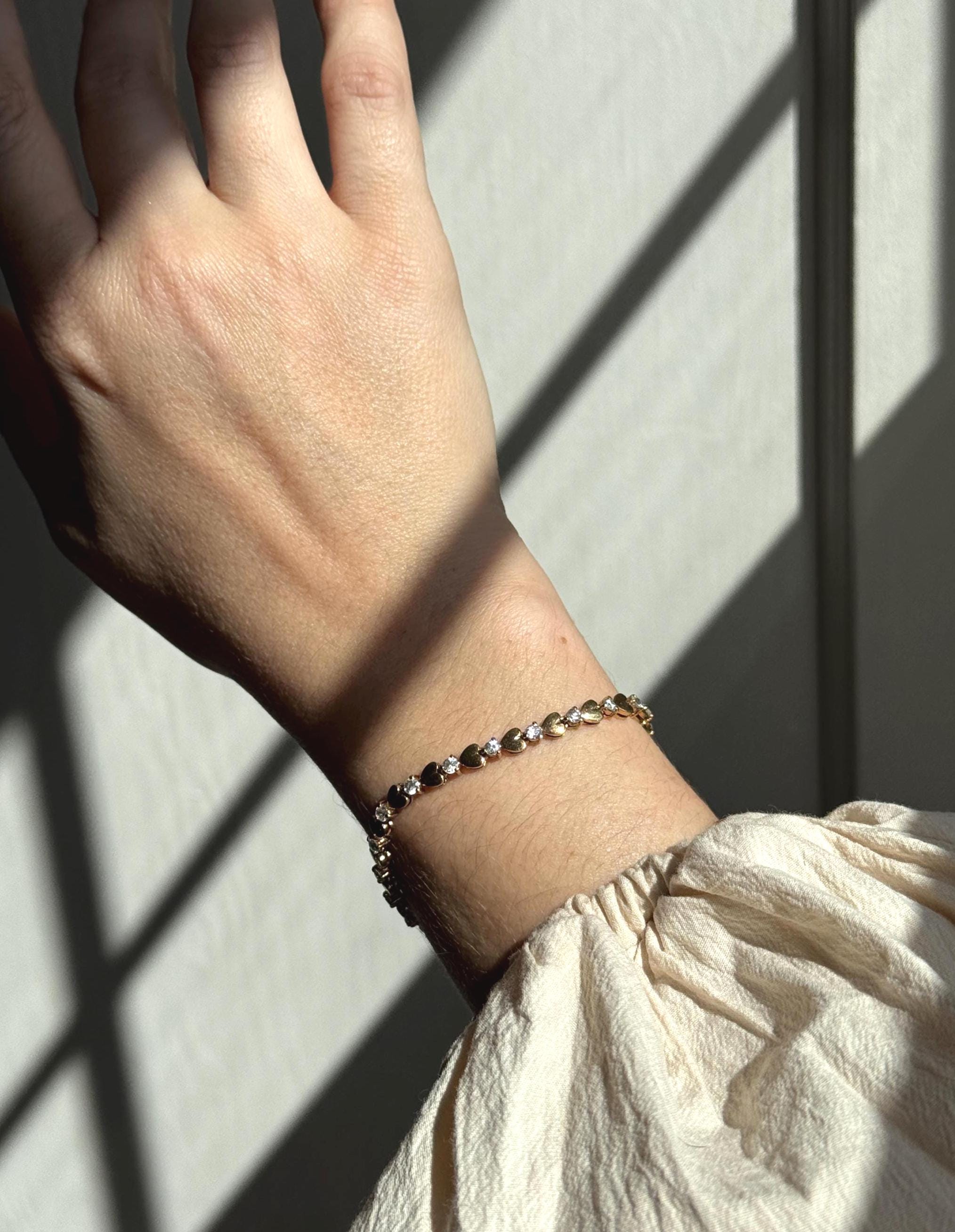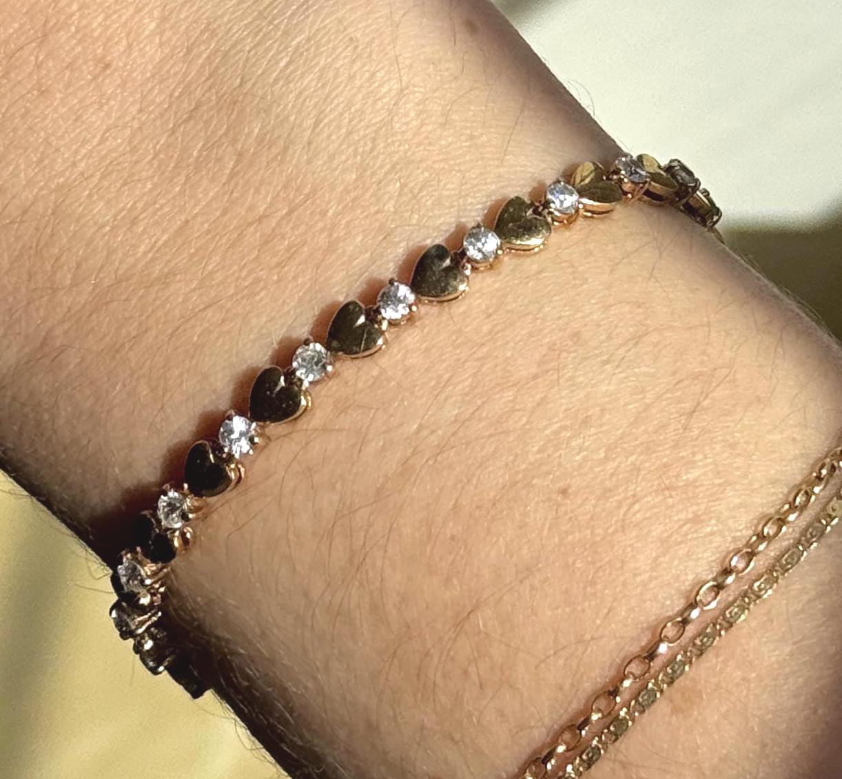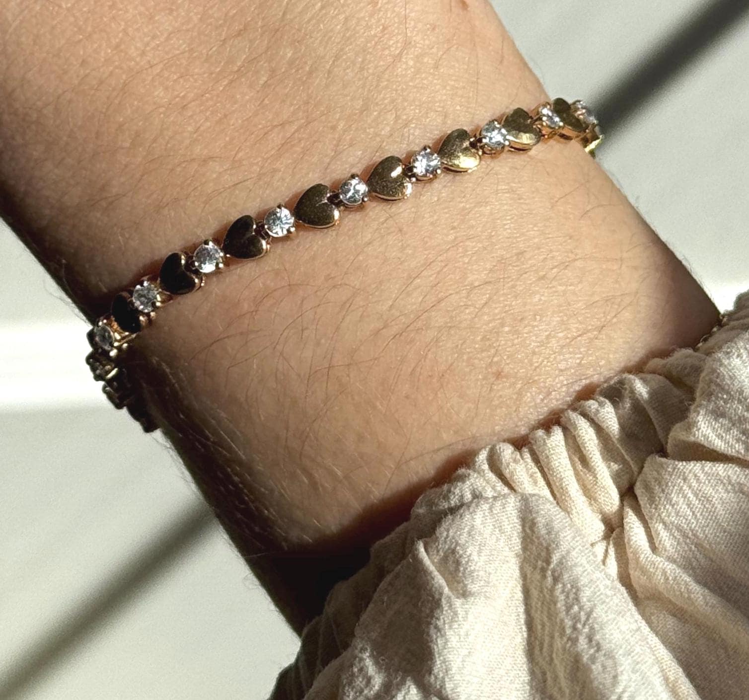 A darling 925 gold vermeil (gold over sterling silver) tennis bracelet. Alternating hearts and gemstones, this bracelet is such a sweet addition to any collection.