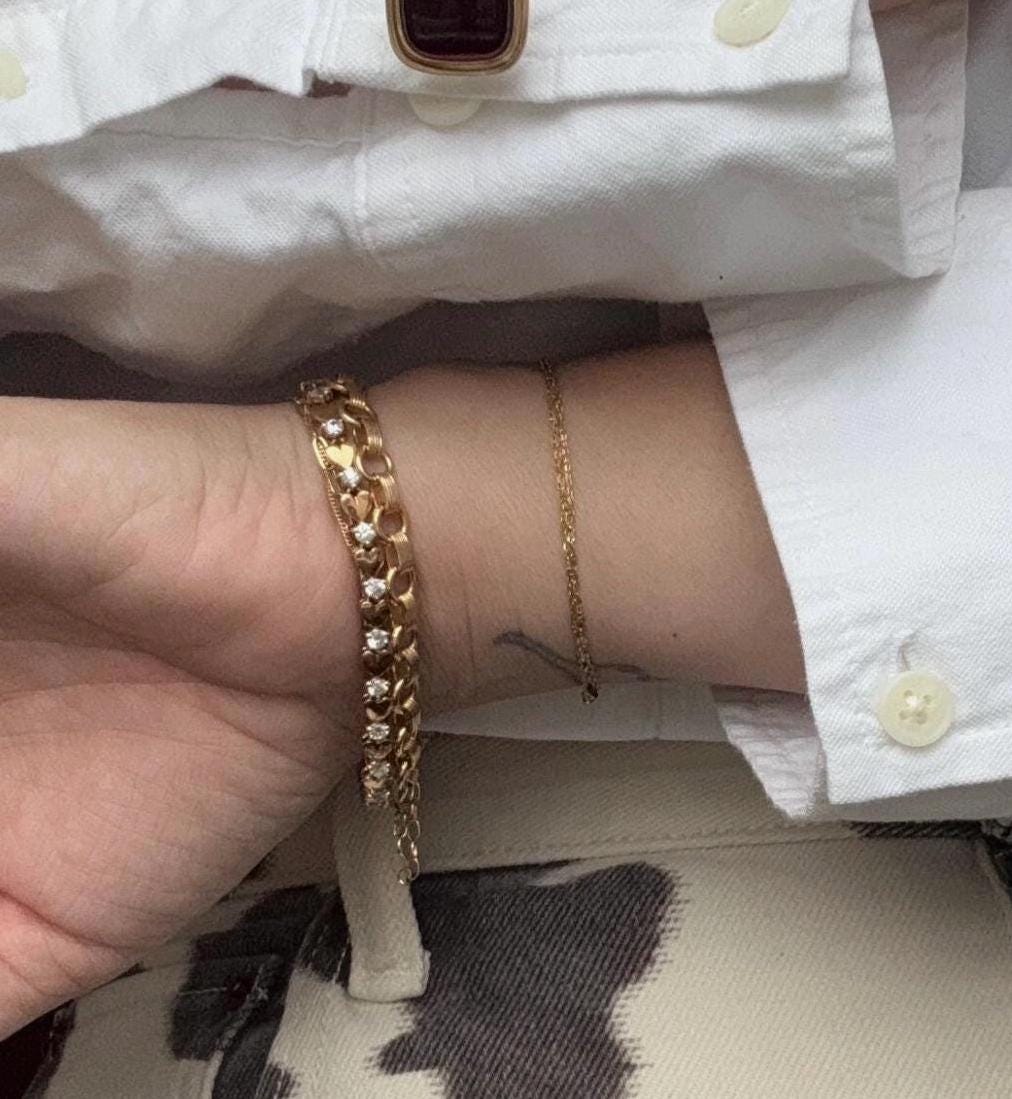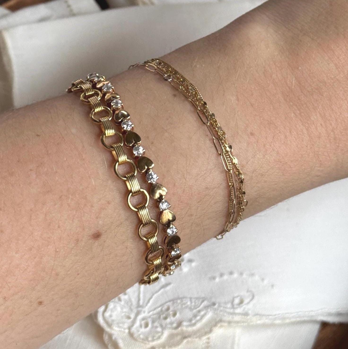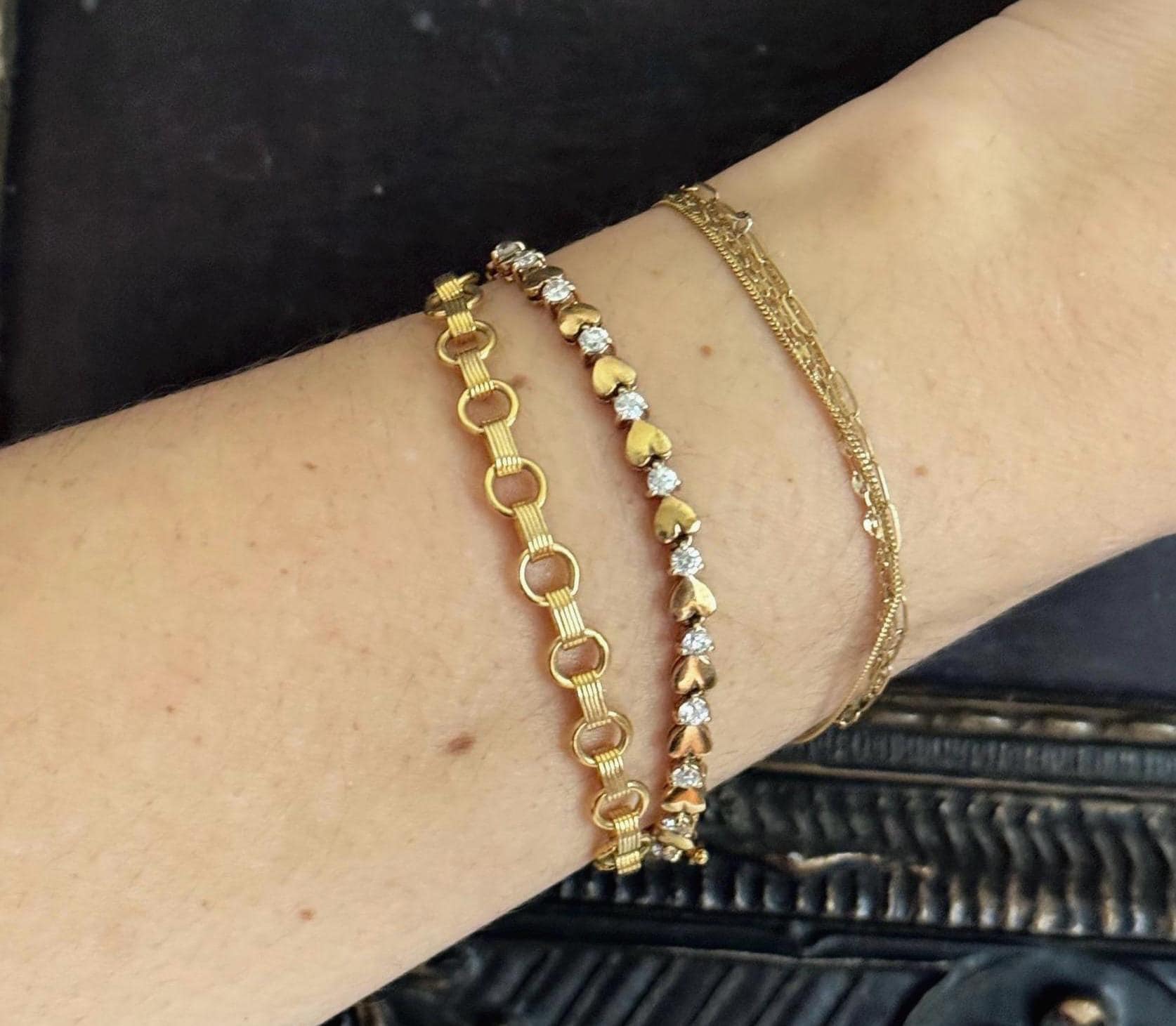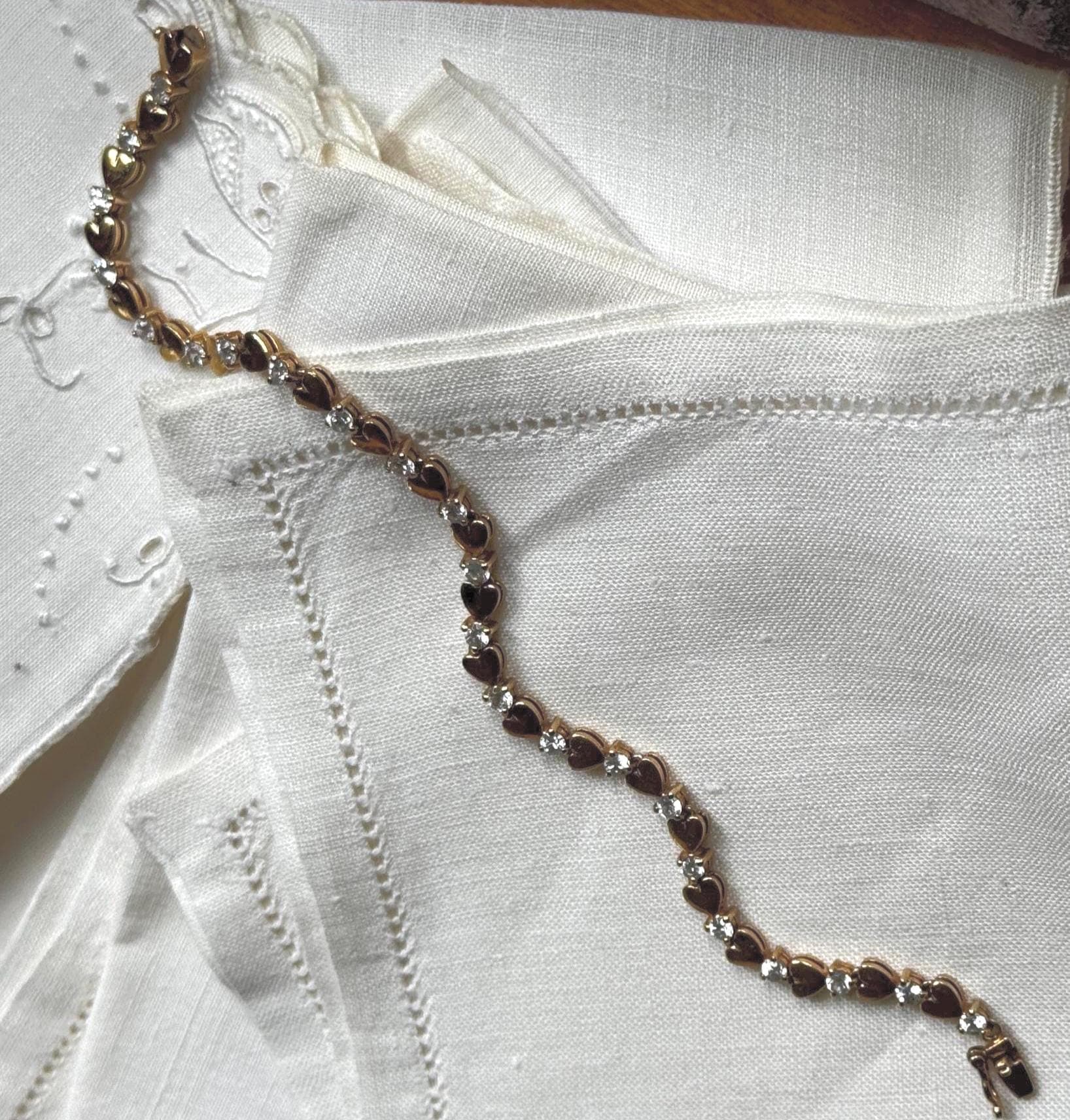 A darling 925 gold vermeil (gold over sterling silver) tennis bracelet. Alternating hearts and gemstones, this bracelet is such a sweet addition to any collection.