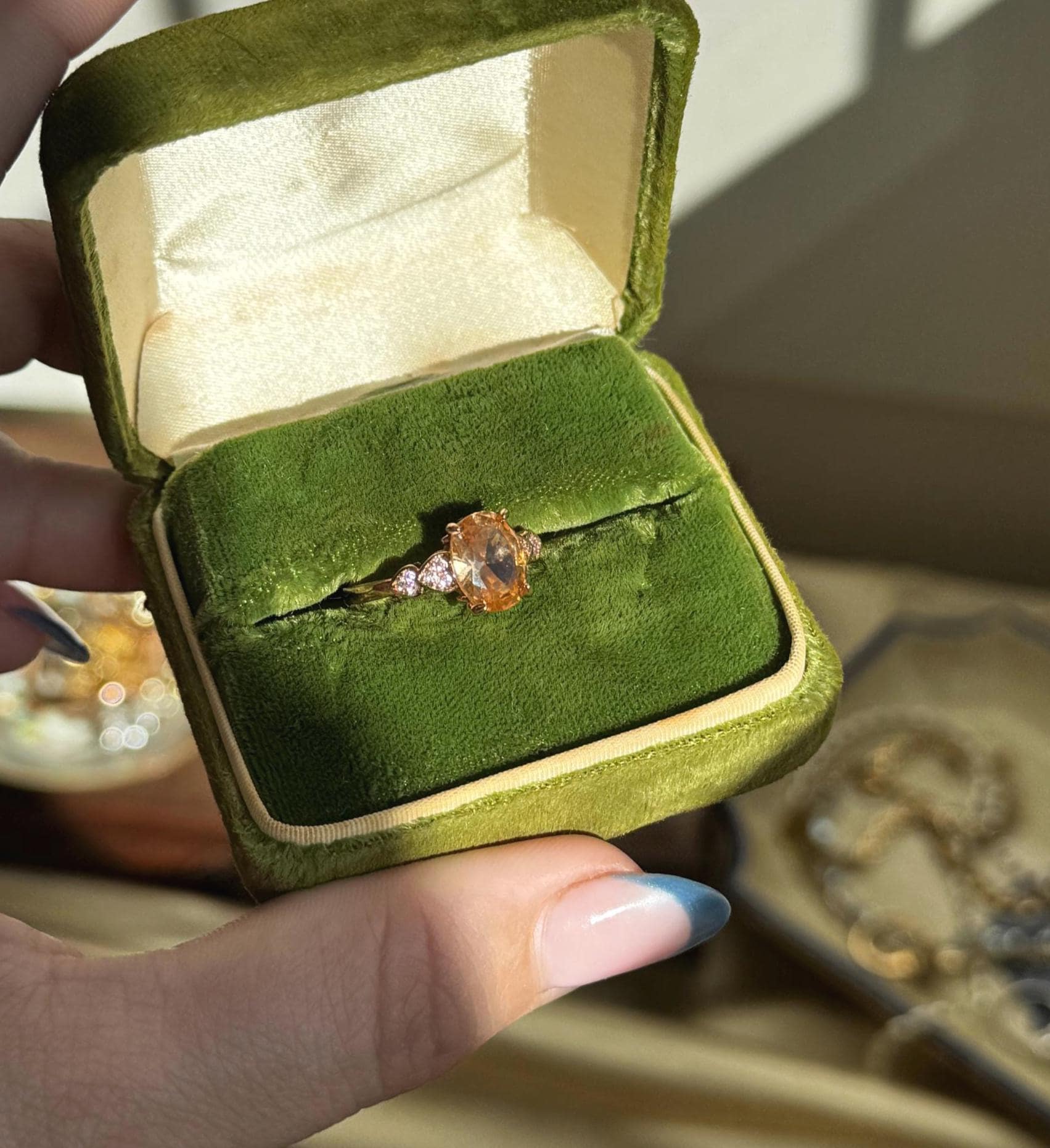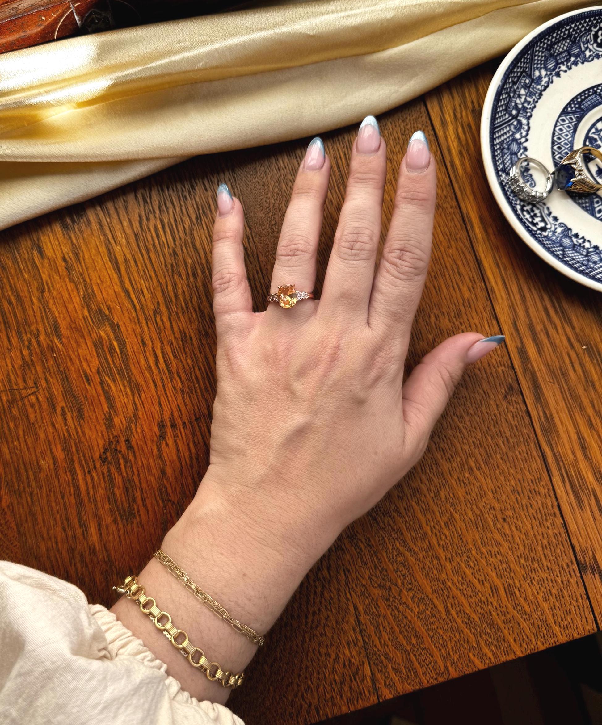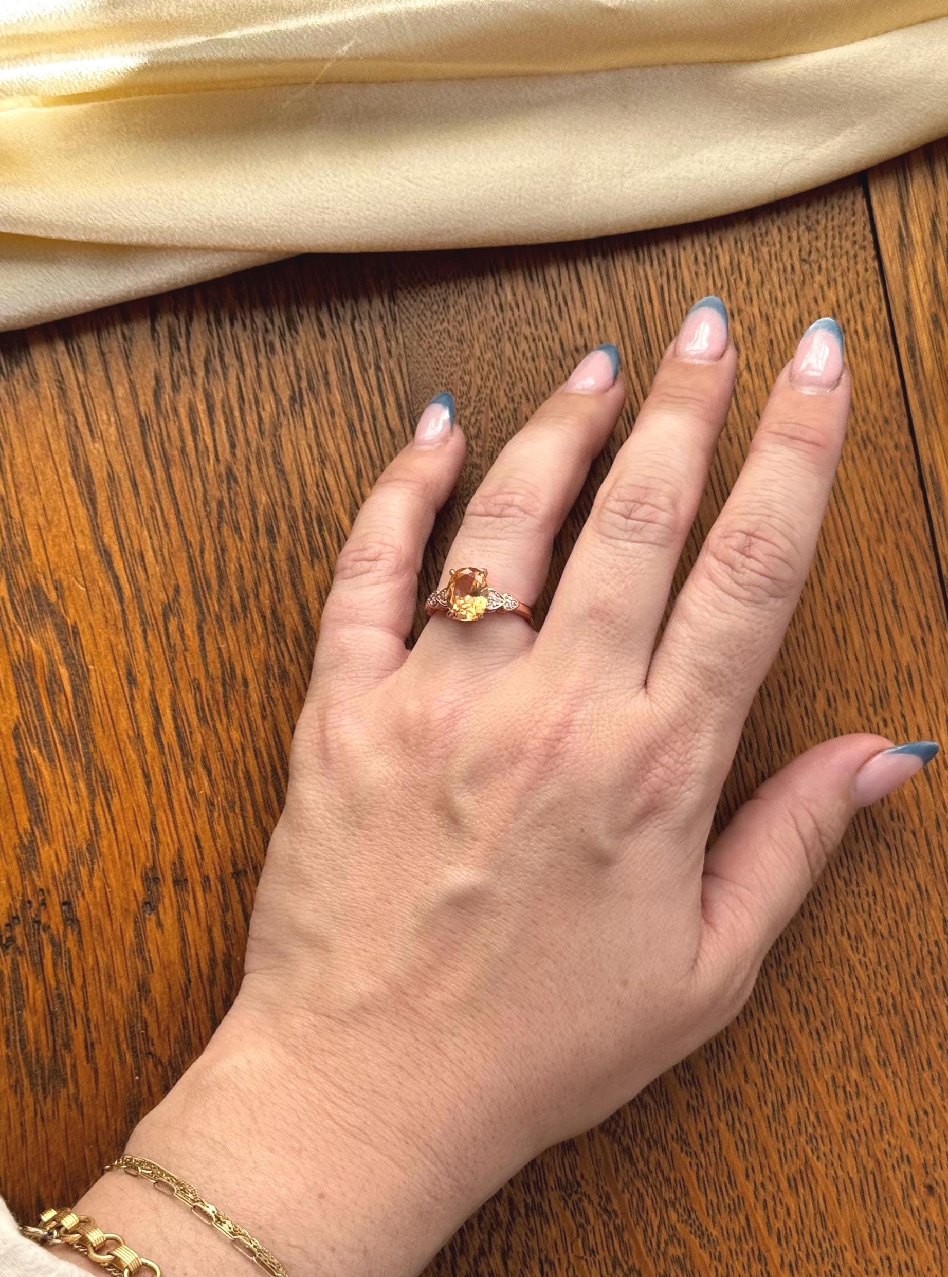 A peachy keen 925 Rose Gold Vermeil (rose gold over sterling silver) cocktail ring featuring a very pretty oval Morganite center stone, flanked by simulated diamonds on each shoulder.