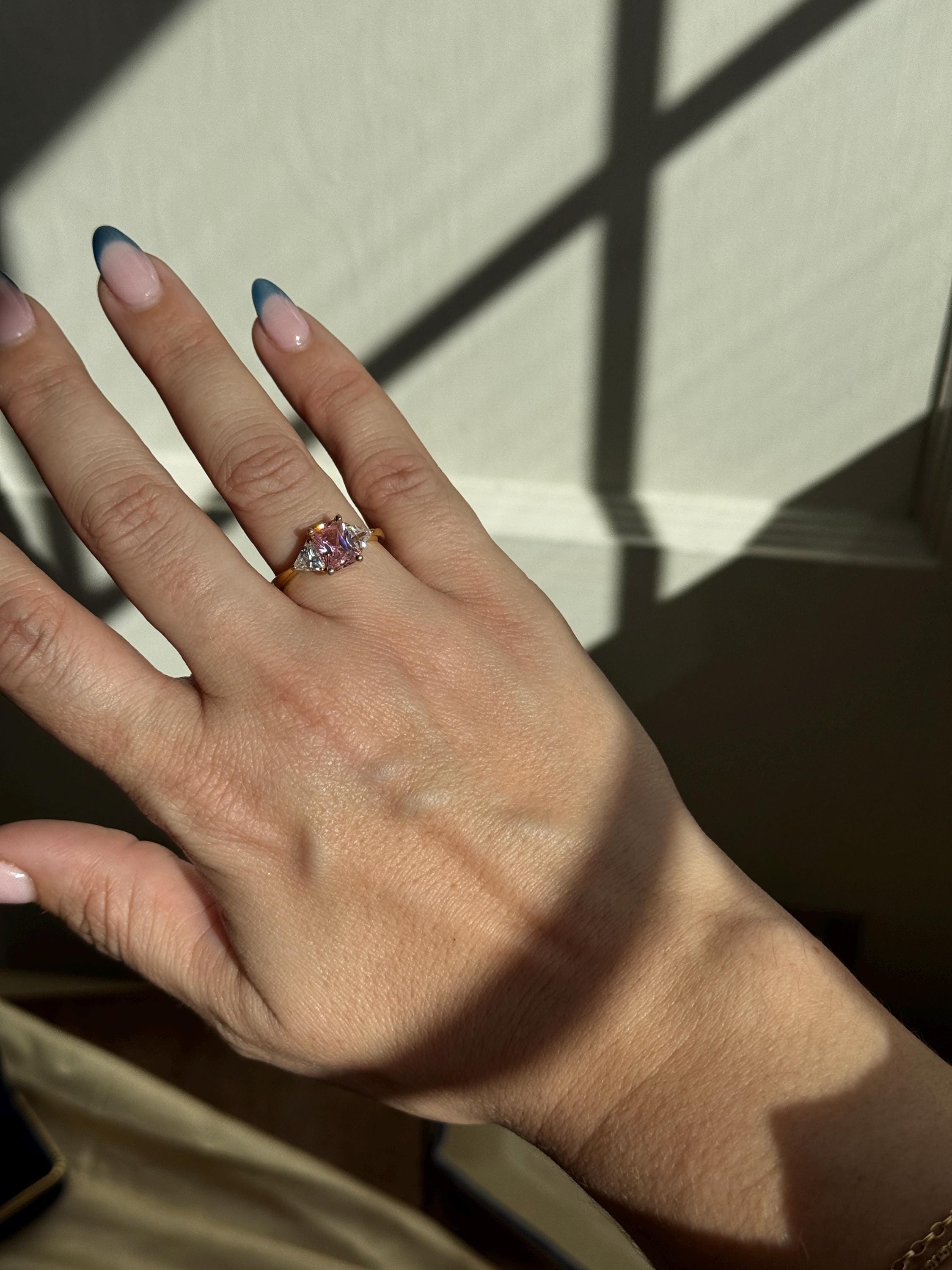 This is a super cute vintage gold-tone cocktail ring. The center stone is a vibrant pink and catches light in all the right ways. This ring has been loved before and is ready to be loved again, but please expect some signs of wear. This ring appears to be gold-filled but is not marked, there are some signs of wear on the bottom of the ring shank where the ring band would have experienced friction.
