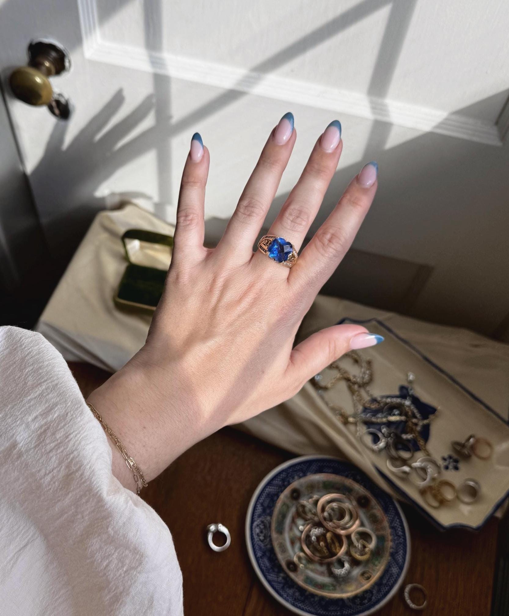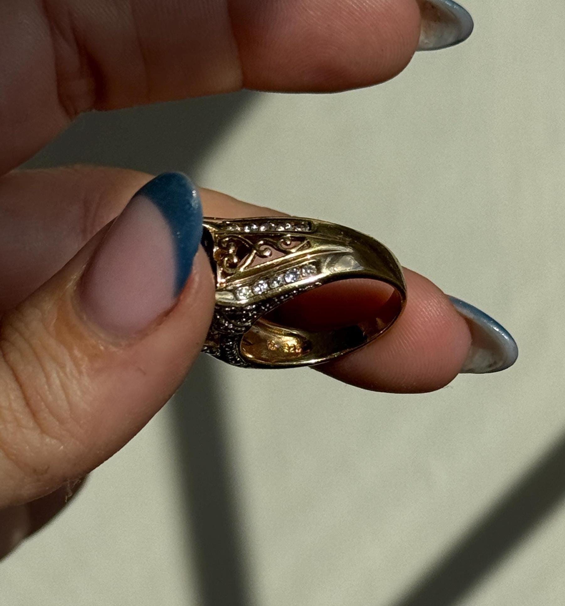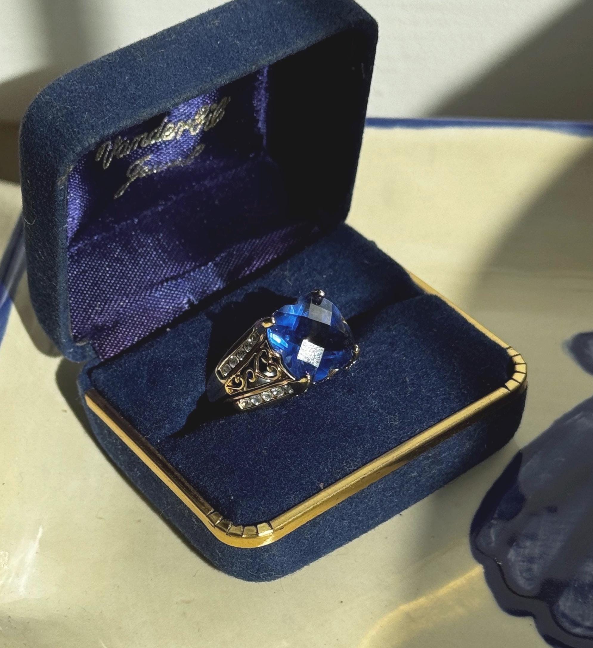 This is a very fun 925 sterling silver gold vermeil cocktail ring with a vibrant clover-shaped blue gem. Both shoulders feature filigree details and tiny cz accent stones. Hallmarks are present on the inside of the shank. Please reach out if you'd like more photos or videos.