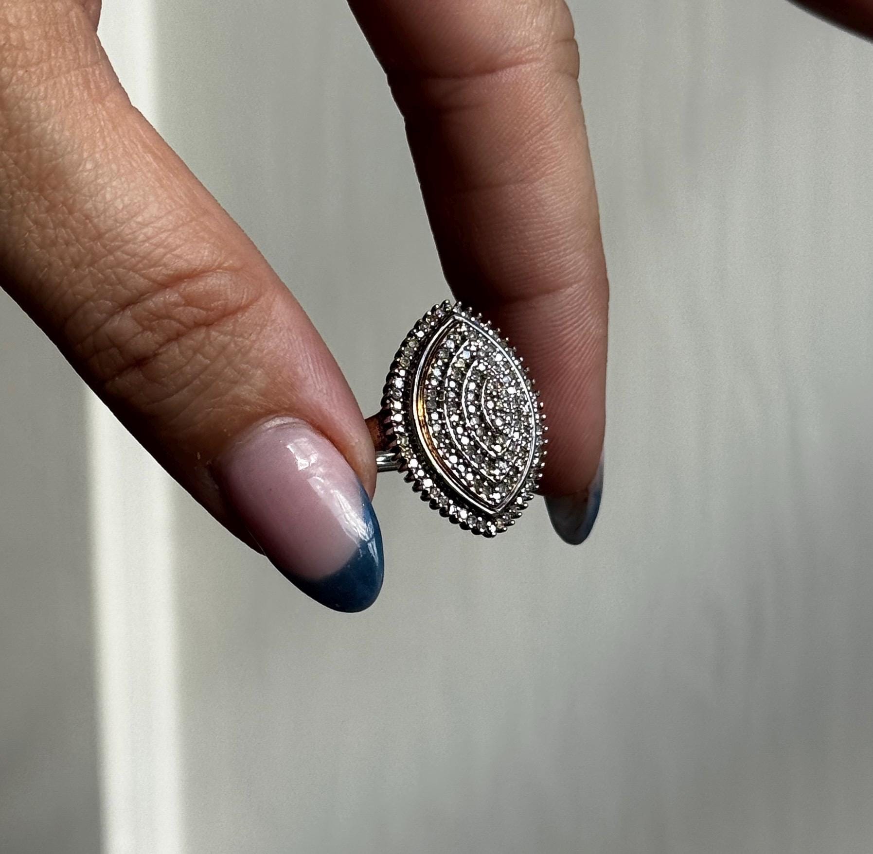 An absolutely *stunning* vintage 925 sterling silver and vermeil diamond chip navette-style ring. This ring is needs to come with a warning: if you wear it too long you will fall head over heels (unfortunately I learned this the hard way). This ring is a size 7, just weight-y enough, and holds a beautiful presence on the hand. The diamond chips catch the light perfectly and it has the loveliest vermeil detail. This ring is vintage so please expect some signs of wear, but other than some typical silver oxidization, I'd say this ring is in perfect condition. Please don't hesitate to reach out if you'd like more photos or videos.
