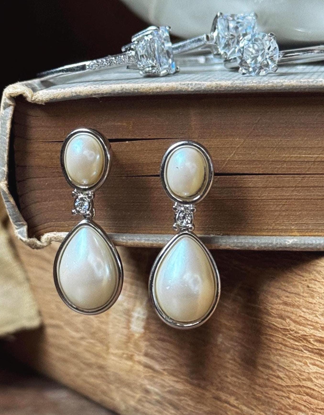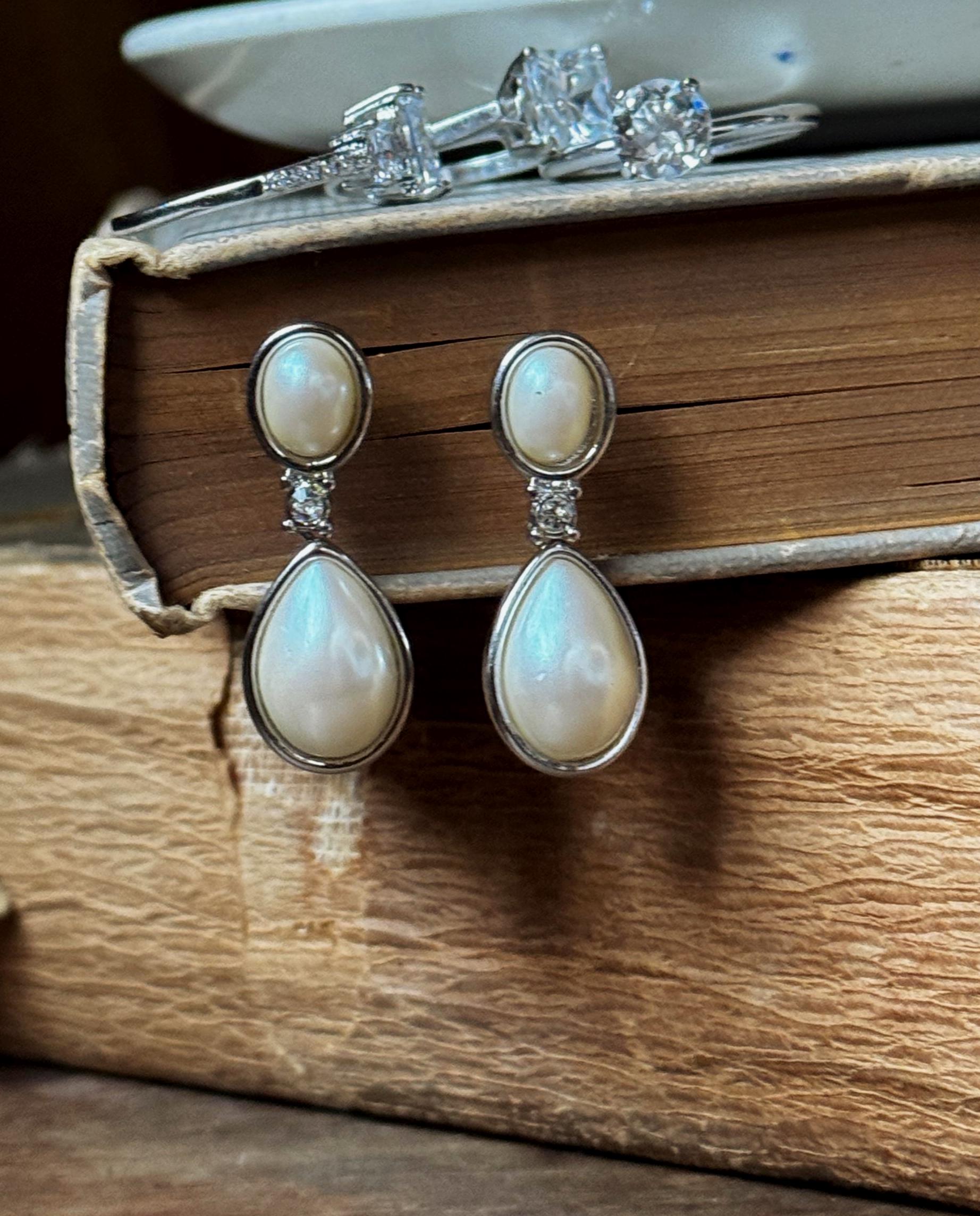 A great pair of vintage simulated pearl and clear stone silver-tone earrings by the brand Monet. Vintage from likely the 80s.