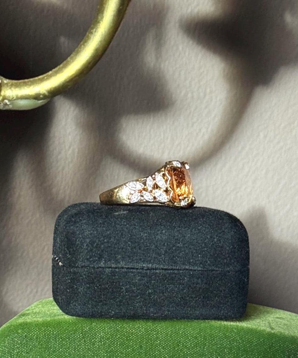 A juicy, bright, peachy center CZ stone held in a 925 gold vermeil (gold plated sterling silver) ring setting with leaves of CZ gemstones on the shoulders of the shank. A perfect ring to add some sparkles to any occasion.