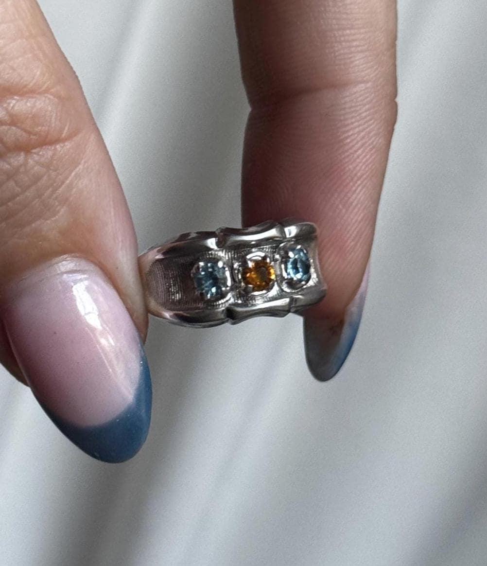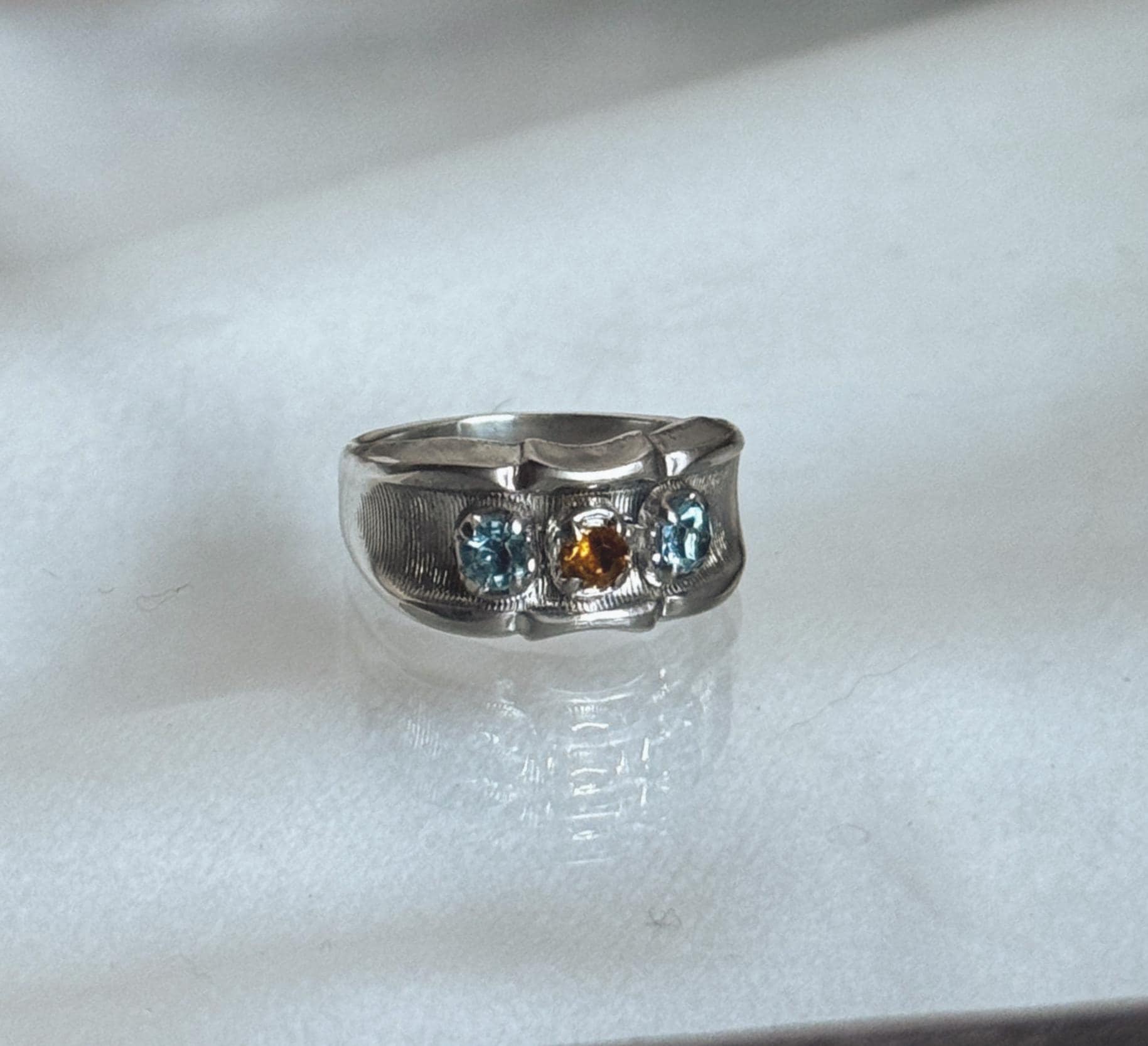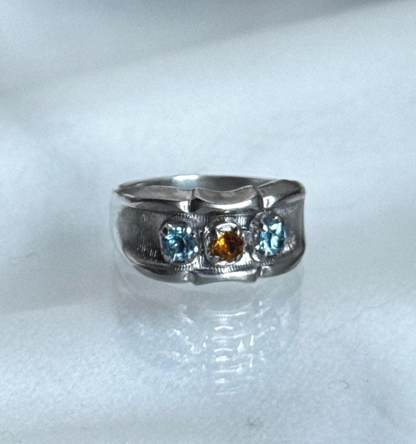 A darling vintage sterling silver ring featuring three stones, assumably blue topaz and citrine (possibly colored CZ, they have not been tested). These rings were popular in the 1960s and are known as Mother's Rings. Each of the stones would have represented a mother's child. The stones are screwed into each setting individually, allowing for quick and easy personalization by the jeweler selling each piece. The vibrant colors of these stones absolutely pop against the sterling silver, and the details on the ring band are whimsical, yet classic.