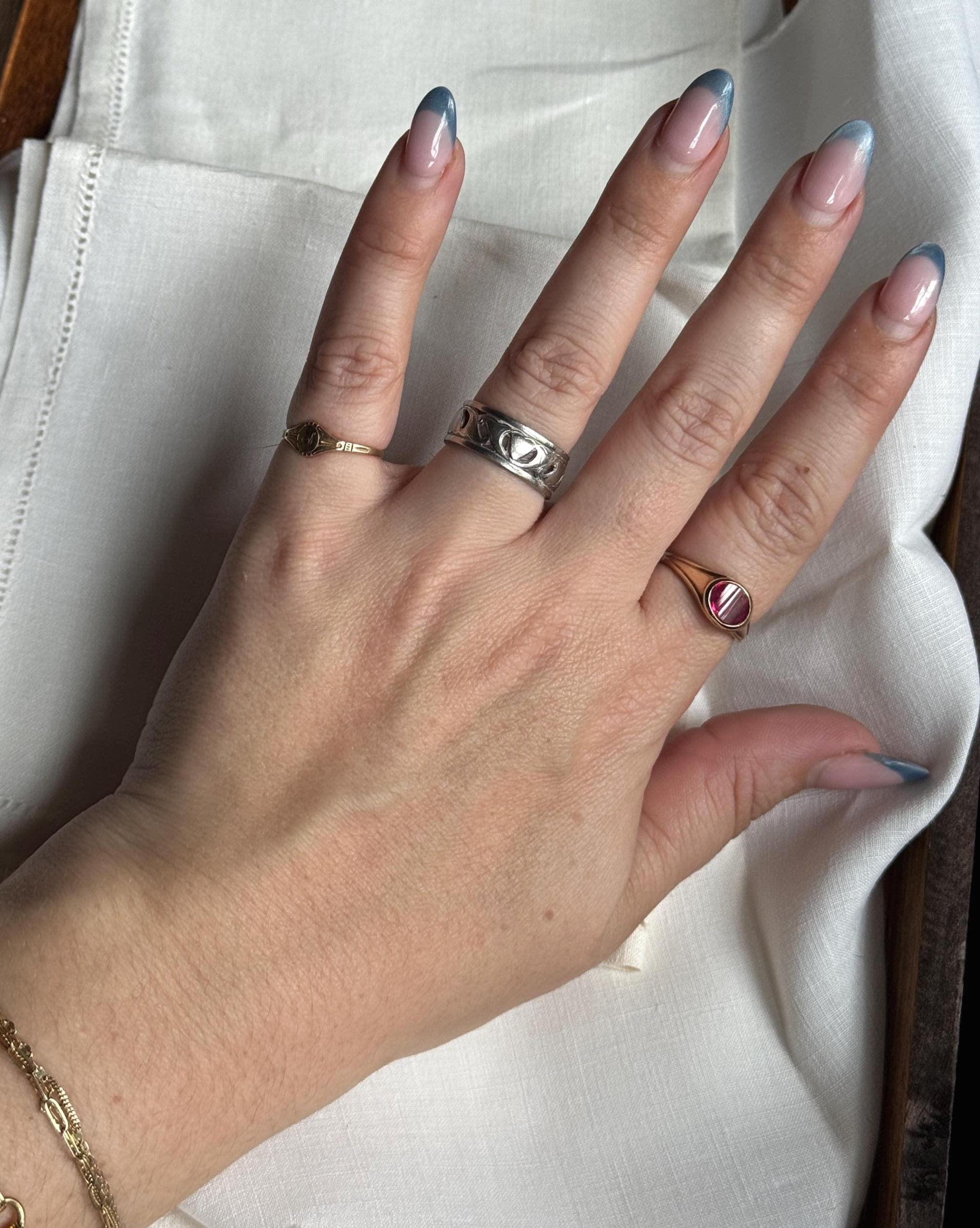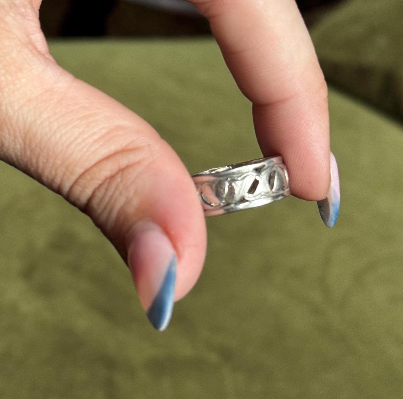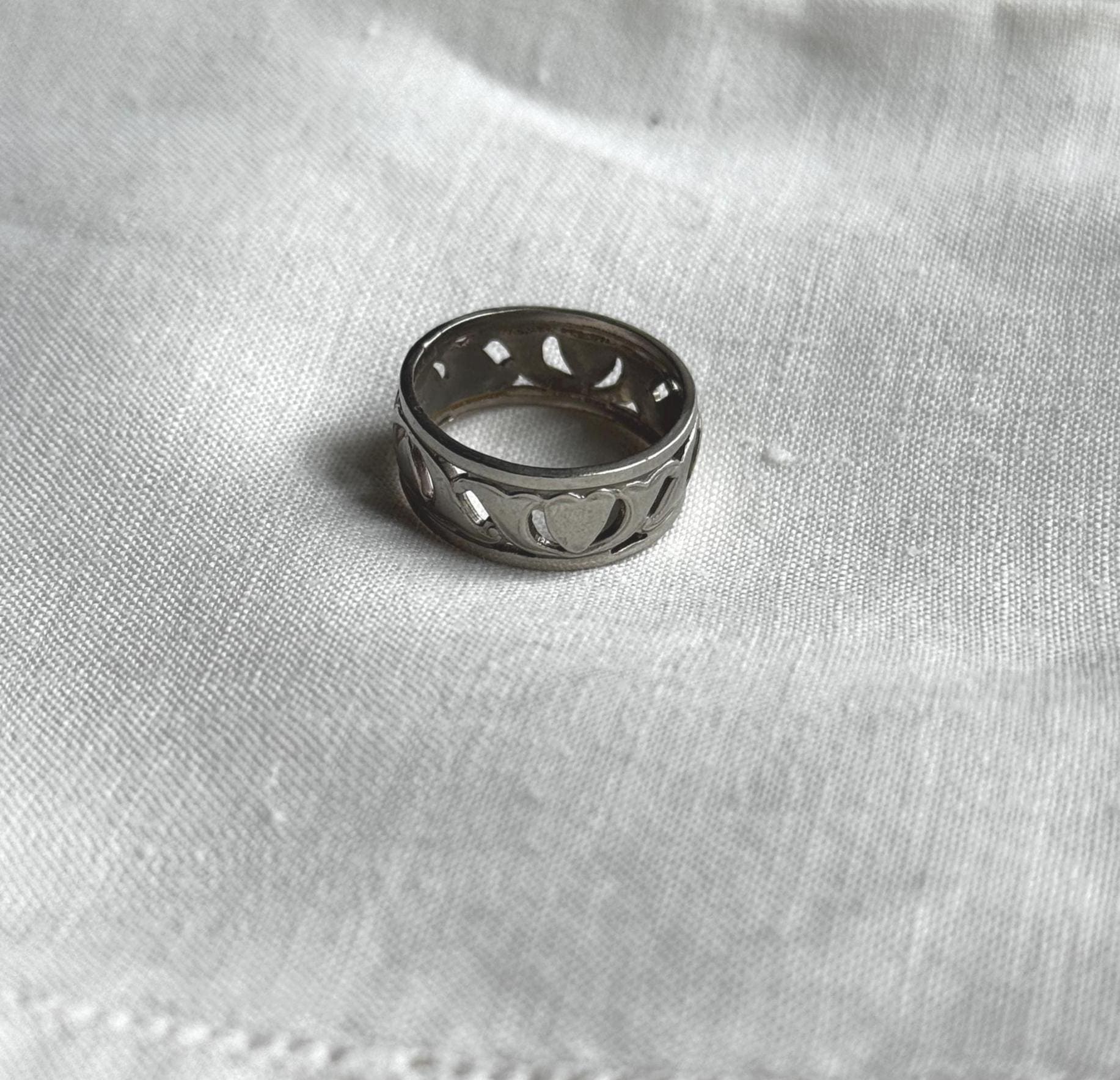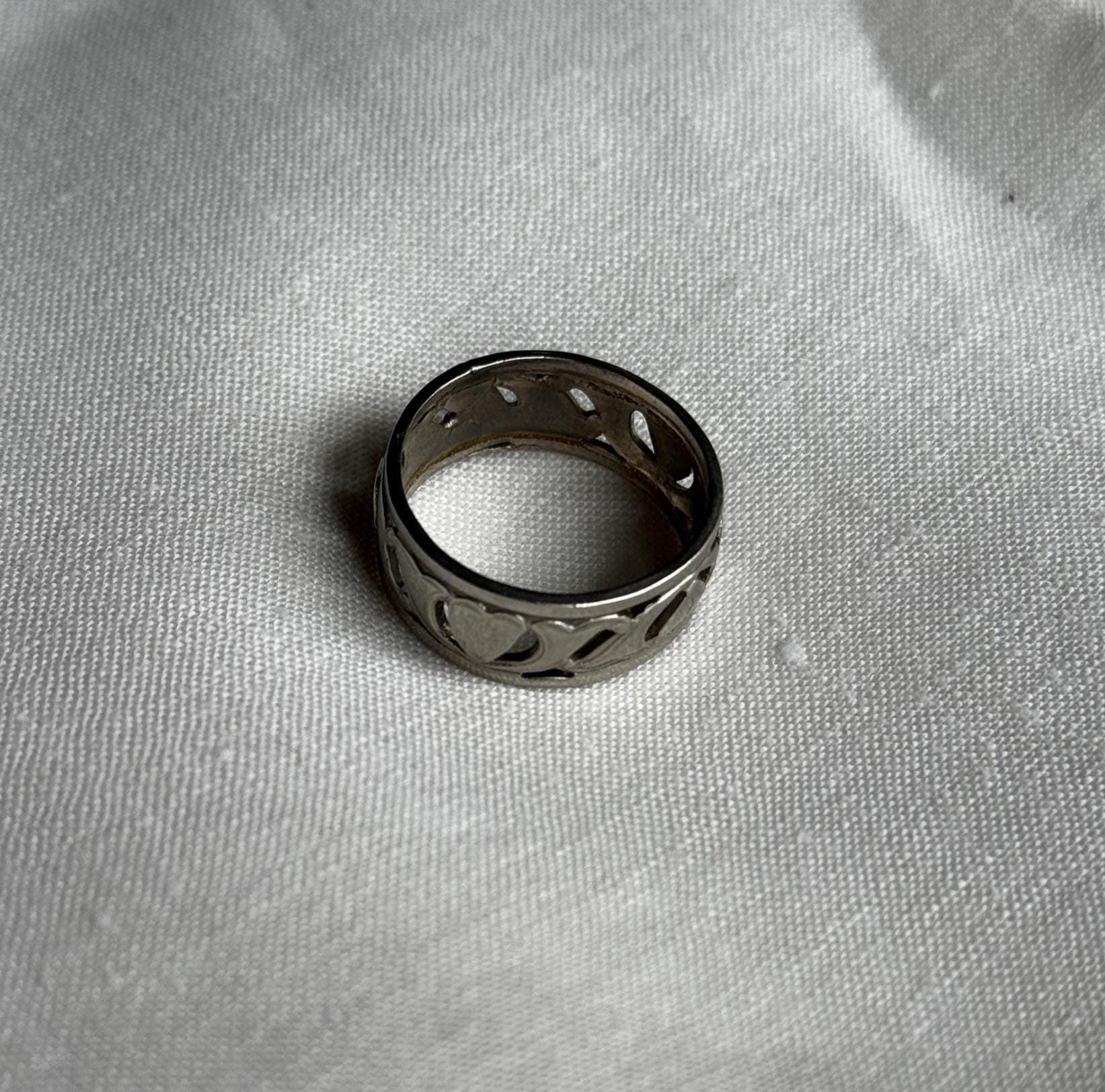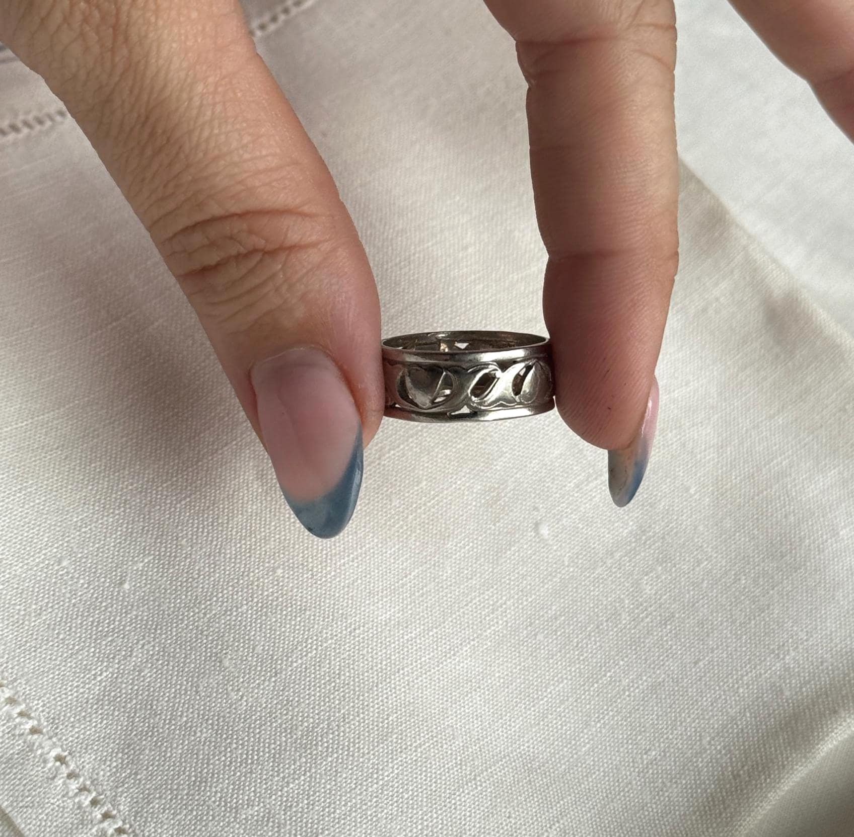 A very pretty sterling silver band with a cutout hearts and flourish motif design around. This ring is unmarked but has quite a bit of age to it! Based on my research, it is likely from the 1940s. This ring was clearly very loved and is ready to be loved and worn daily again.