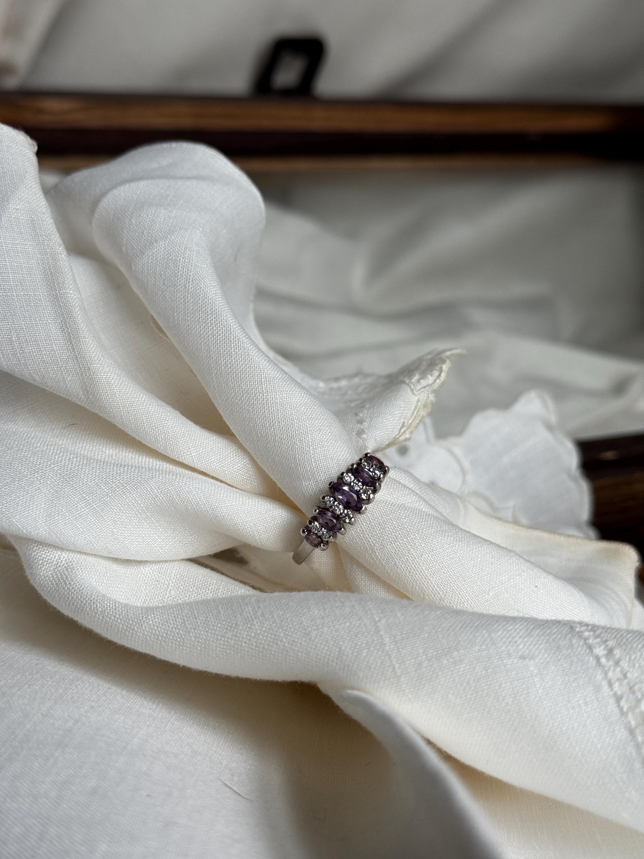 A gorgeous and sparkly 925 sterling silver ring featuring 5 marquise cut amethysts graduating in size, separated by tiny CZ stones. This is a gorgeous statement cocktail ring that would make a really lovely every day ring as well.