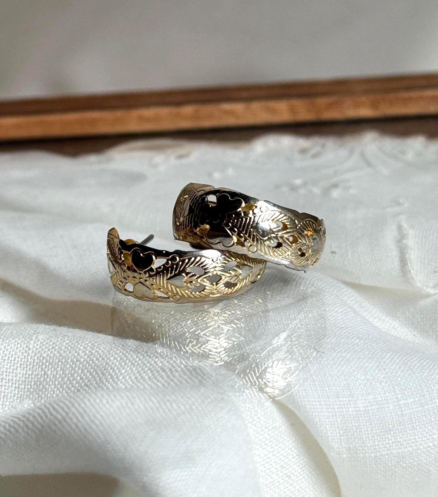 A pair of open-work filigree earrings with a pretty warm champagne-gold tone about them. These are dainty and lightweight and very pretty.