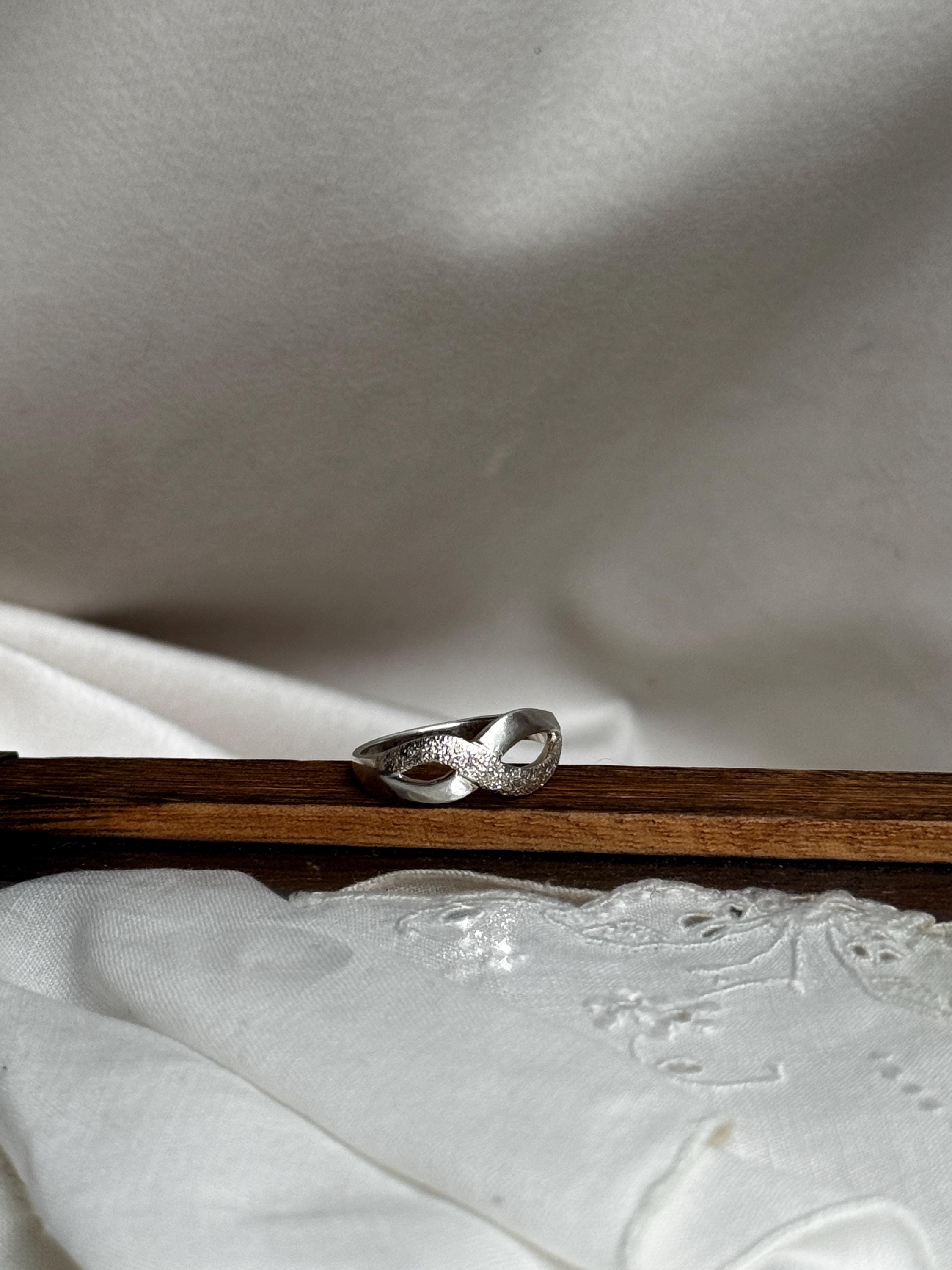 A darling sterling silver ring featuring a flourished infinity symbol featuring an accent of textured silver that adds some pretty dimension to the piece.
