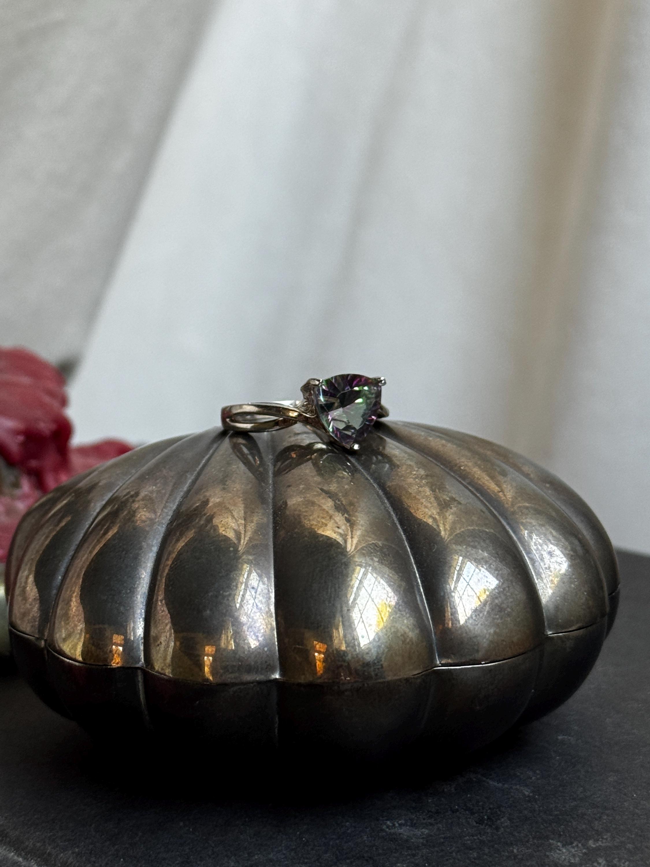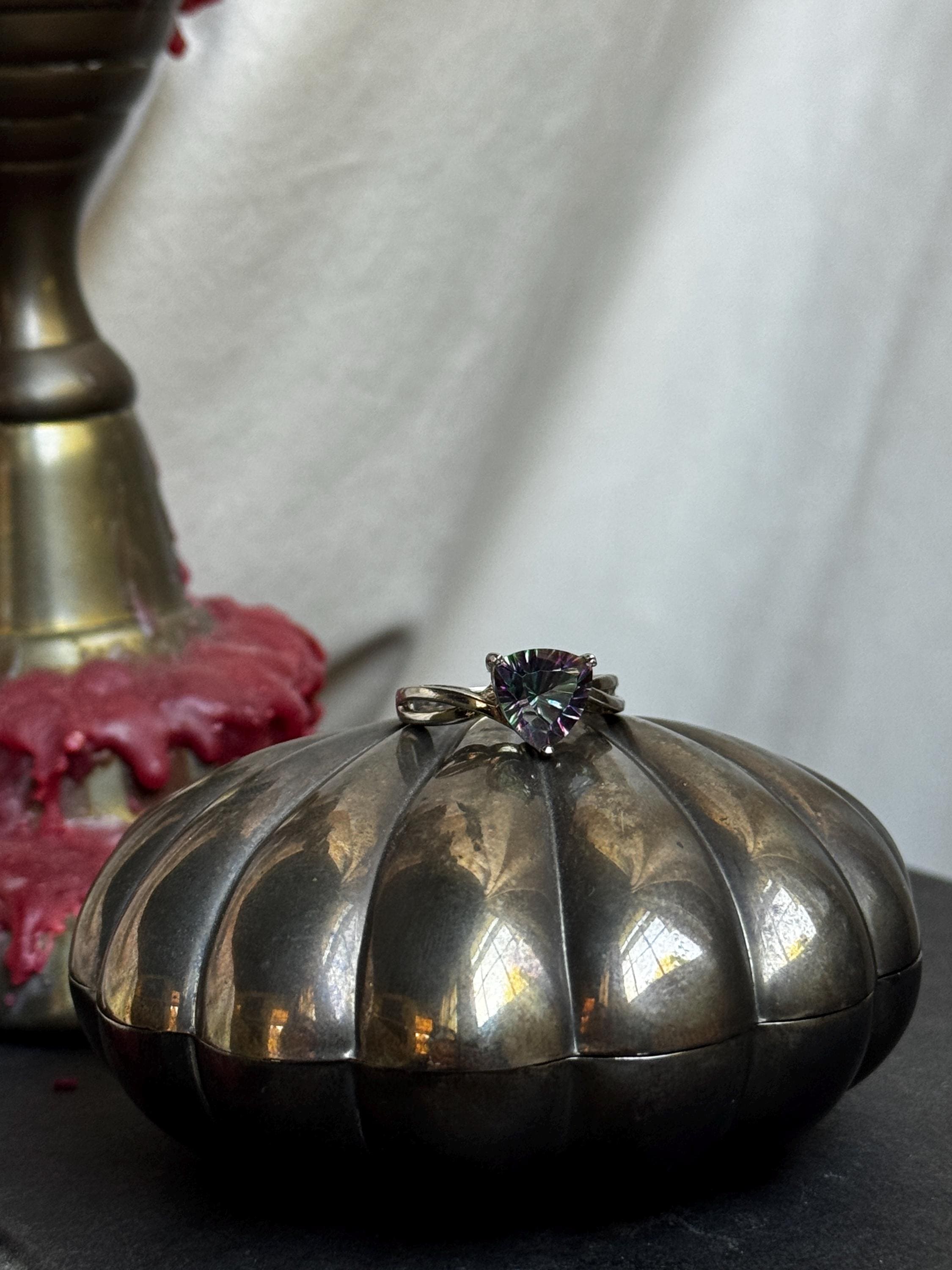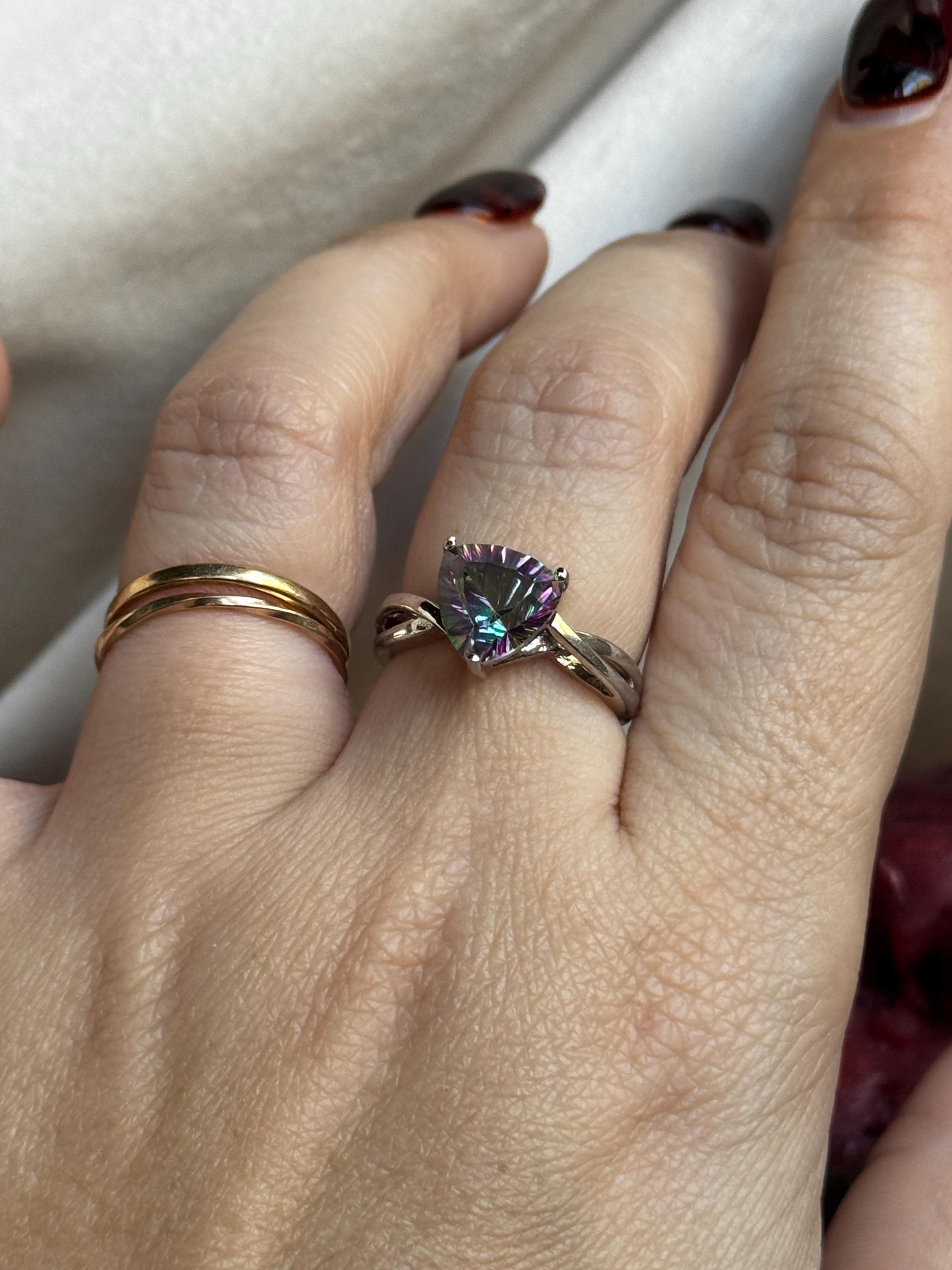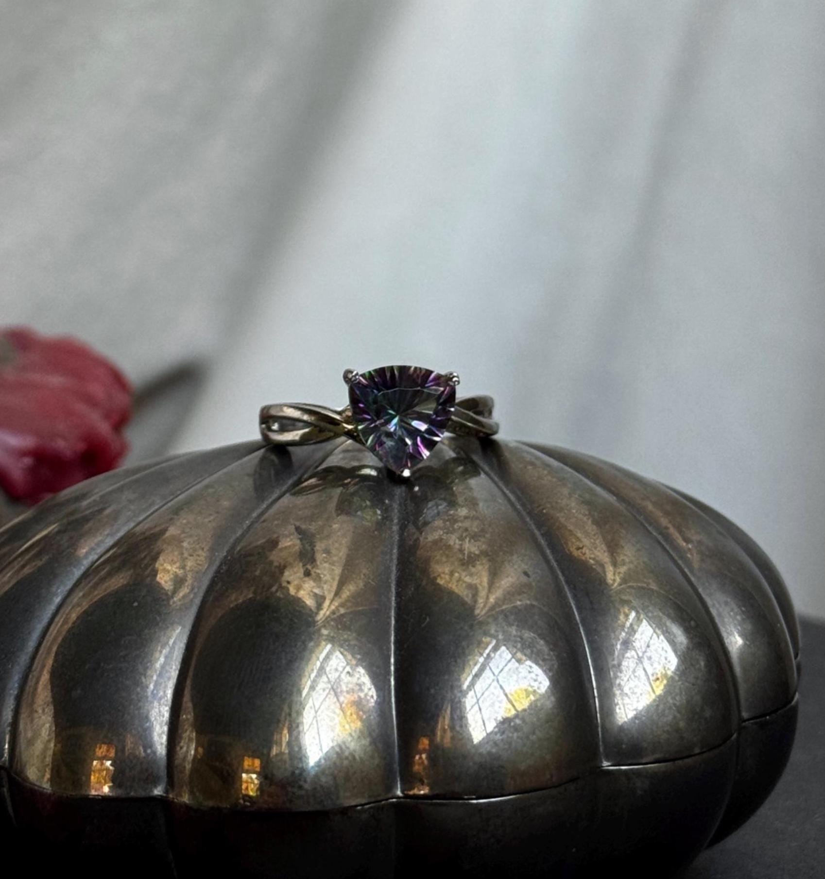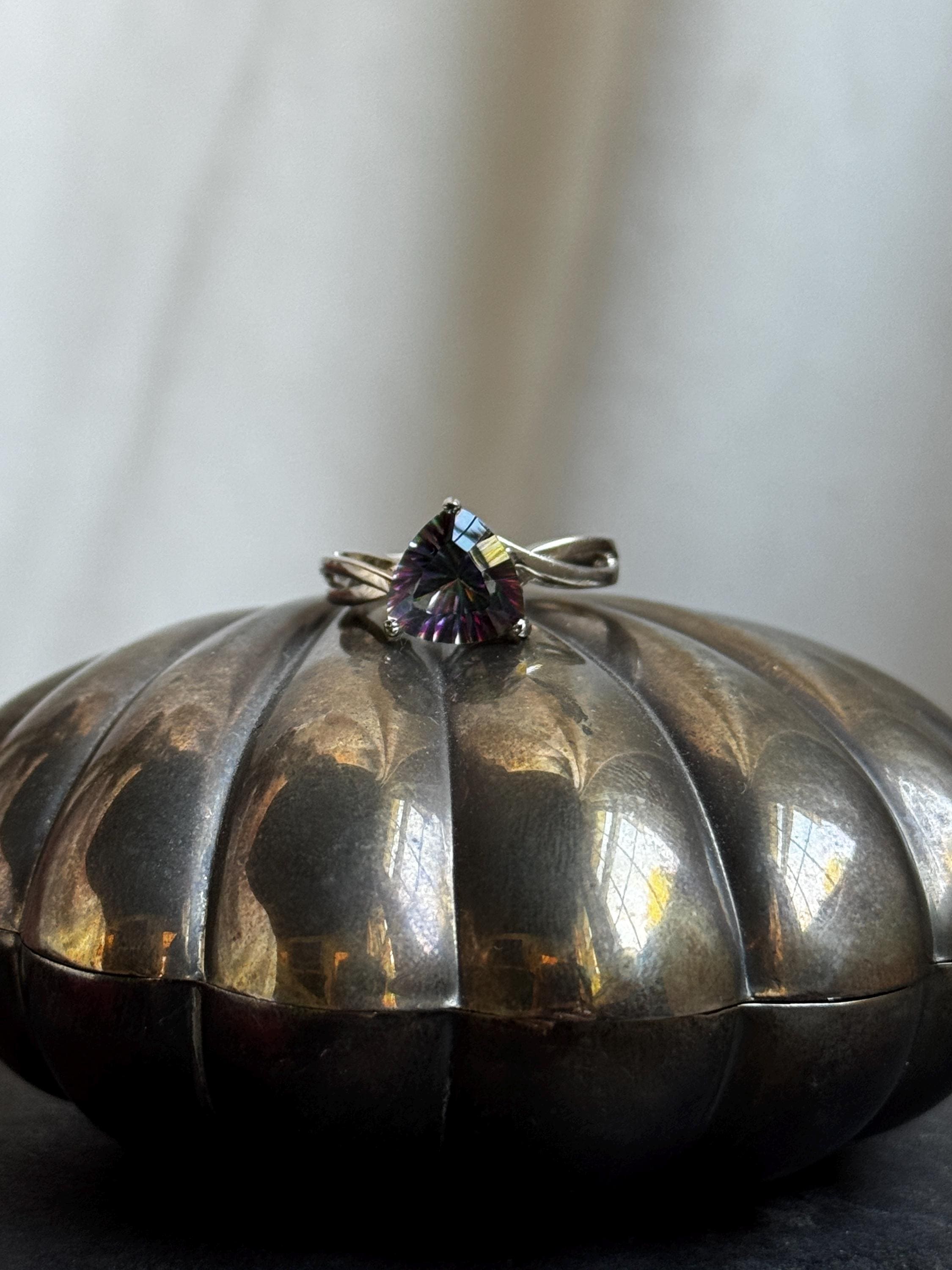 A pretty and magical-looking solitaire ring featuring a trillion-cut center stone. The ring is not marked but I believe it to be sterling silver and it will be tested to confirm. The center gemstone is mystic topaz and shifts rays of blues, greens, and reds beautifully as the light hits it. This would be a really cute alternative promise ring, or perfect for spooky season ✨