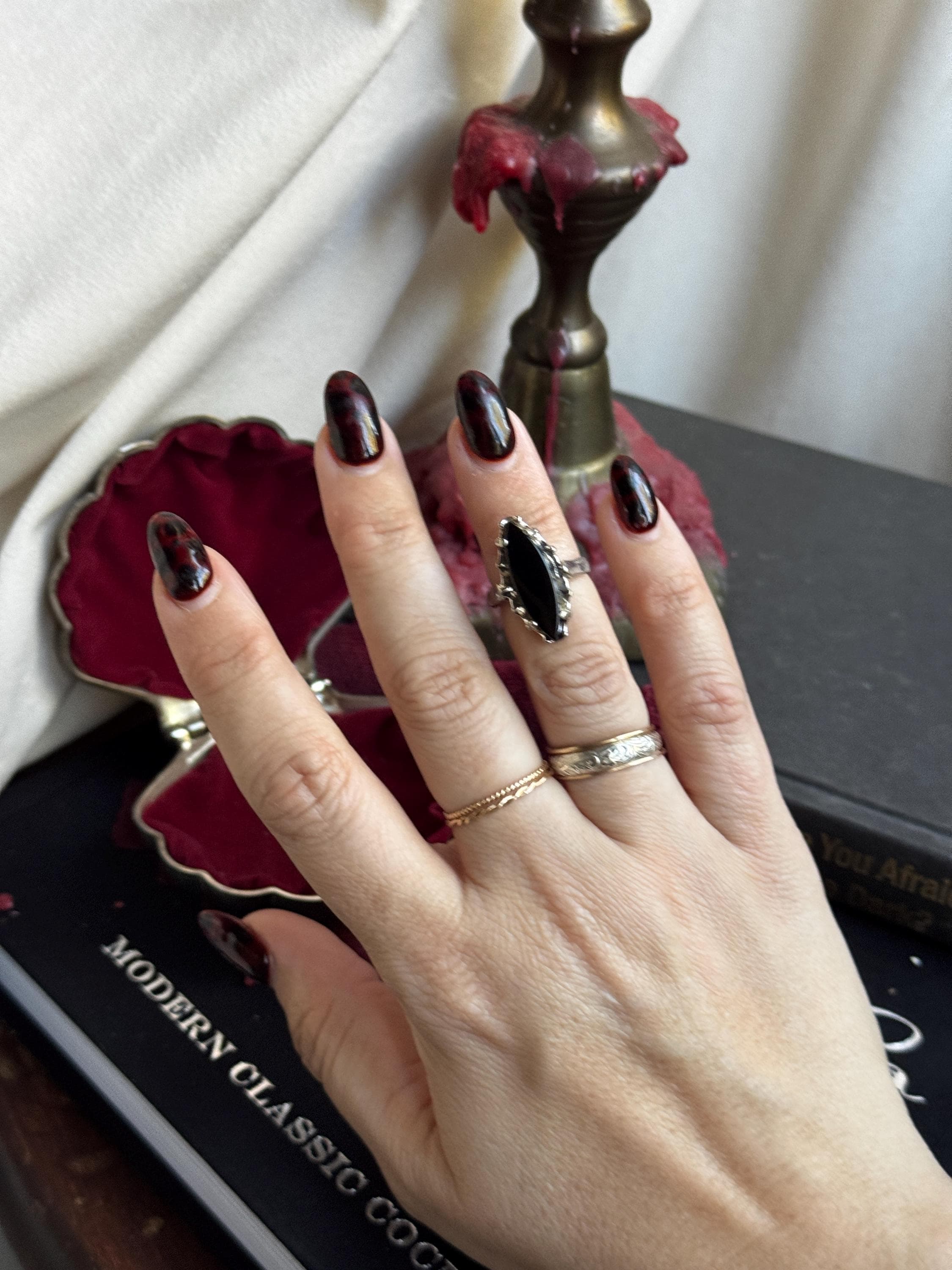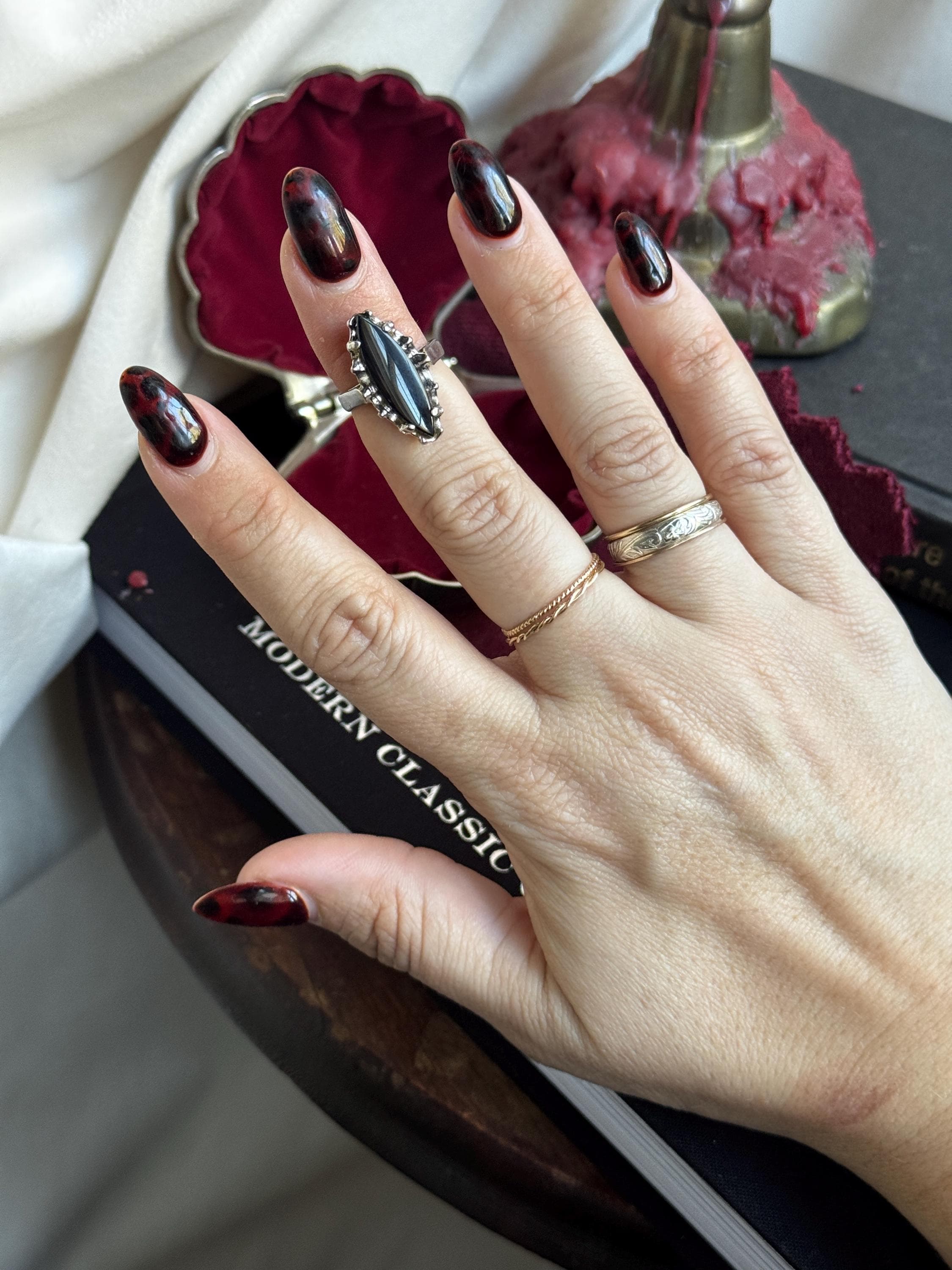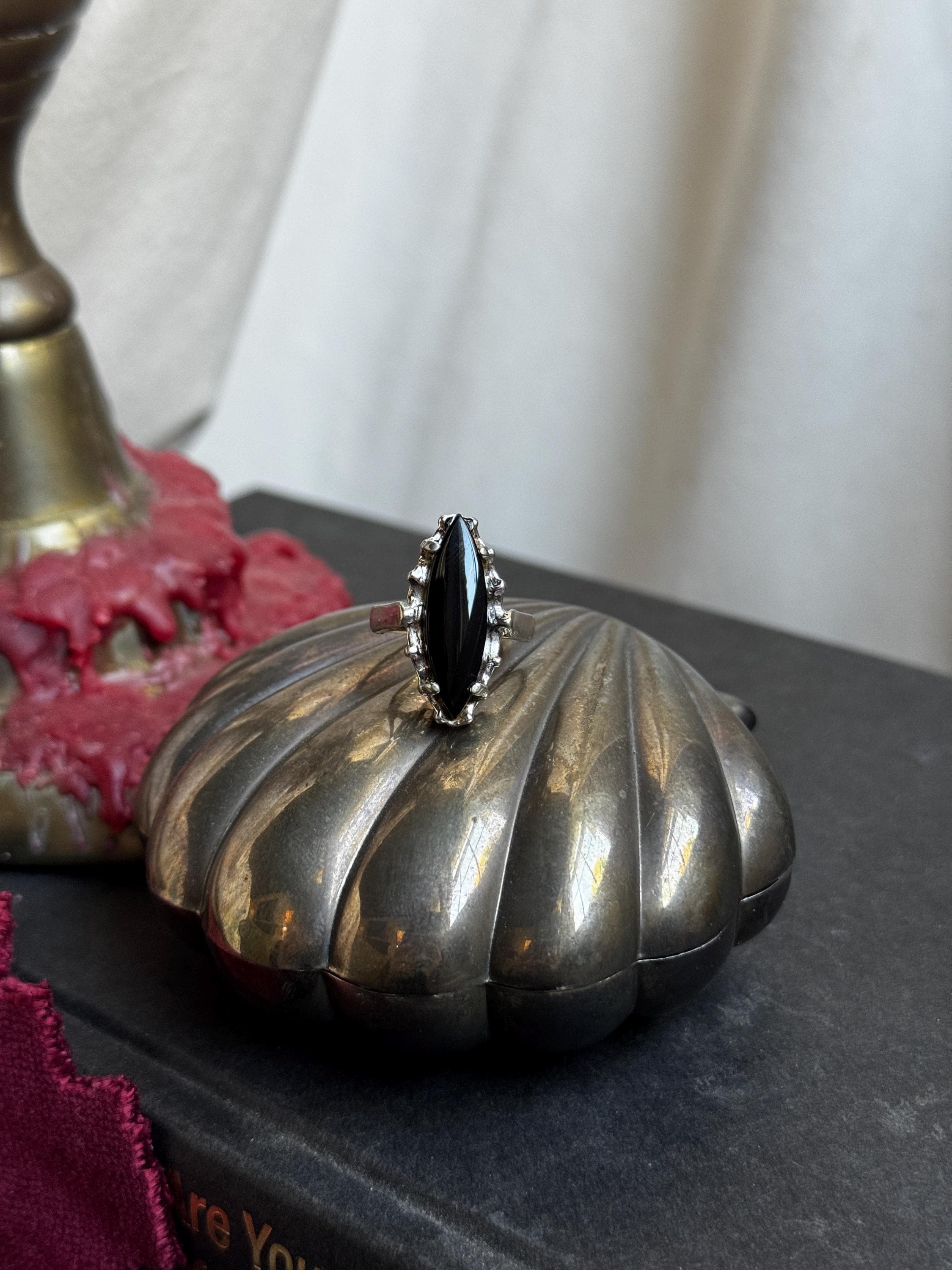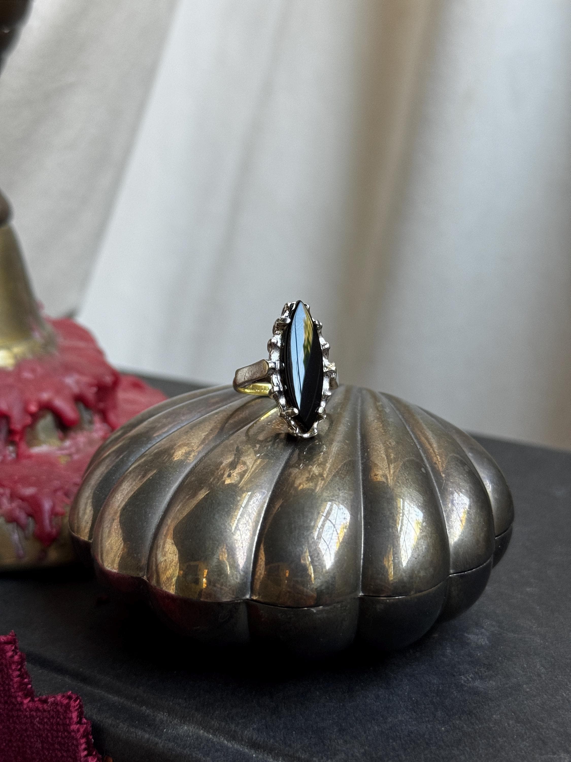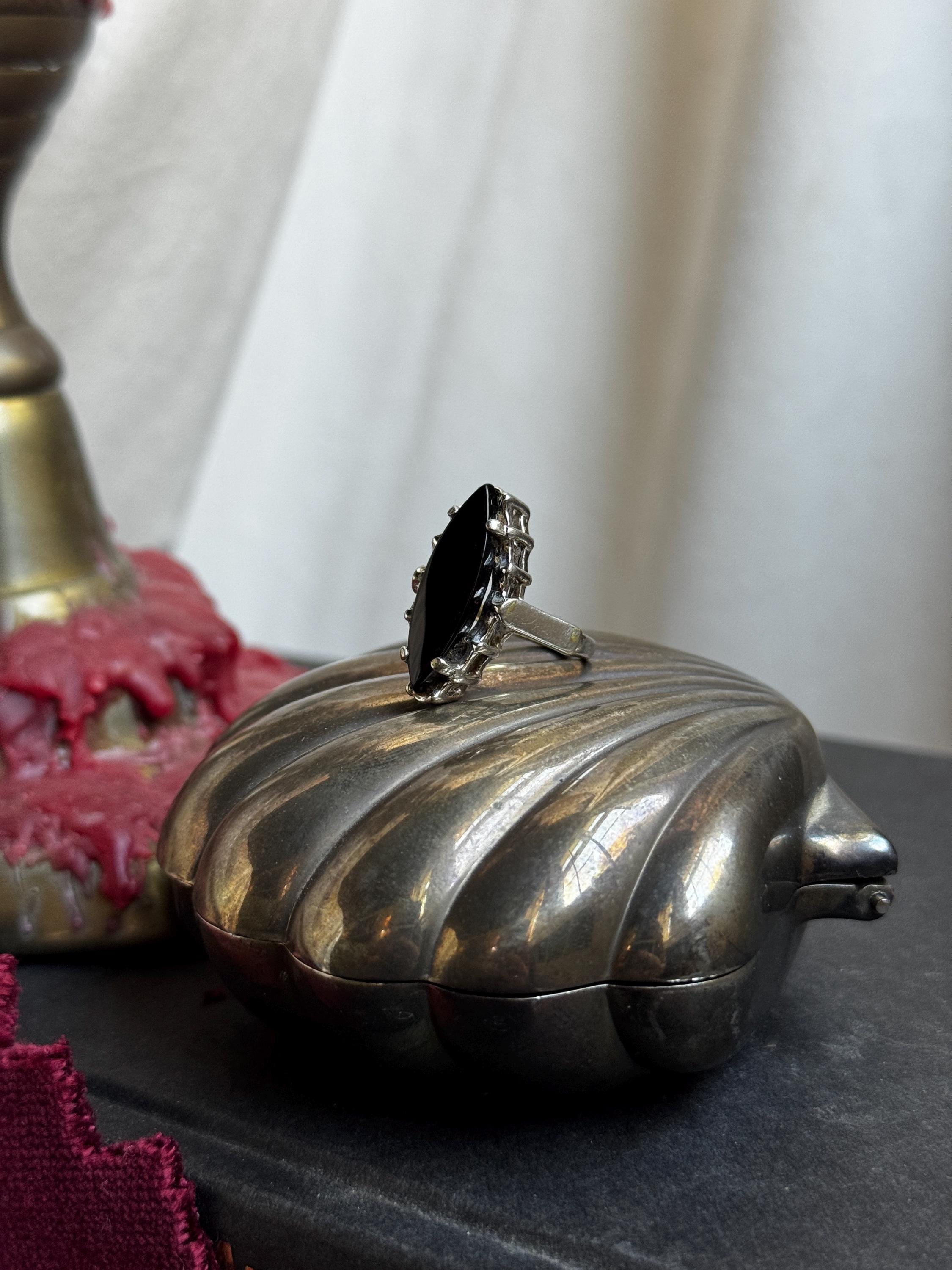 A chic vintage 14kge ring by Uncas Mfg Company featuring a large marquis-cut center stone. Center stone could be onyx based on my research, but it has not been tested.