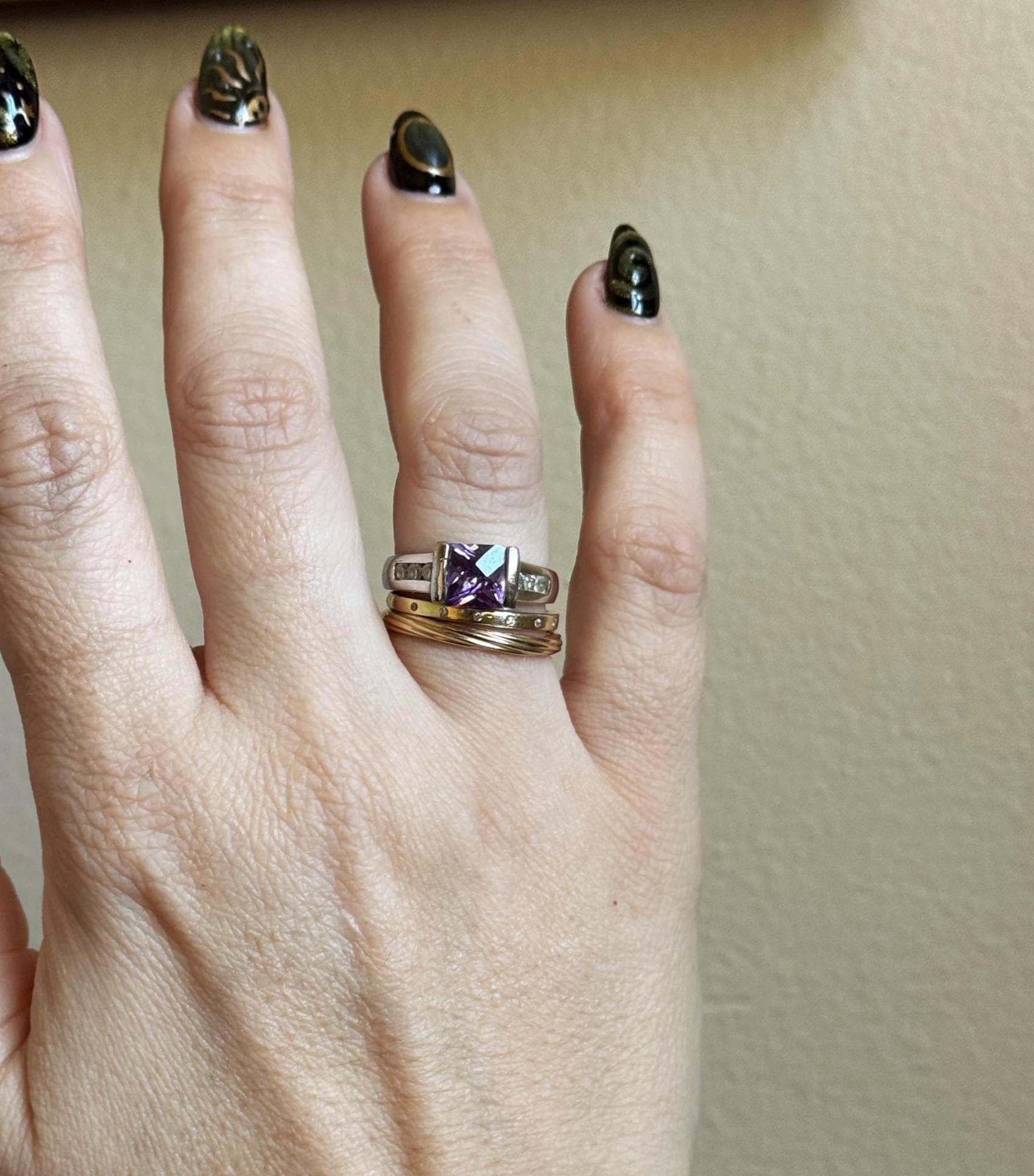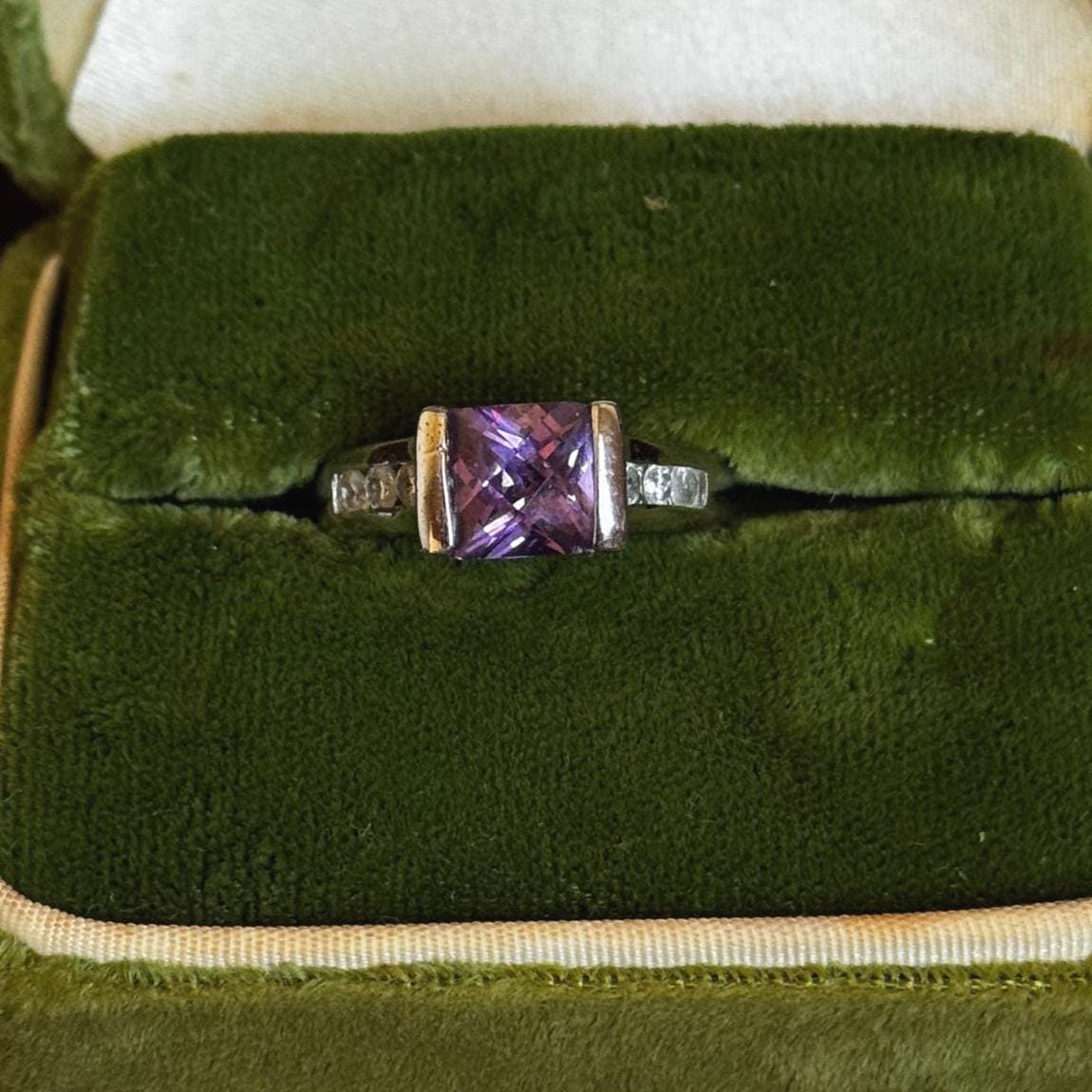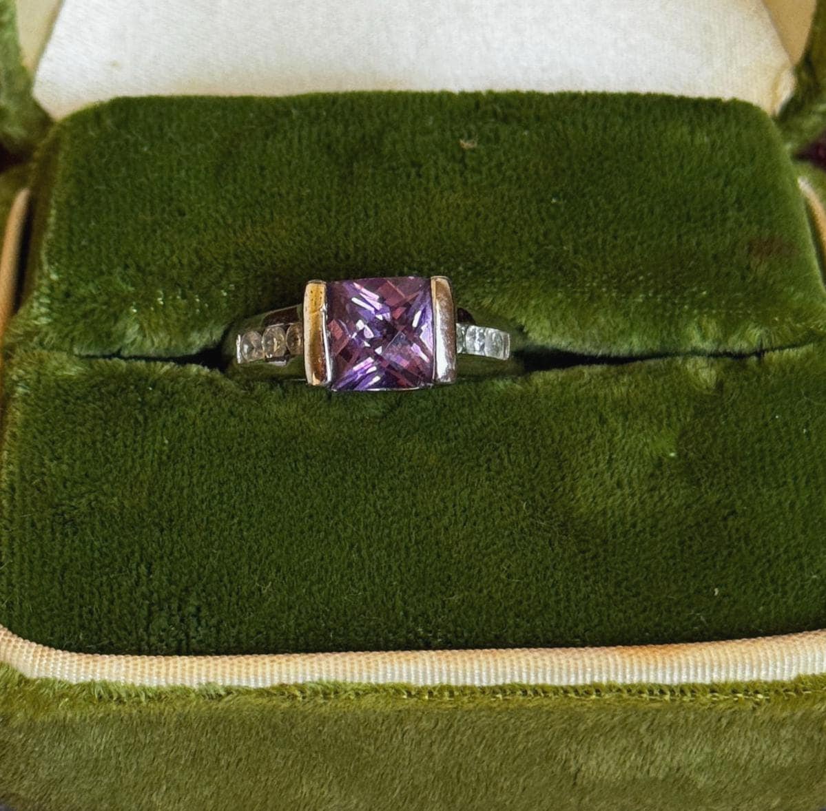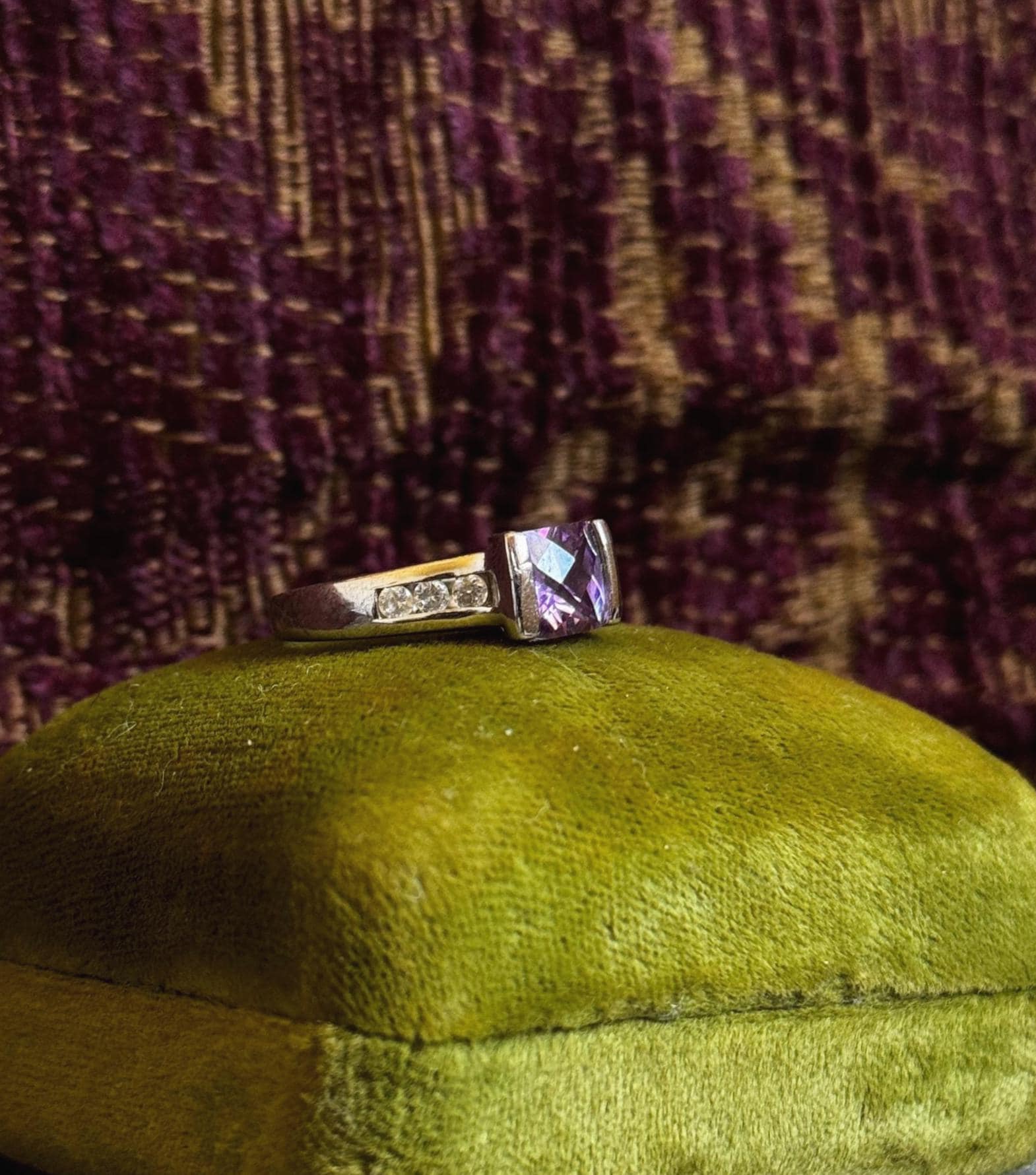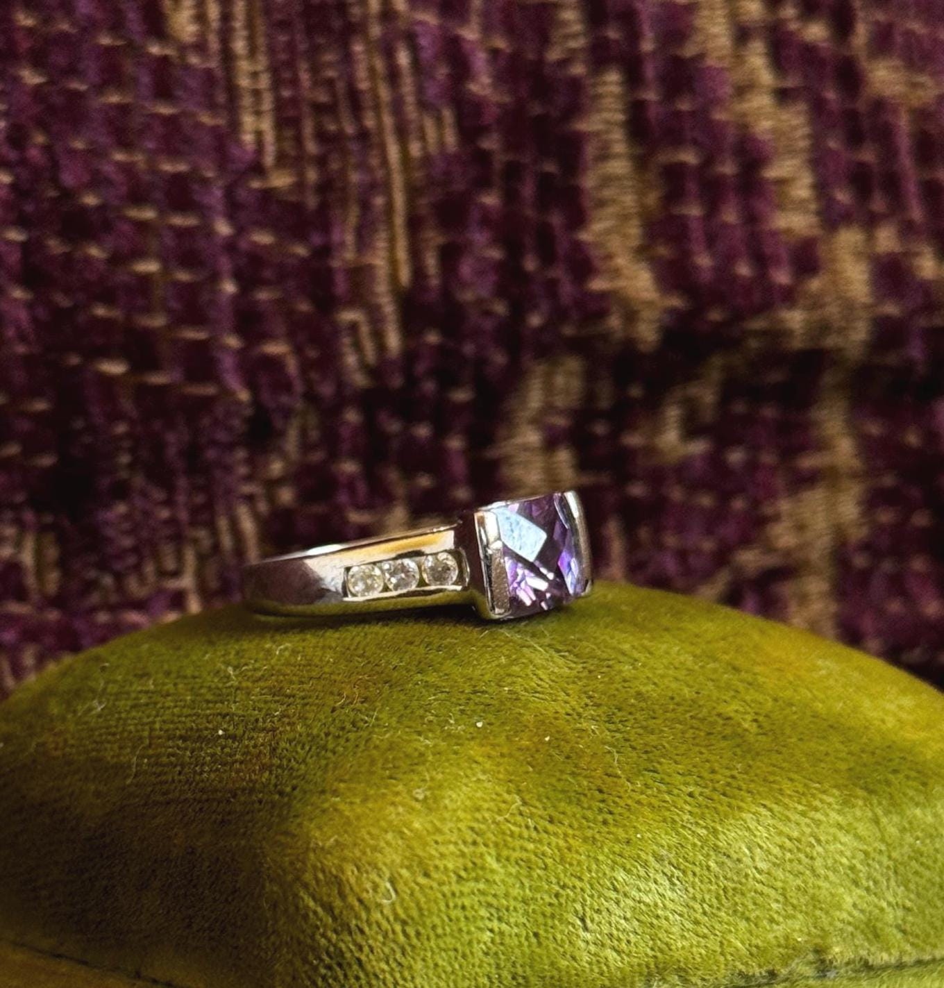 A vintage solitaire ring with a big personality. This is a weighty sterling silver ring featuring a large-and-in-charge amethyst center stone in a fun square cut. This will make a very fun statement ring for your silver collection.