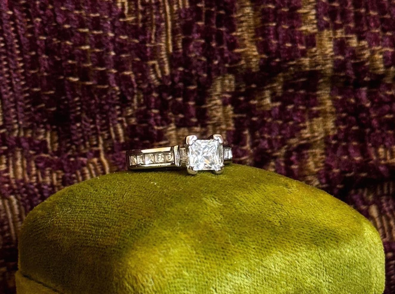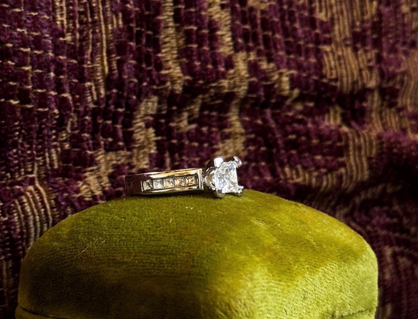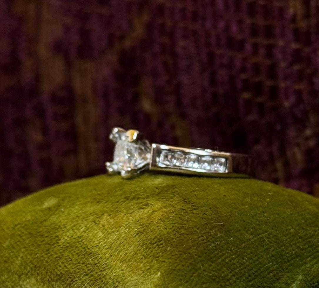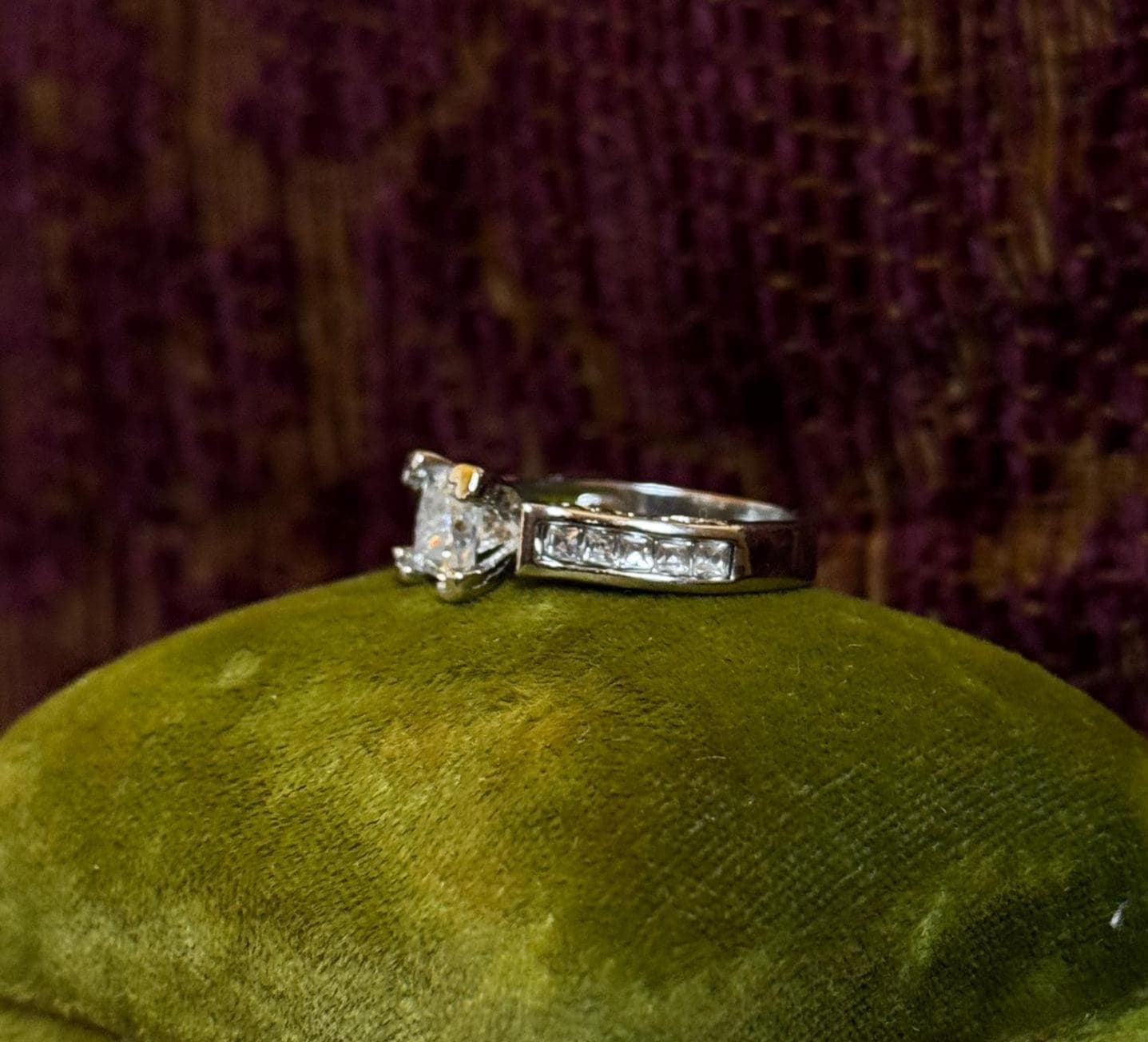 This is a vintage (early 00s) engagement-style ring featuring a square center stone flanked by 5 channel set square stones on each shoulder. The stones are quite sparkly and offer a lot of excitement on the hand. I assume the stones to be CZ but they have not been tested. I am happy to have them tested at buyer's request. This ring may be modern but it is classic in all the right ways.