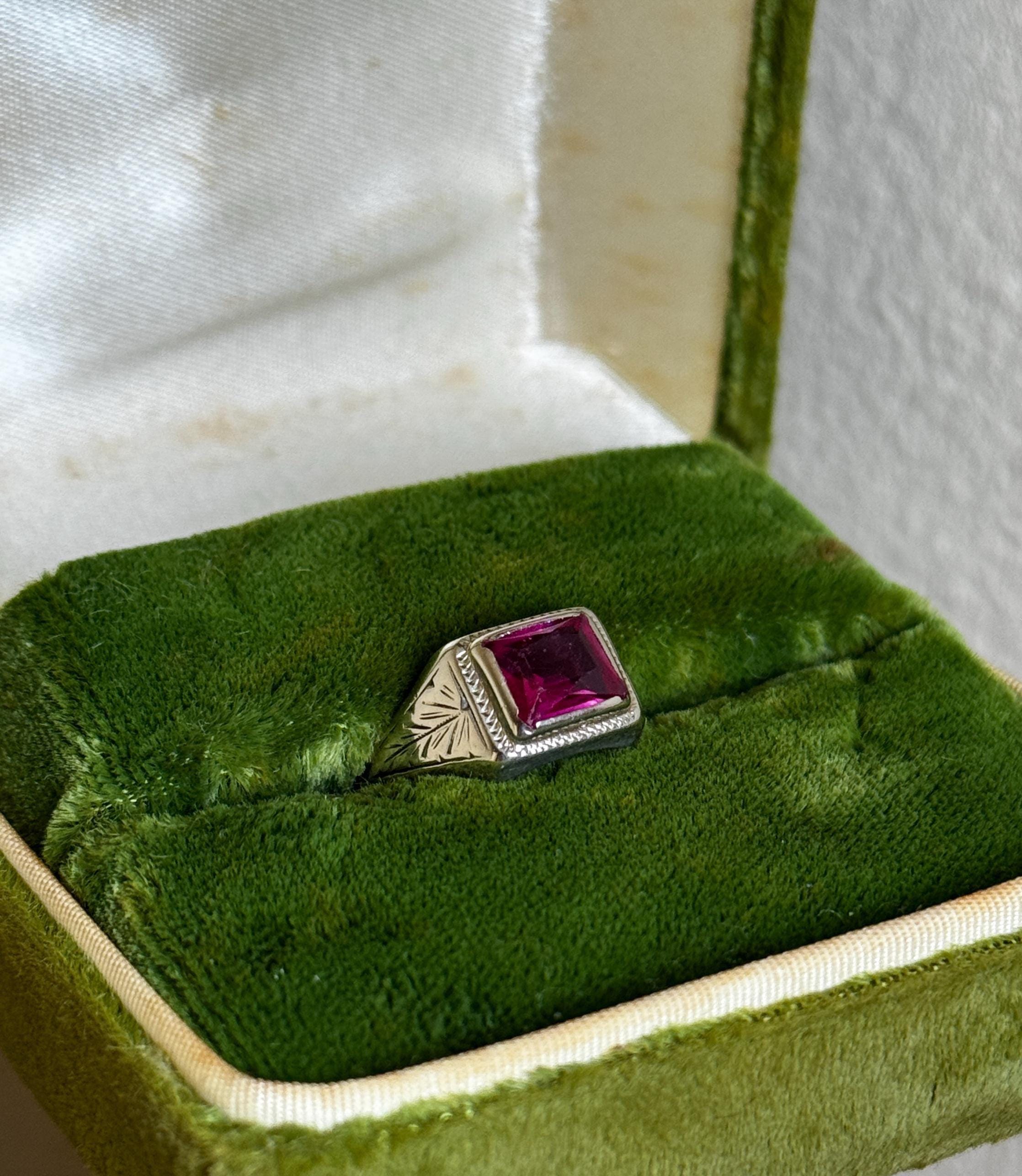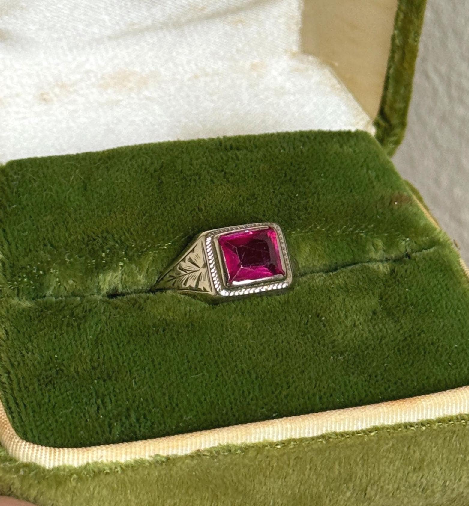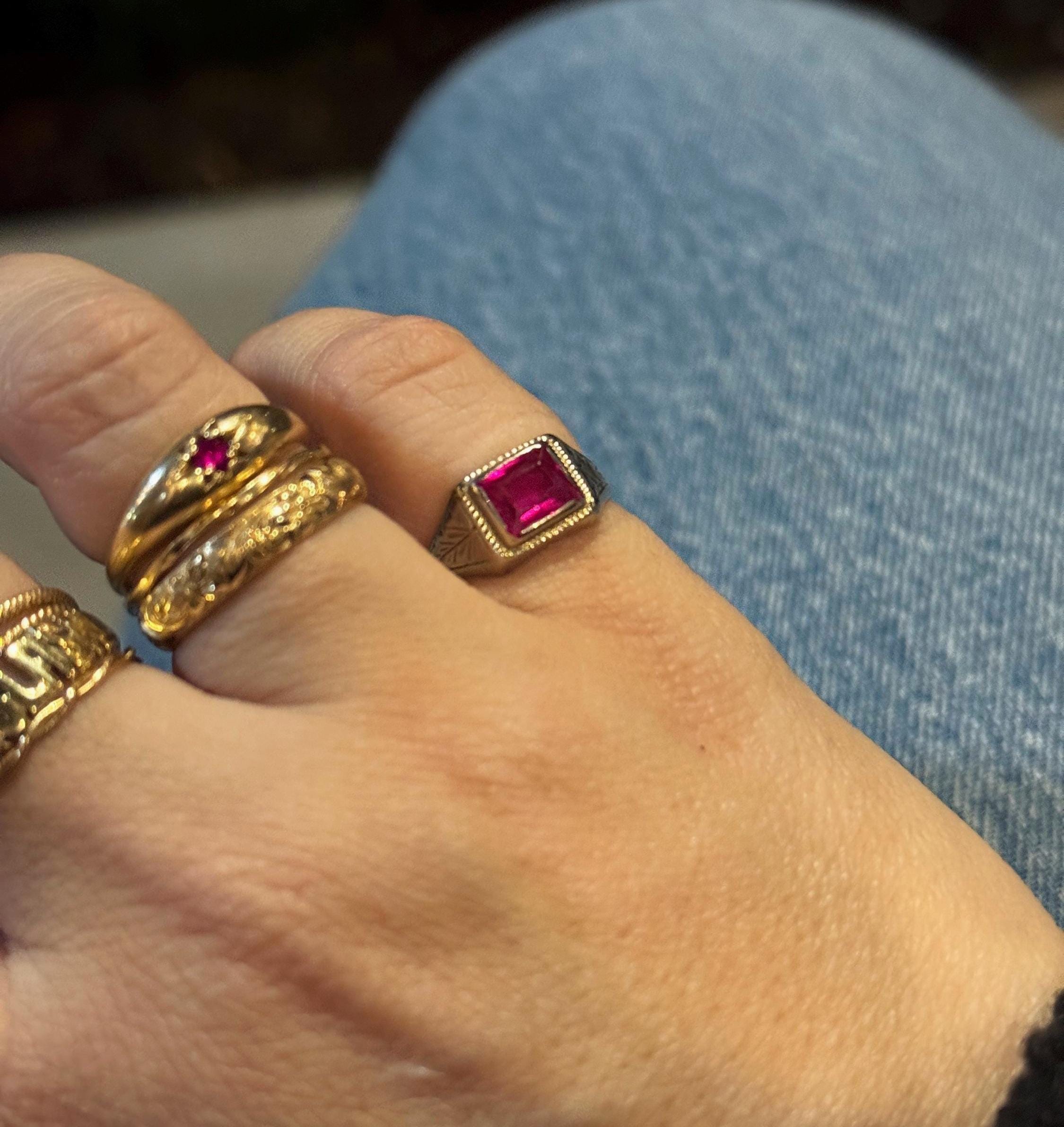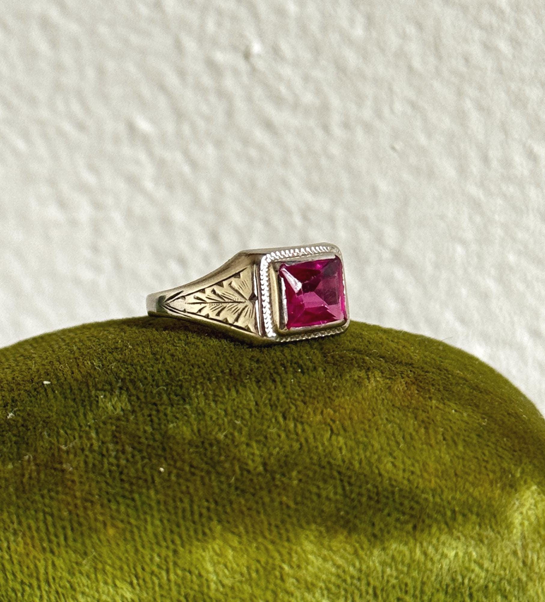 This is a dreamy 10k solid gold Art Deco-era ring showing off a vibrant pink-red ruby set in an east-west direction. This ring has hand-engraved details on each side of the stone as well as a precious engraving on the inside of the shank, assembly the original owner’s name. This ring was clearly once very loved and is ready to be cherished again. While it is at least 100 years old, it is in gorgeous shape for its age. It is the perfect every day ring.