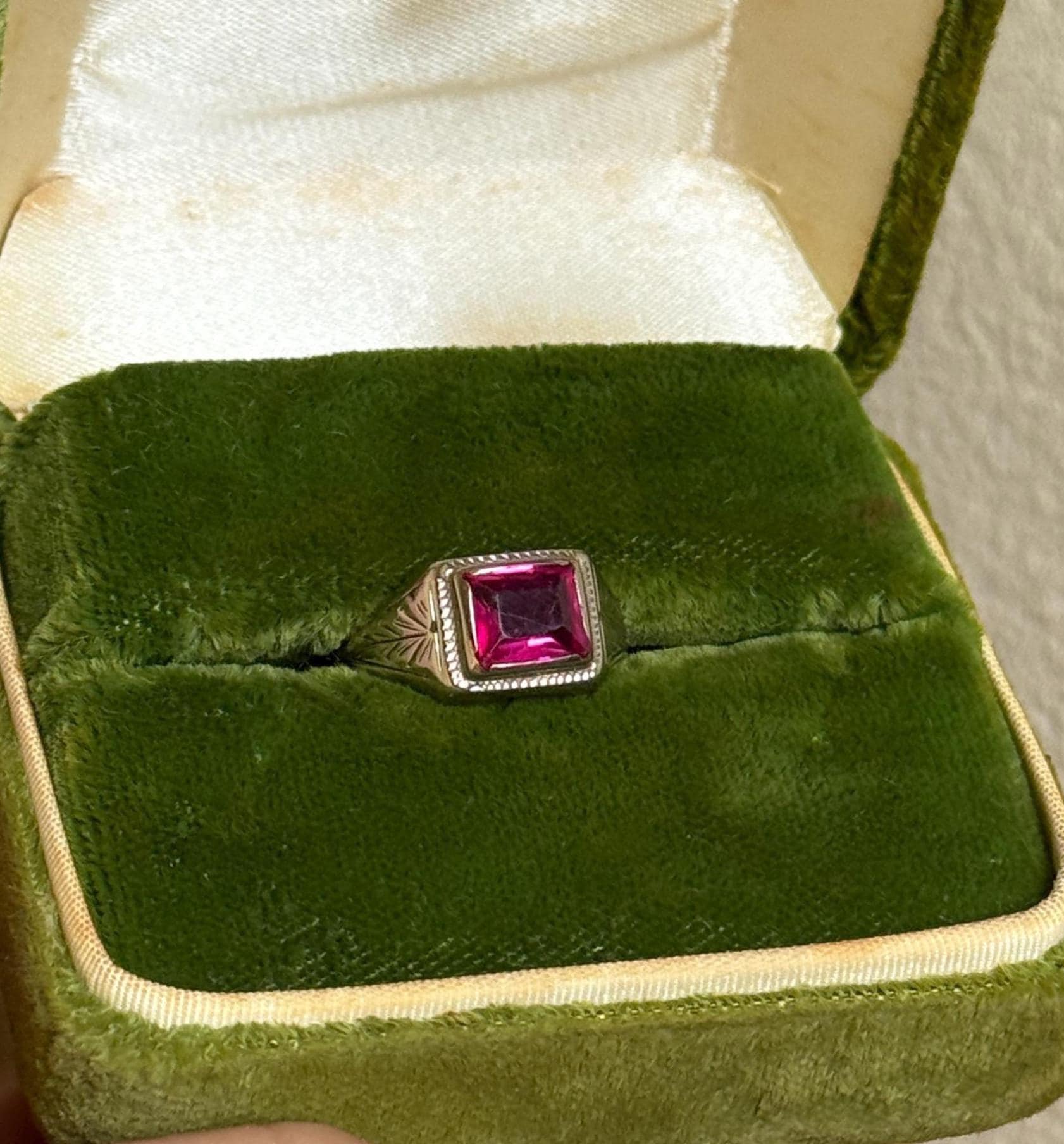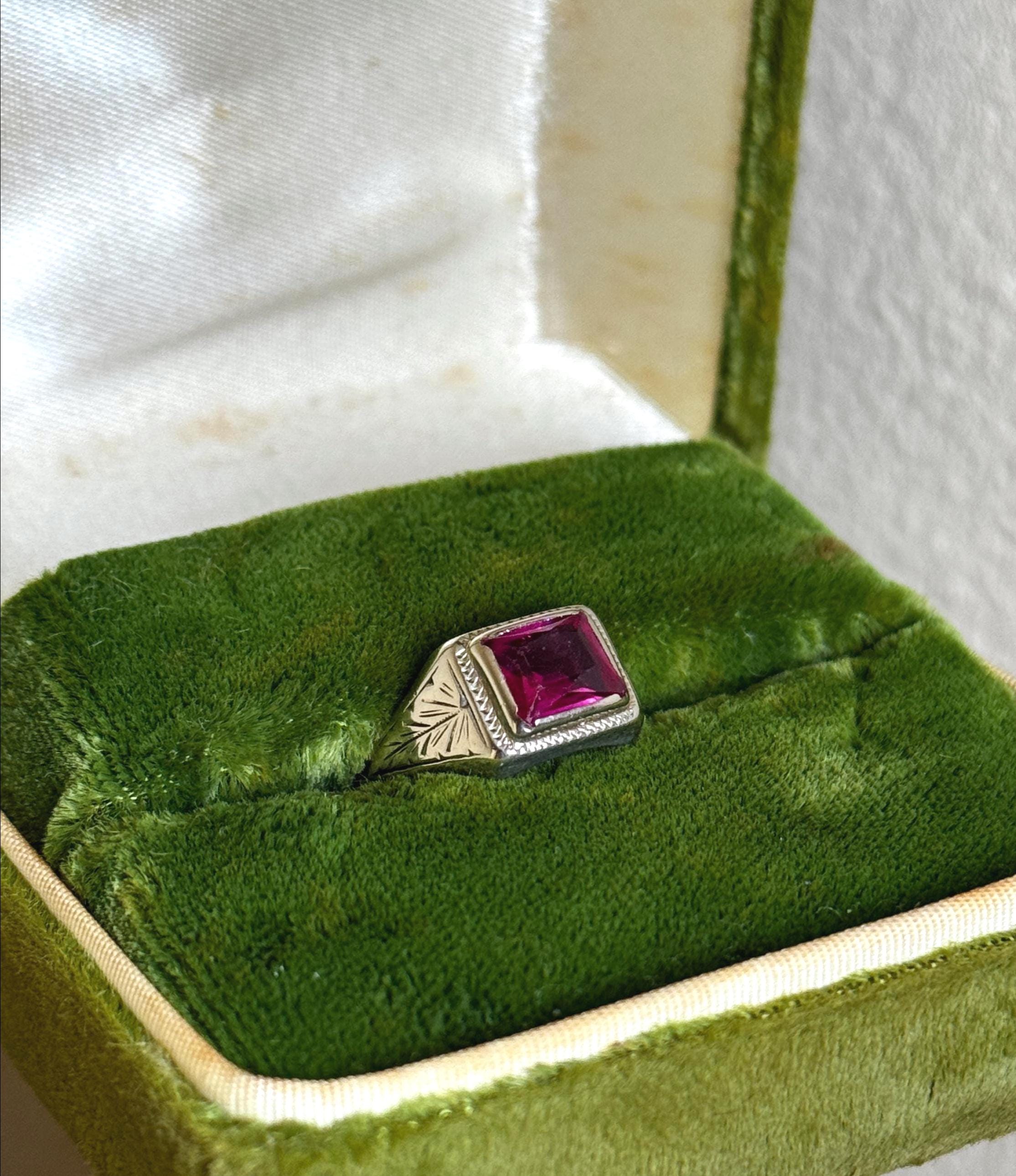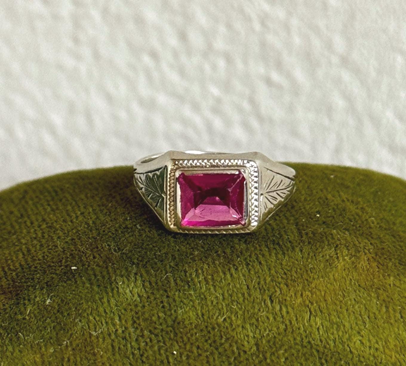 This is a dreamy 10k solid gold Art Deco-era ring showing off a vibrant pink-red ruby set in an east-west direction. This ring has hand-engraved details on each side of the stone as well as a precious engraving on the inside of the shank, assembly the original owner’s name. This ring was clearly once very loved and is ready to be cherished again. While it is at least 100 years old, it is in gorgeous shape for its age. It is the perfect every day ring.