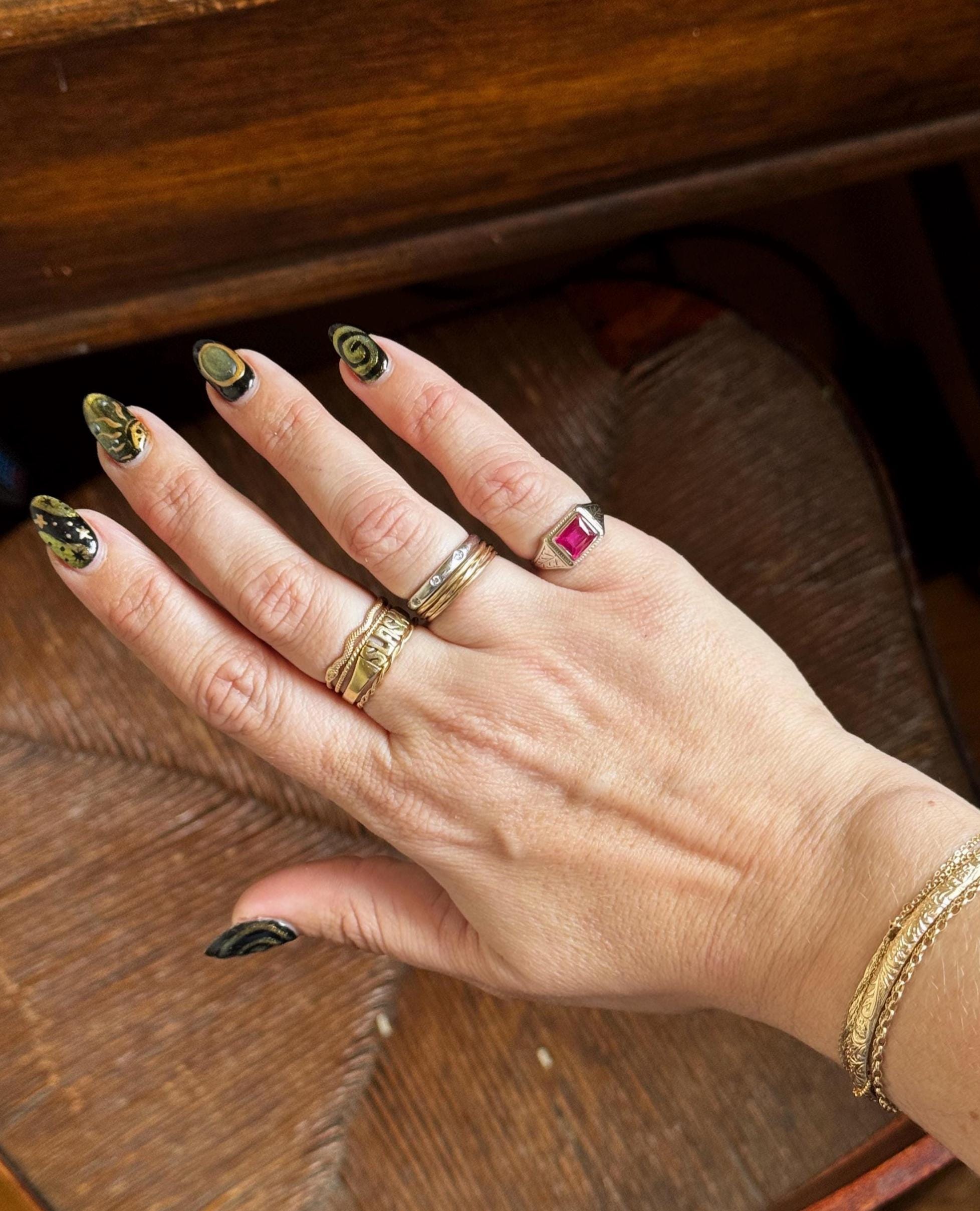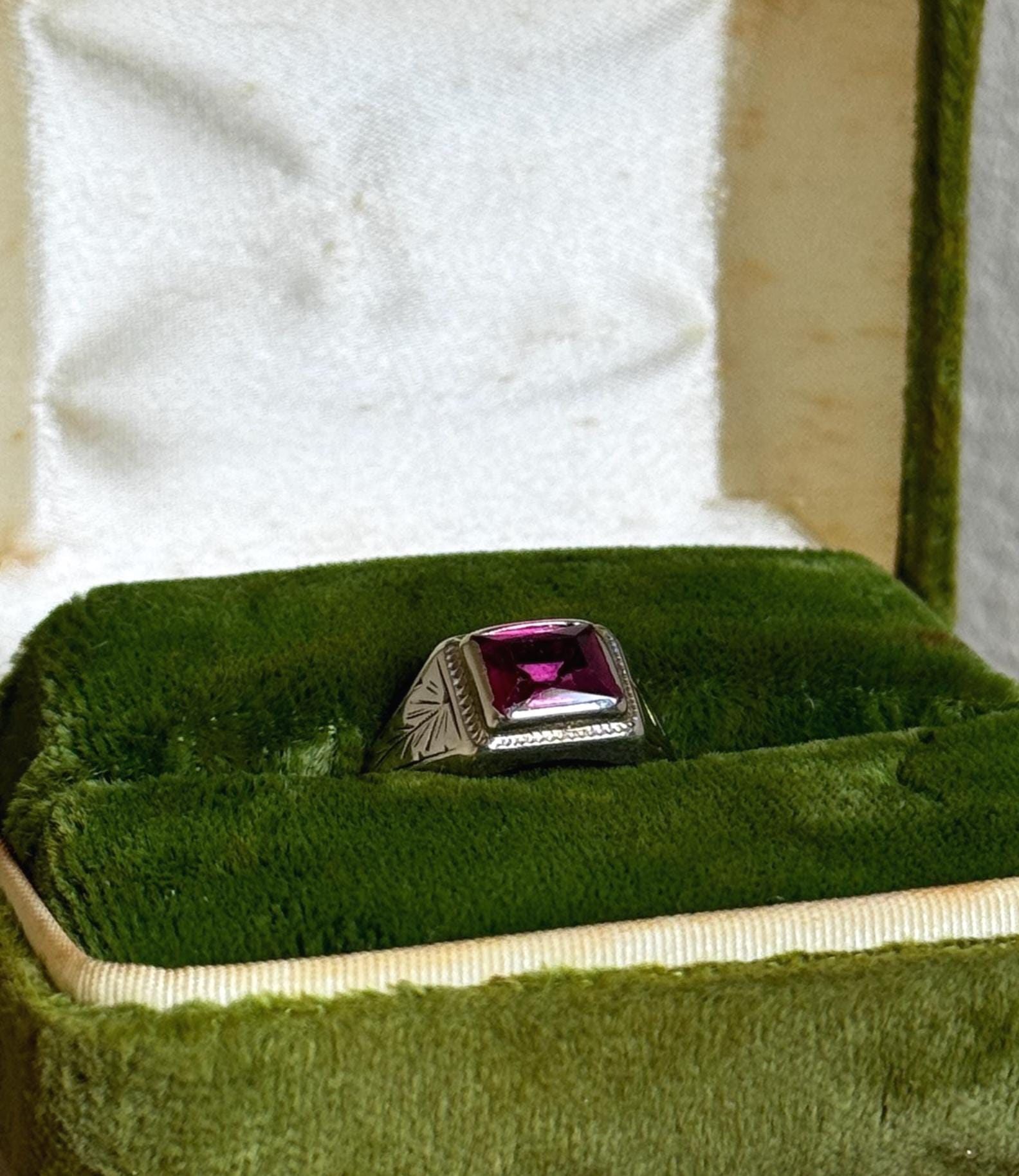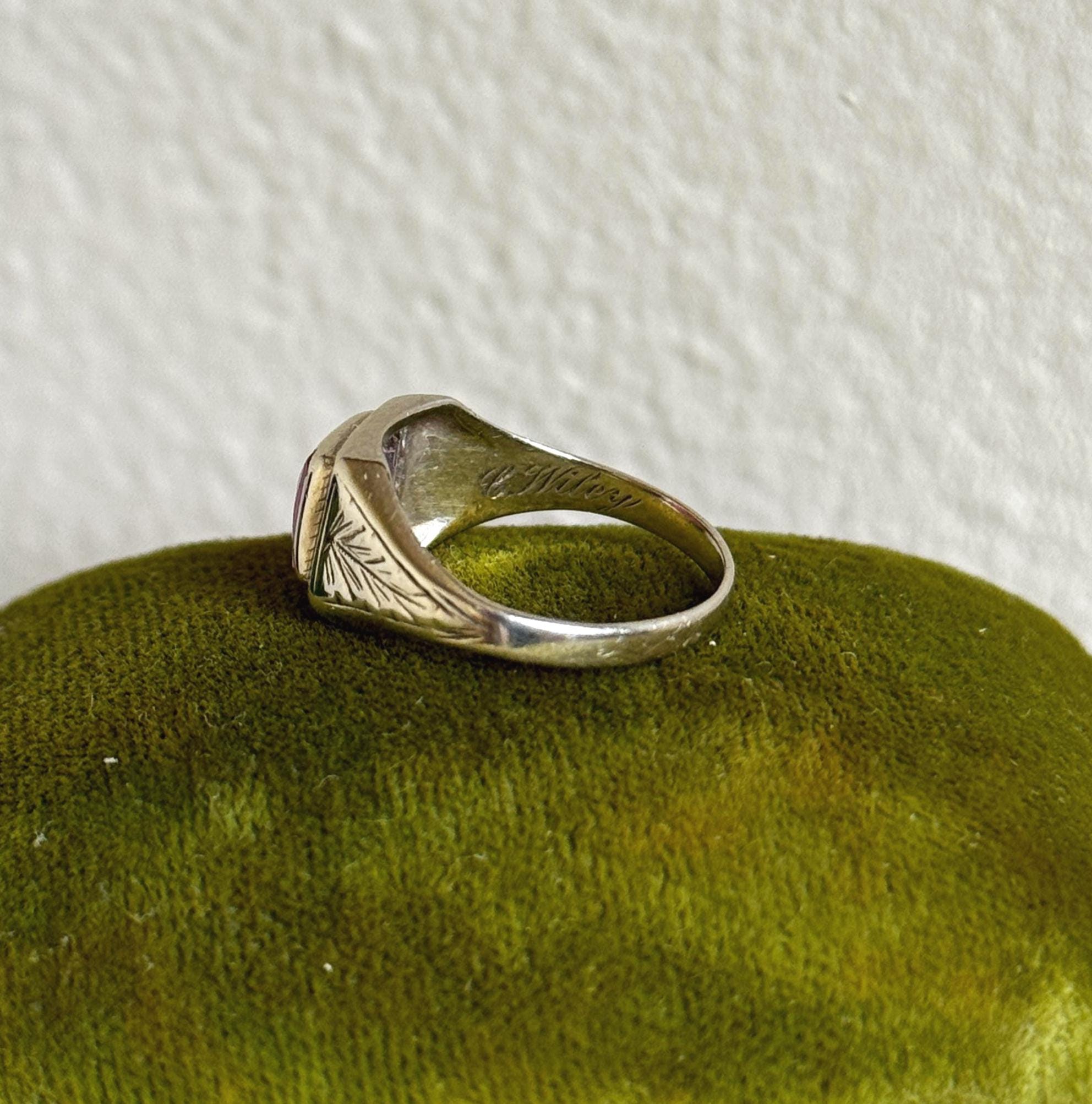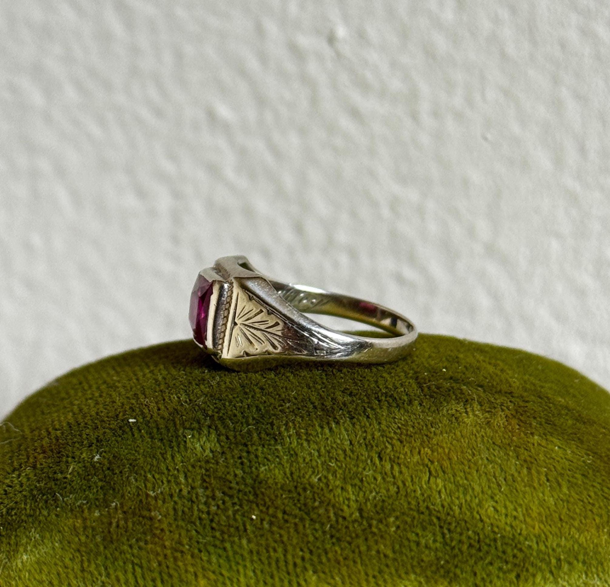 This is a dreamy 10k solid gold Art Deco-era ring showing off a vibrant pink-red ruby set in an east-west direction. This ring has hand-engraved details on each side of the stone as well as a precious engraving on the inside of the shank, assembly the original owner’s name. This ring was clearly once very loved and is ready to be cherished again. While it is at least 100 years old, it is in gorgeous shape for its age. It is the perfect every day ring.