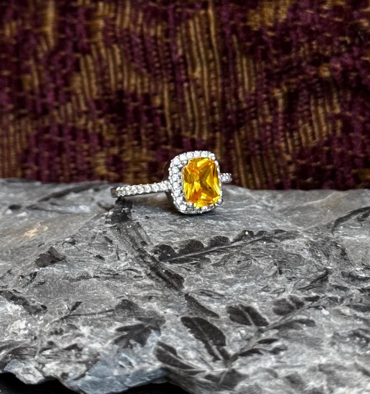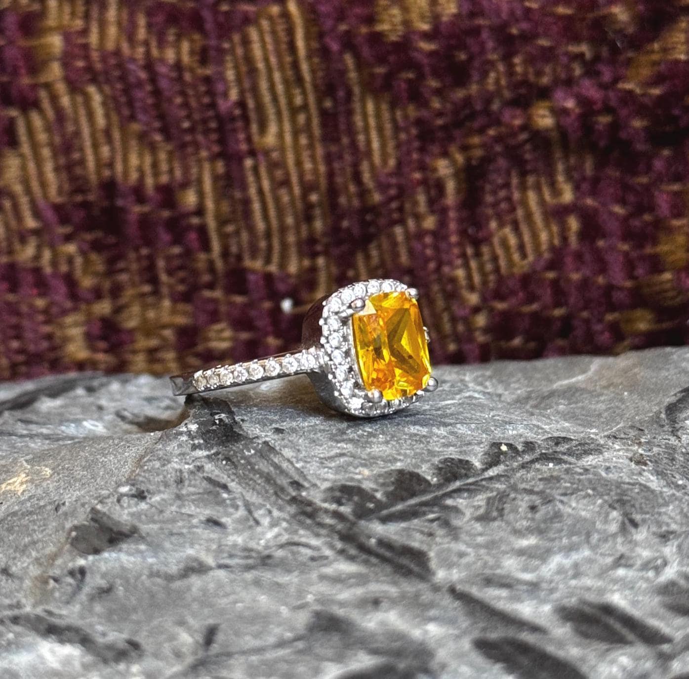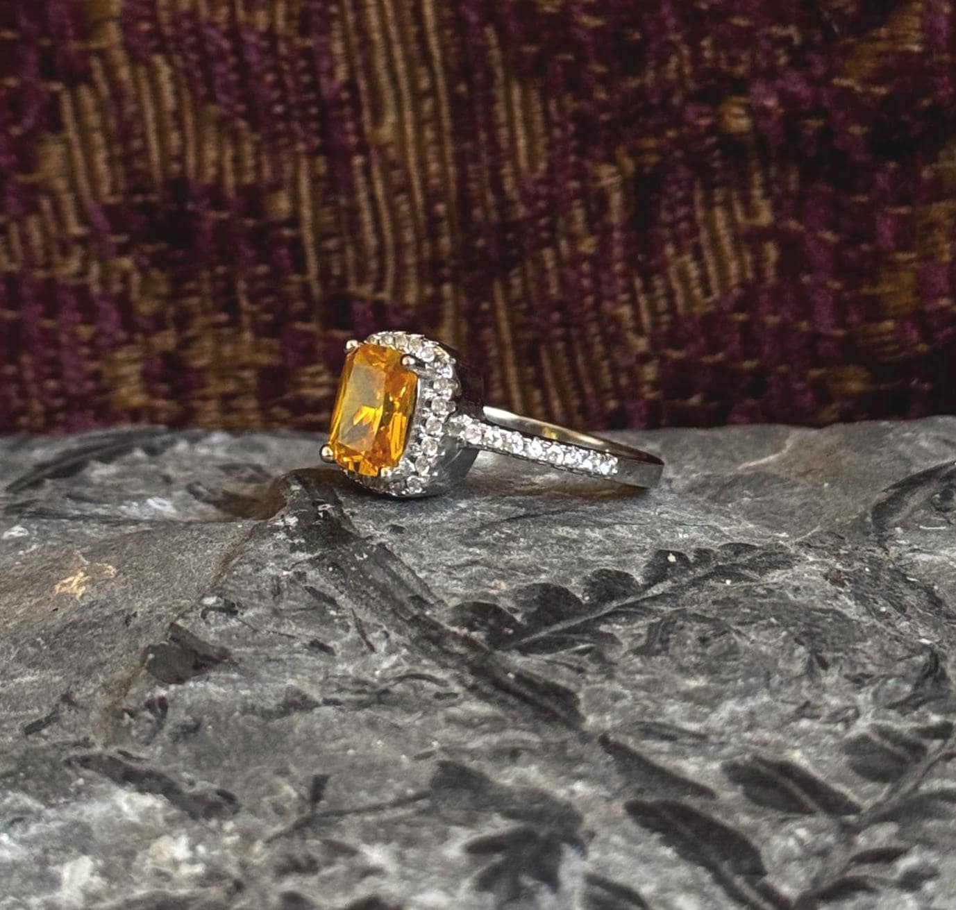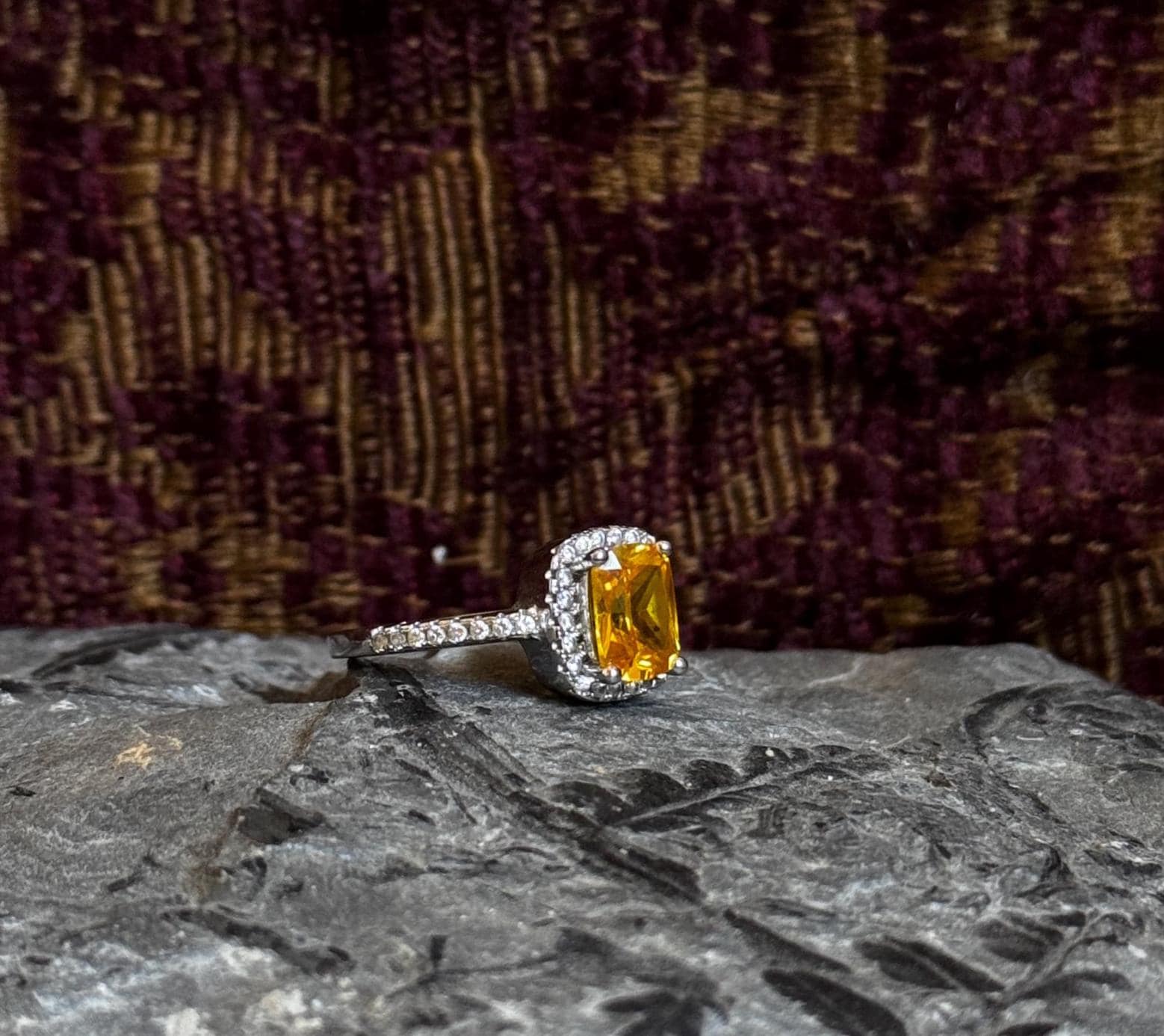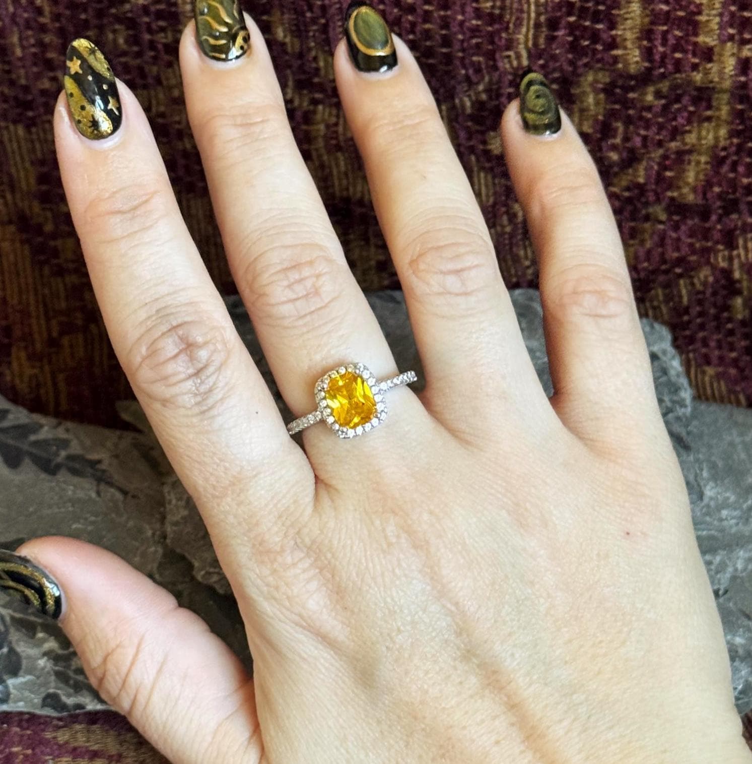 A glittery estate ring with a 925 sterling silver setting and a juicy citrine center stone. The color of the stone is rich and brings vibrance to a stack. I think it would look so cool with some other gemstones (blue topaz or sapphire eternity bands, anyone?). There are tiny little white stones (assumably CZ) framing the center stone and sitting on both shoulders of the shank.