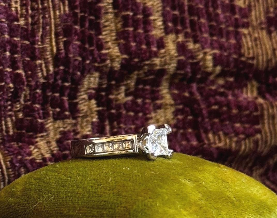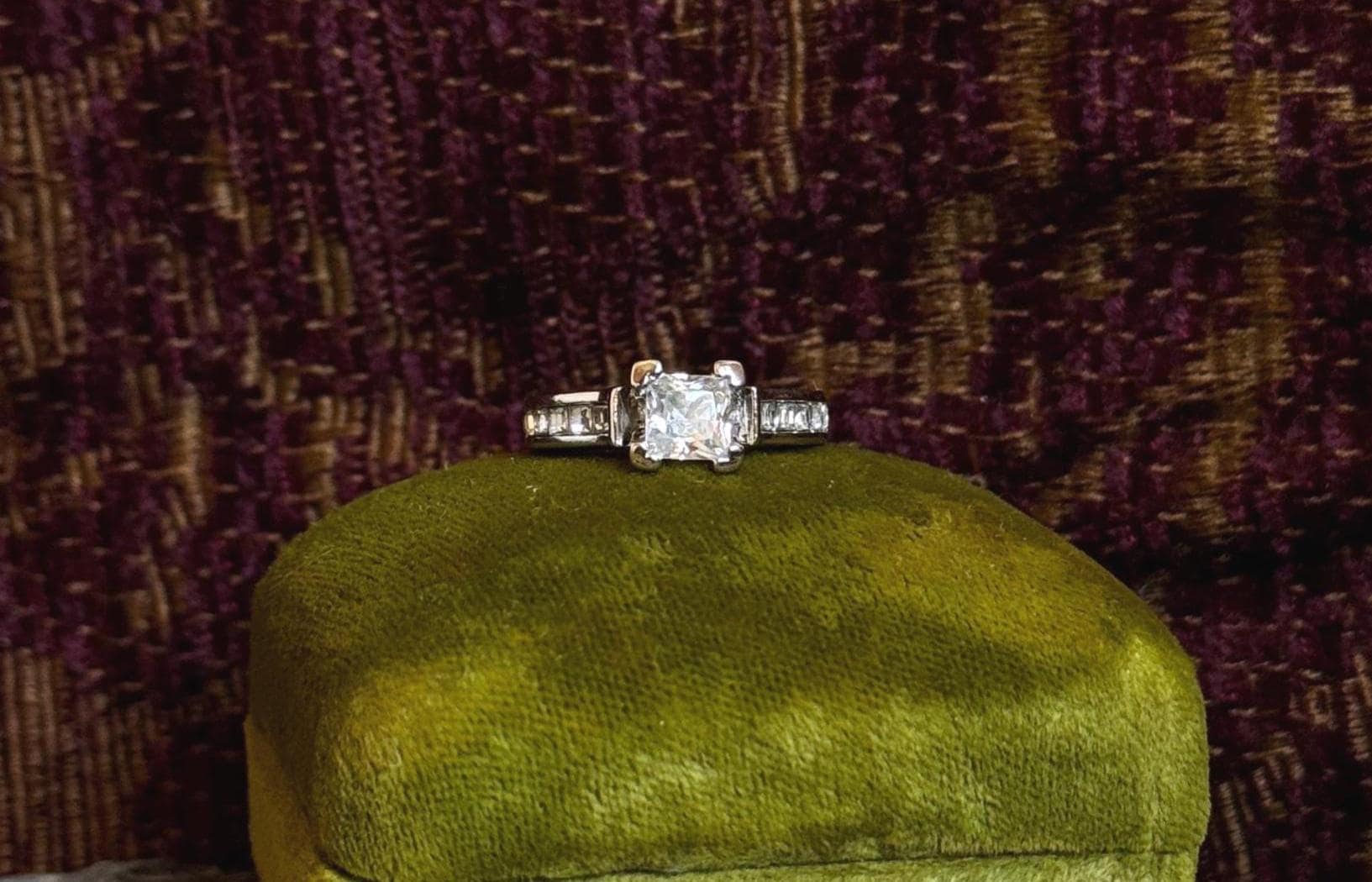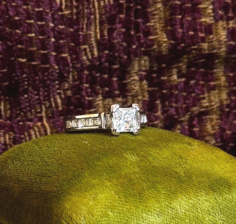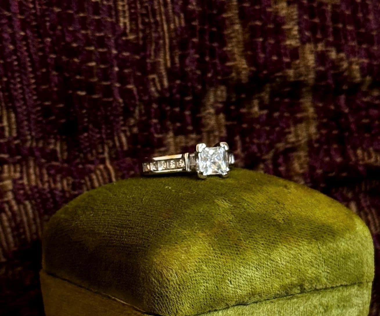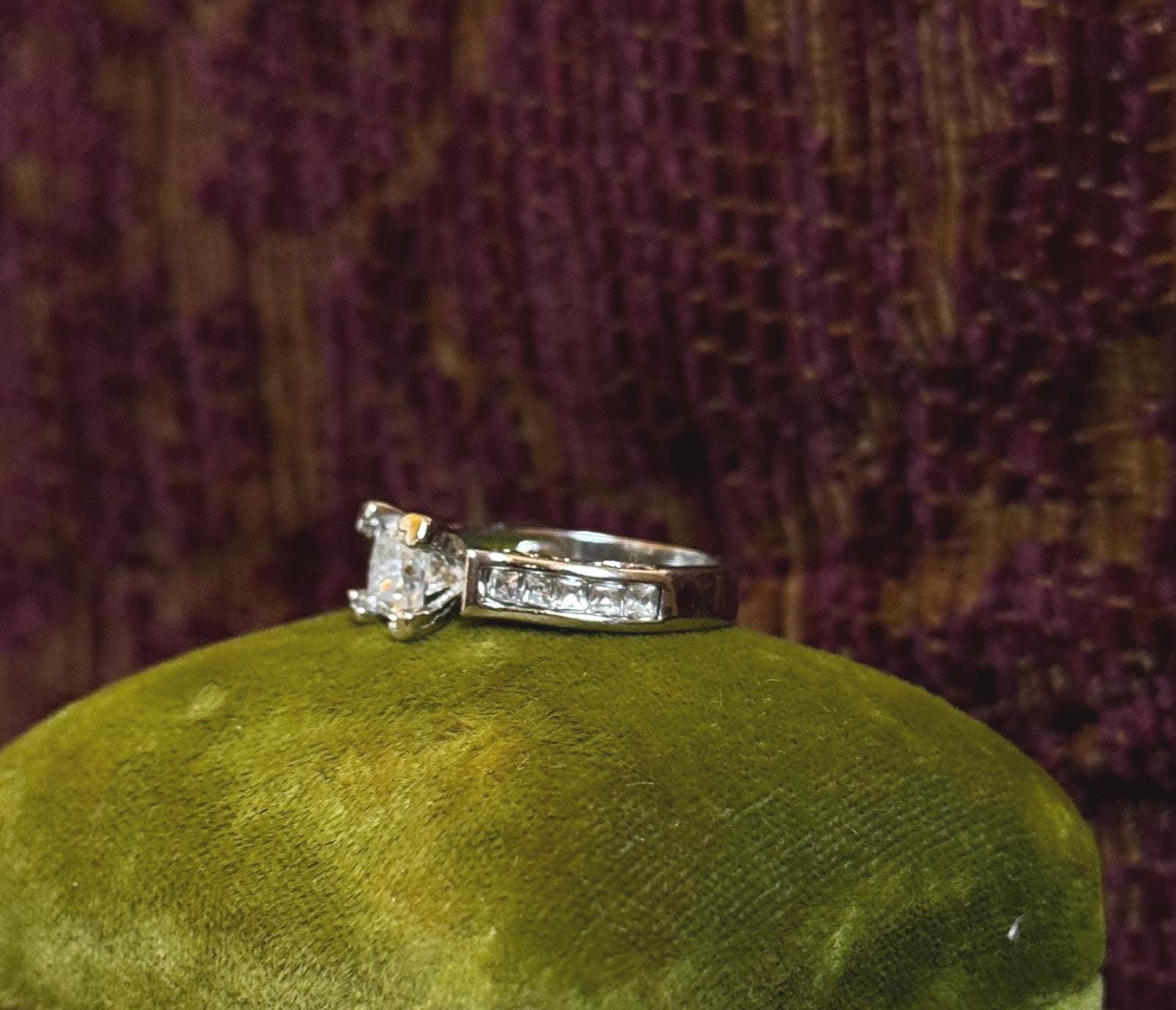 This pretty thing is a sterling silver engagement-style ring featuring a square-cut white center stone and several round stones on each shoulder. This would look right at home with the silver half-eternity band I also have in my shop.