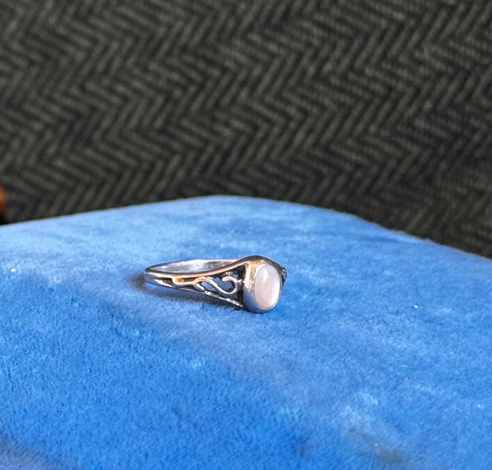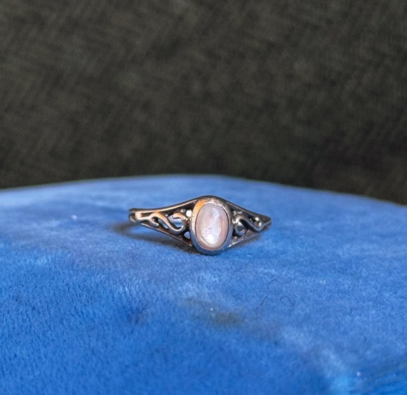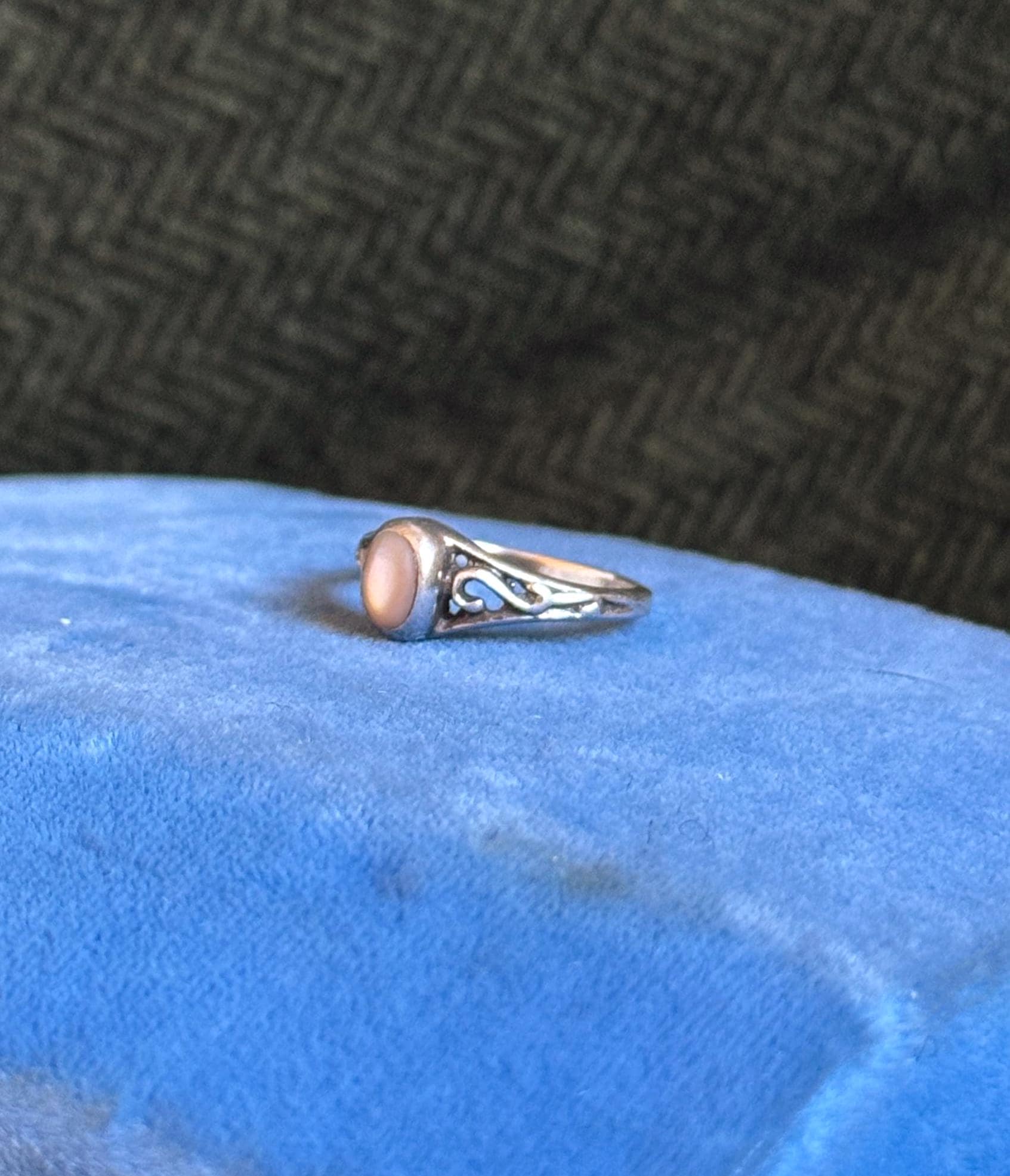 A really pretty vintage sterling silver ring with filigree design featuring a gorgeous Mother of Pearl cabochon. This ring has a great profile and sits very comfortably on the hand. Based on research it looks like this ring could have been made by the company Silver Cloud.