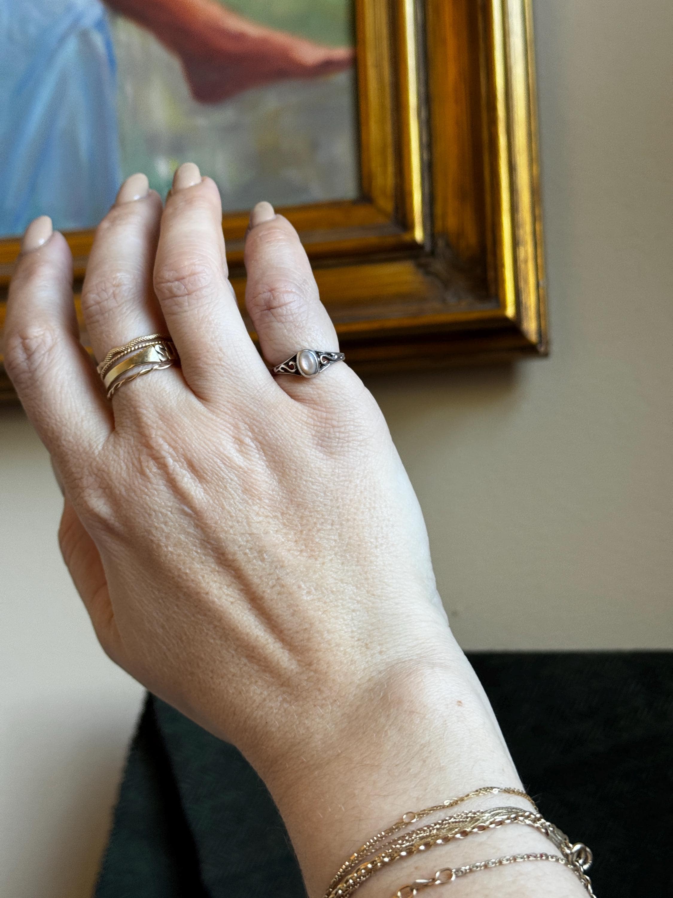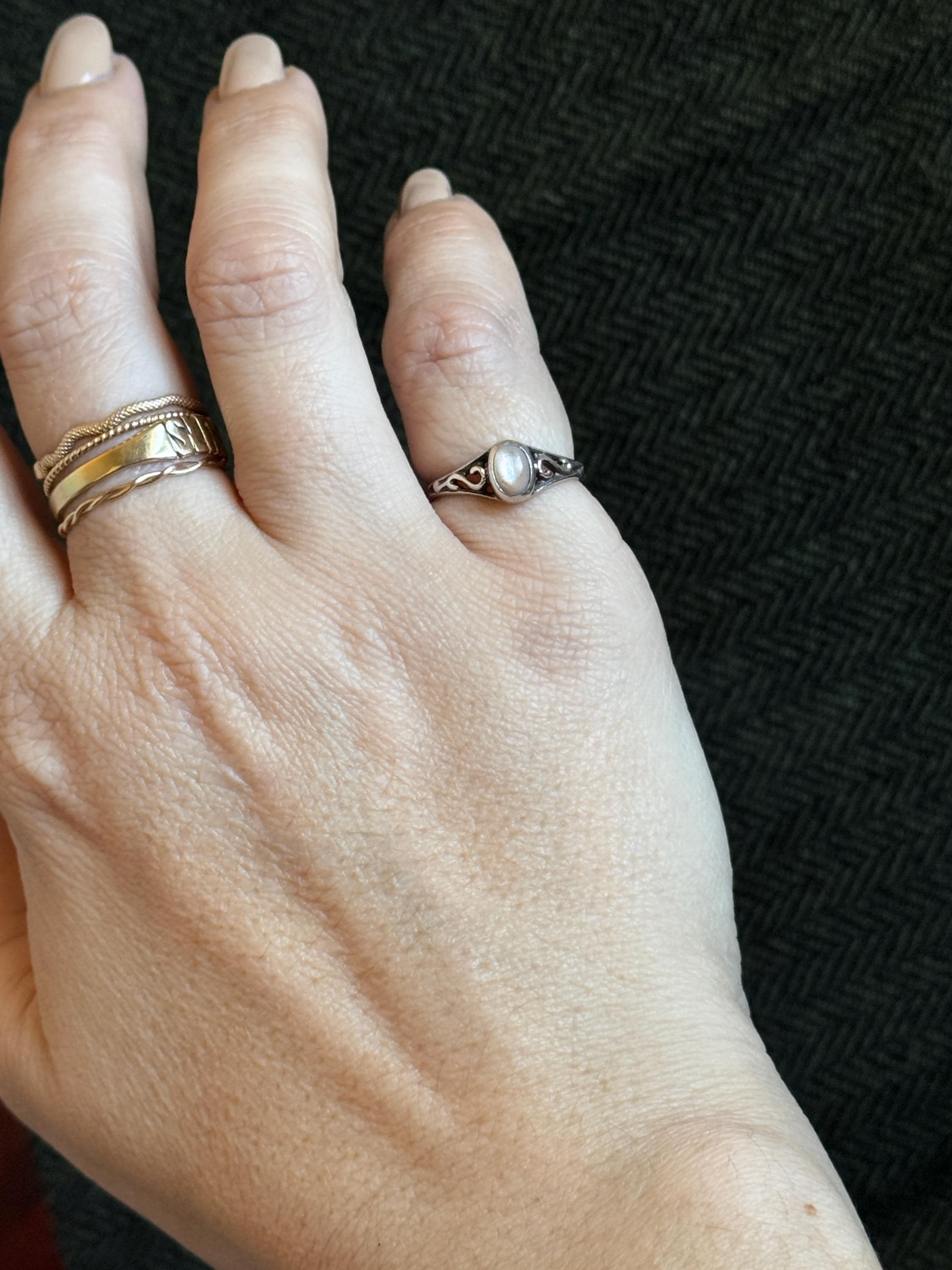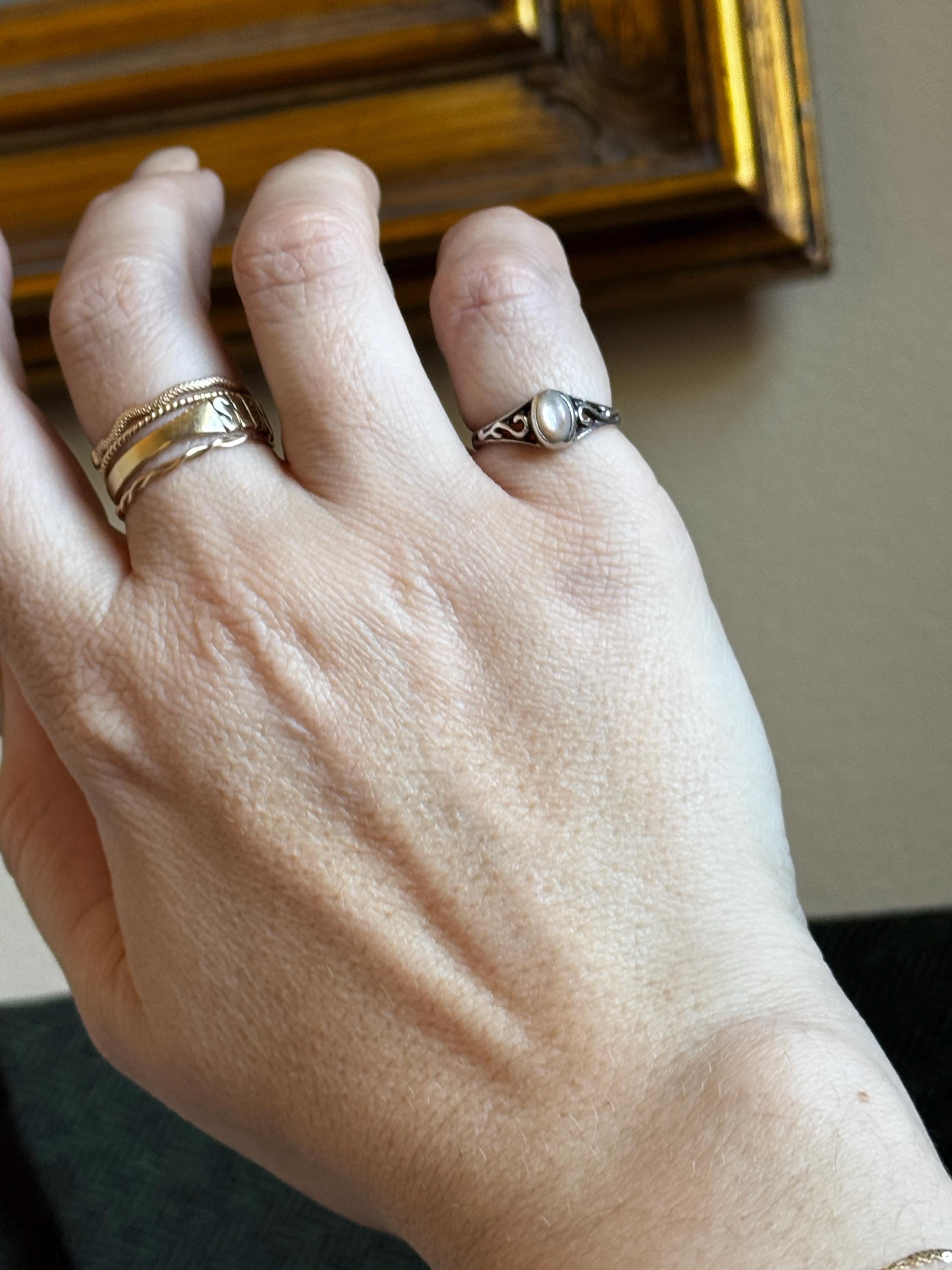A really pretty vintage sterling silver ring with filigree design featuring a gorgeous Mother of Pearl cabochon. This ring has a great profile and sits very comfortably on the hand. Based on research it looks like this ring could have been made by the company Silver Cloud.