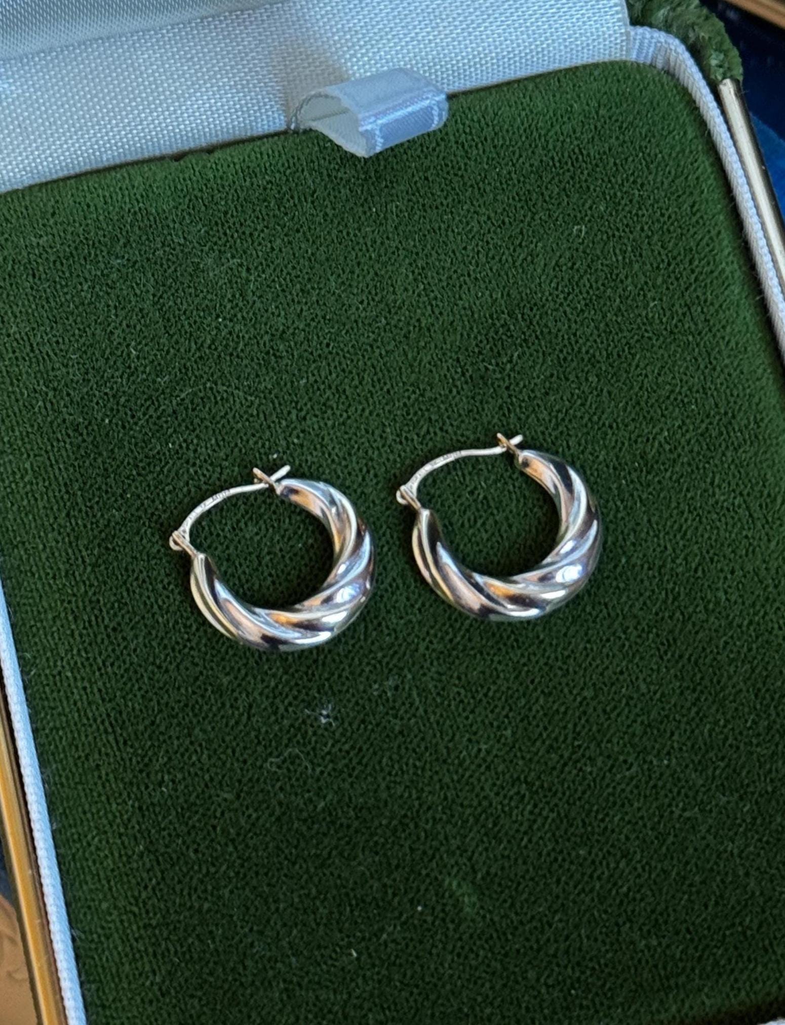These are the cutest little pair of vintage 10k solid gold hoops! They are white and yellow solid gold paired in a twisted design, and they are puffy and hollow, allowing them to be worn comfortably without weighing on the ear. These are great every day earrings to wear alone or to add to a growing ear stack.