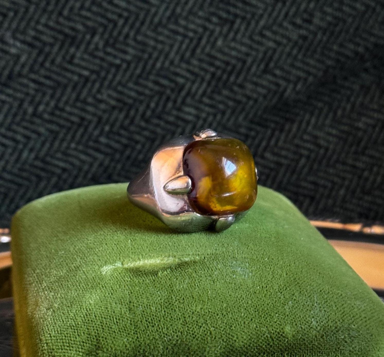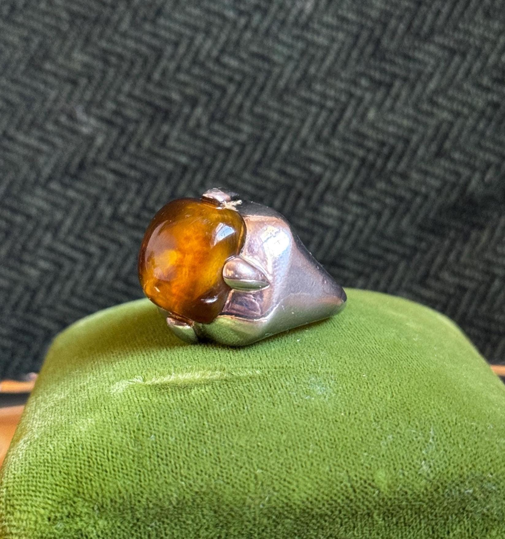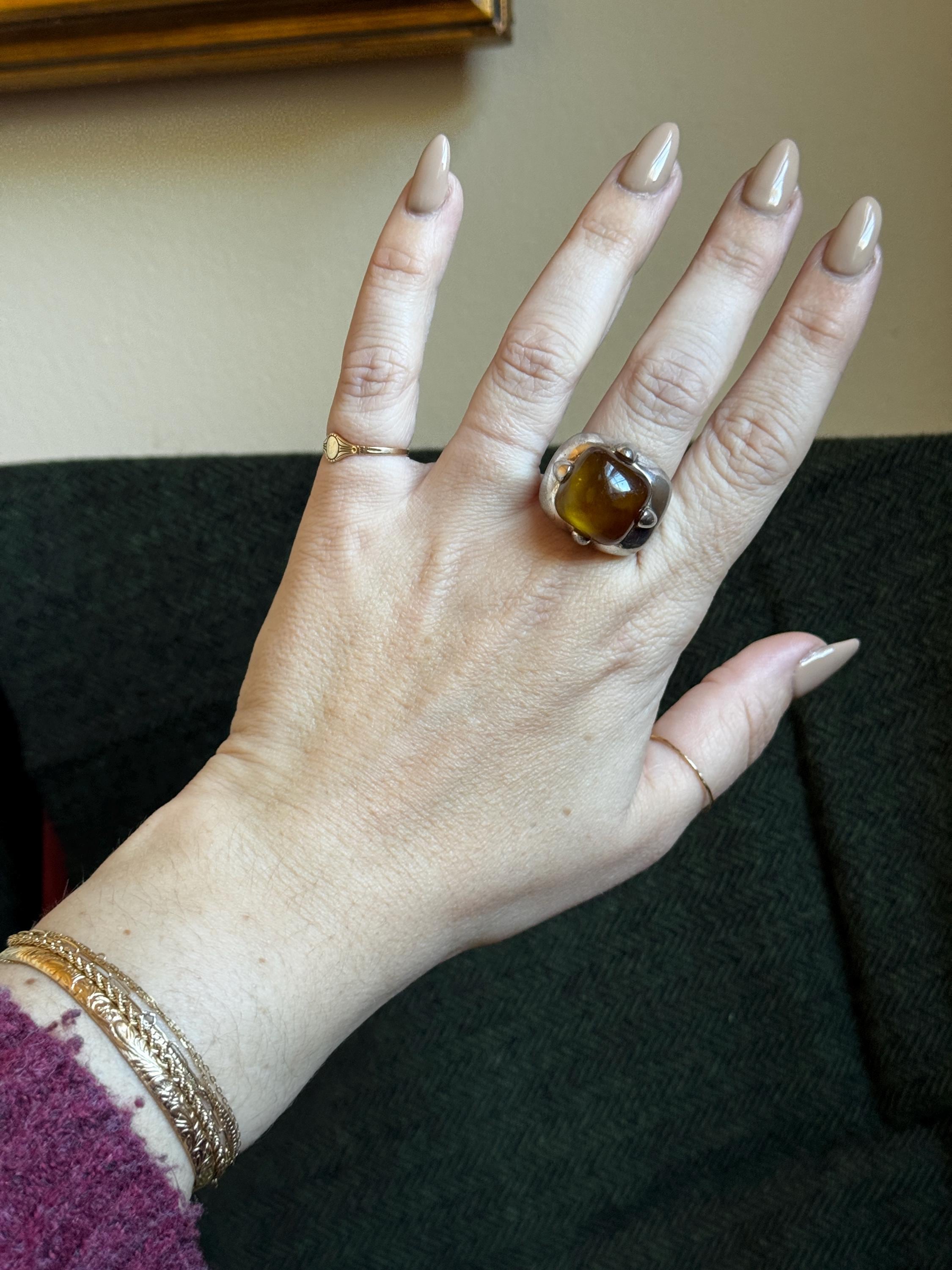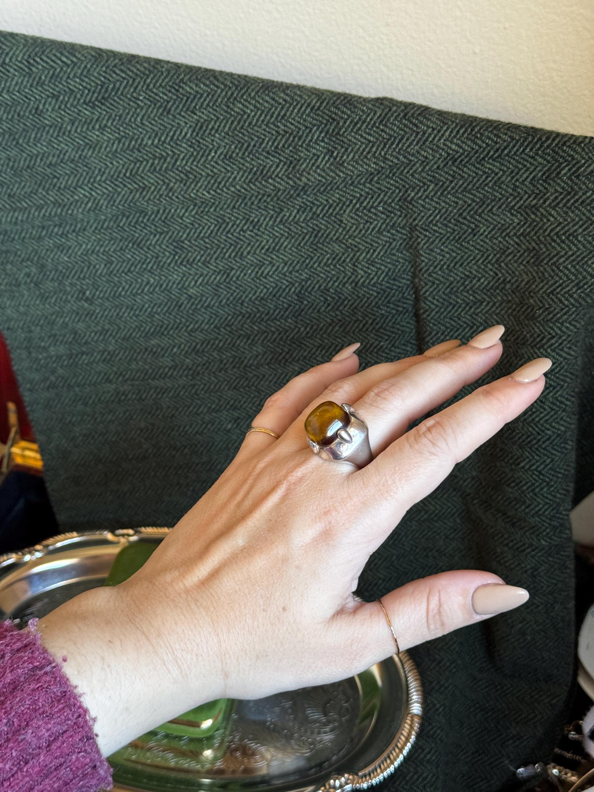 A very cool vintage cocktail ring by the jewelry brand Monet. This ring is hefty, silver-toned, and features a large center stone. The center stone has not been tested to see if it is faux or genuine amber. This ring brings an eclectic look to any stack.