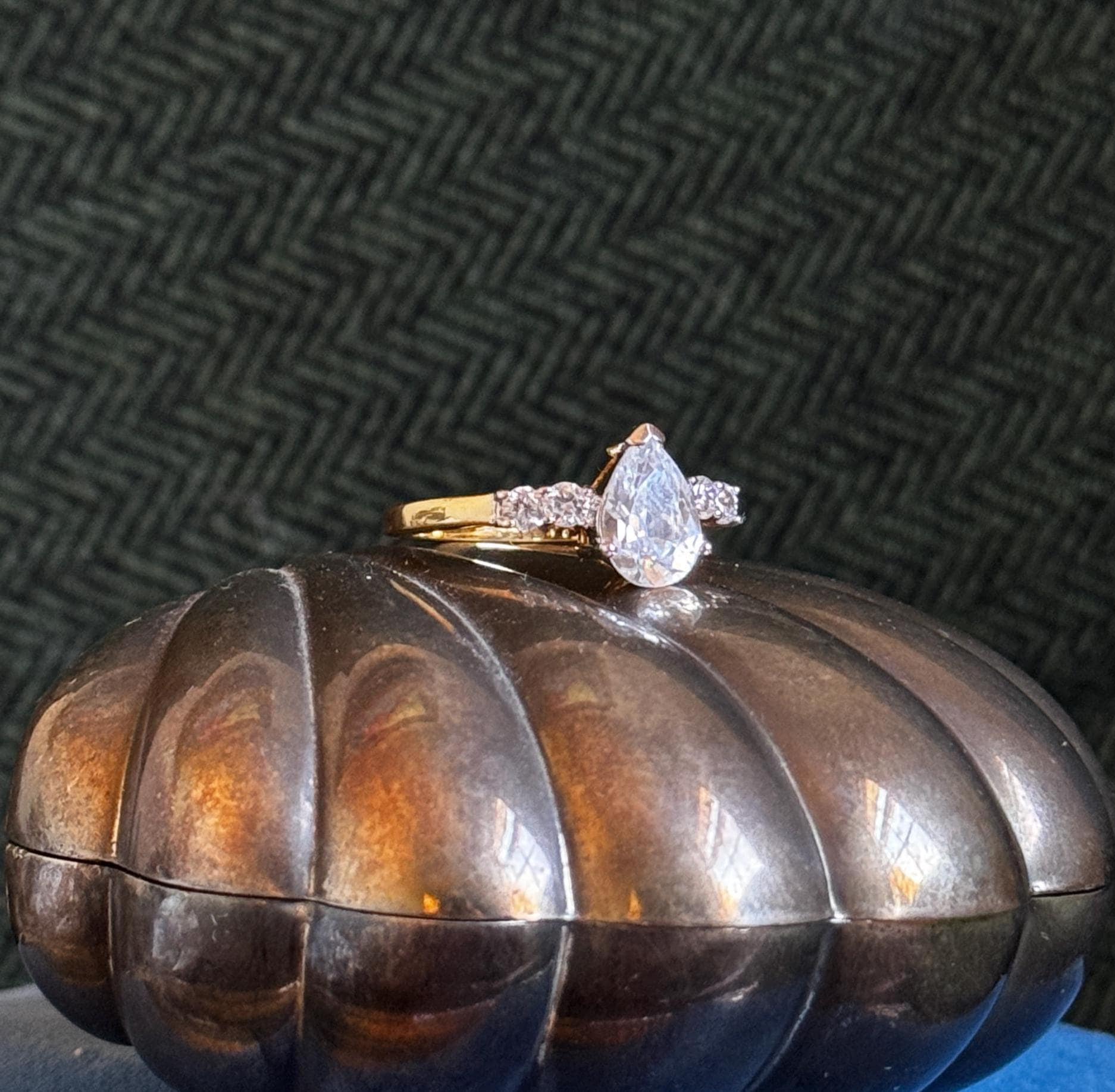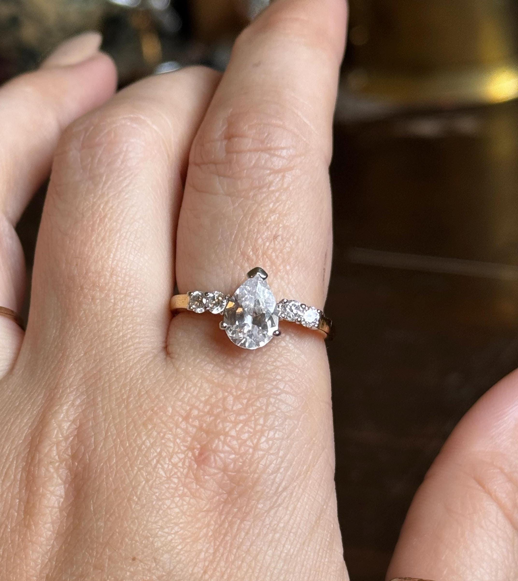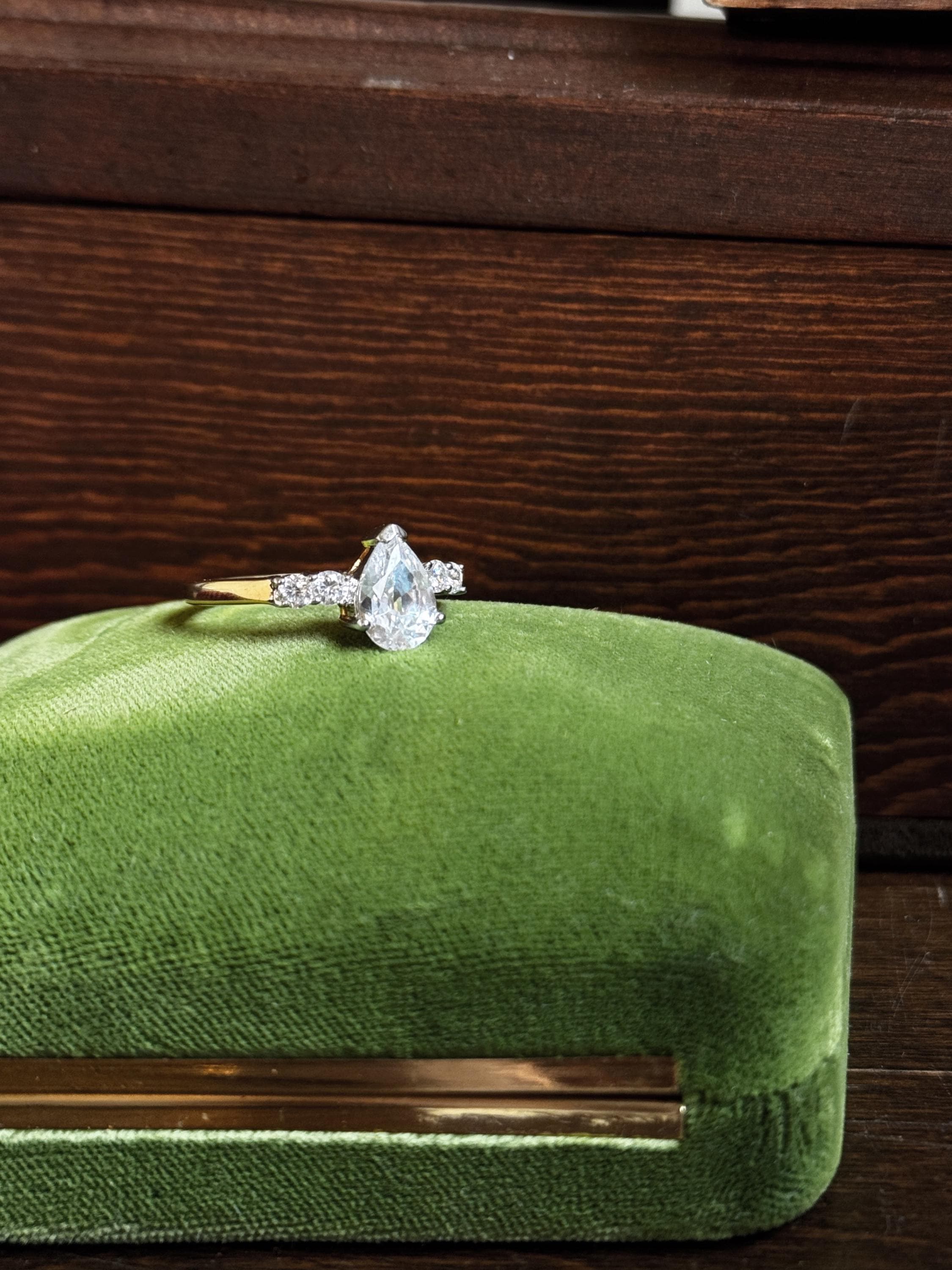 A very pretty and sparkly estate ring featuring 5 gorgeous white stones, the center stone being a larger pear-cut. This ring is marked "THAILAND" and does not react to a magnet. My research leads me to believe that this is a vermeil piece, but I've priced it to reflect it not having a 925 stamp.