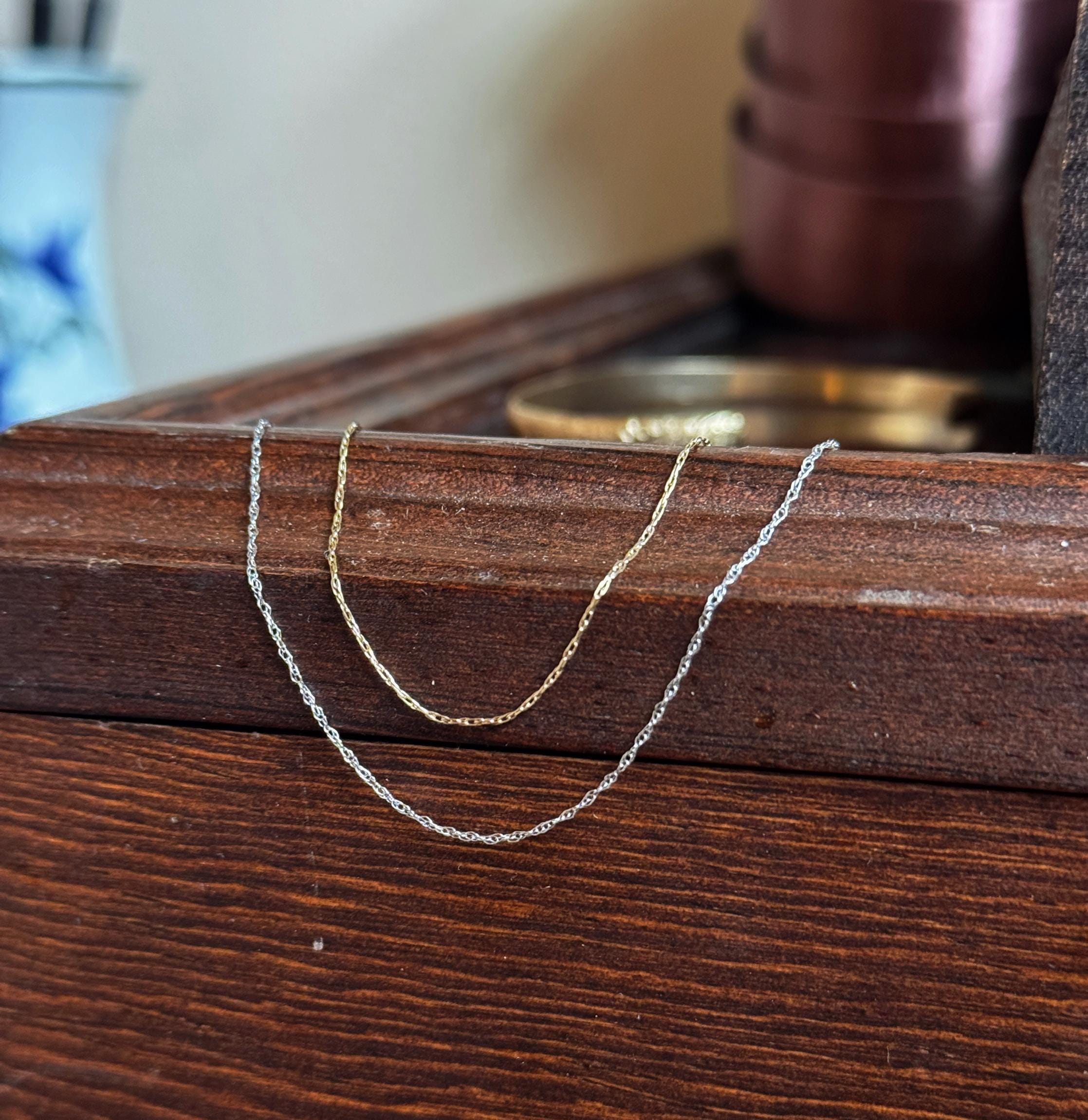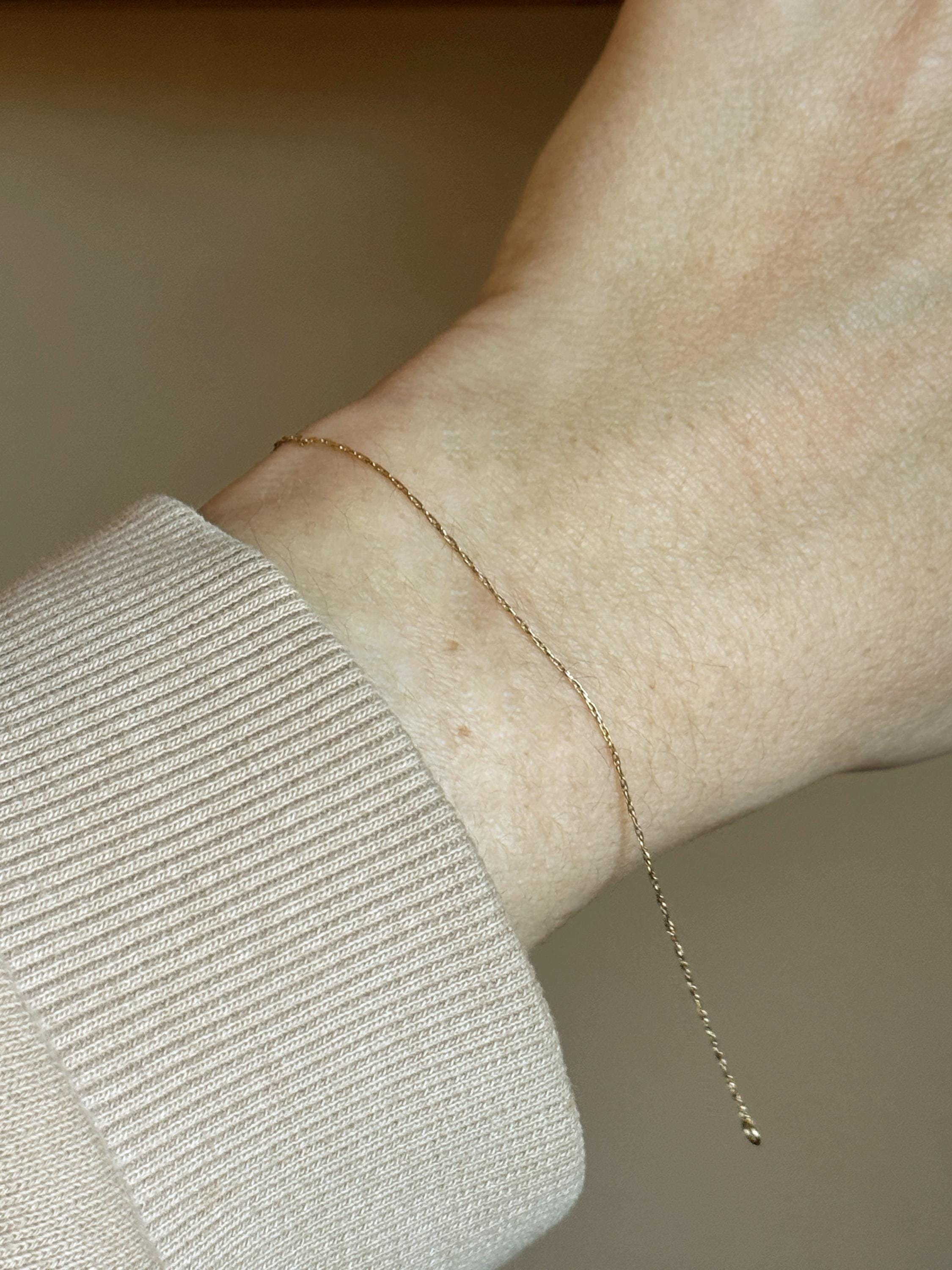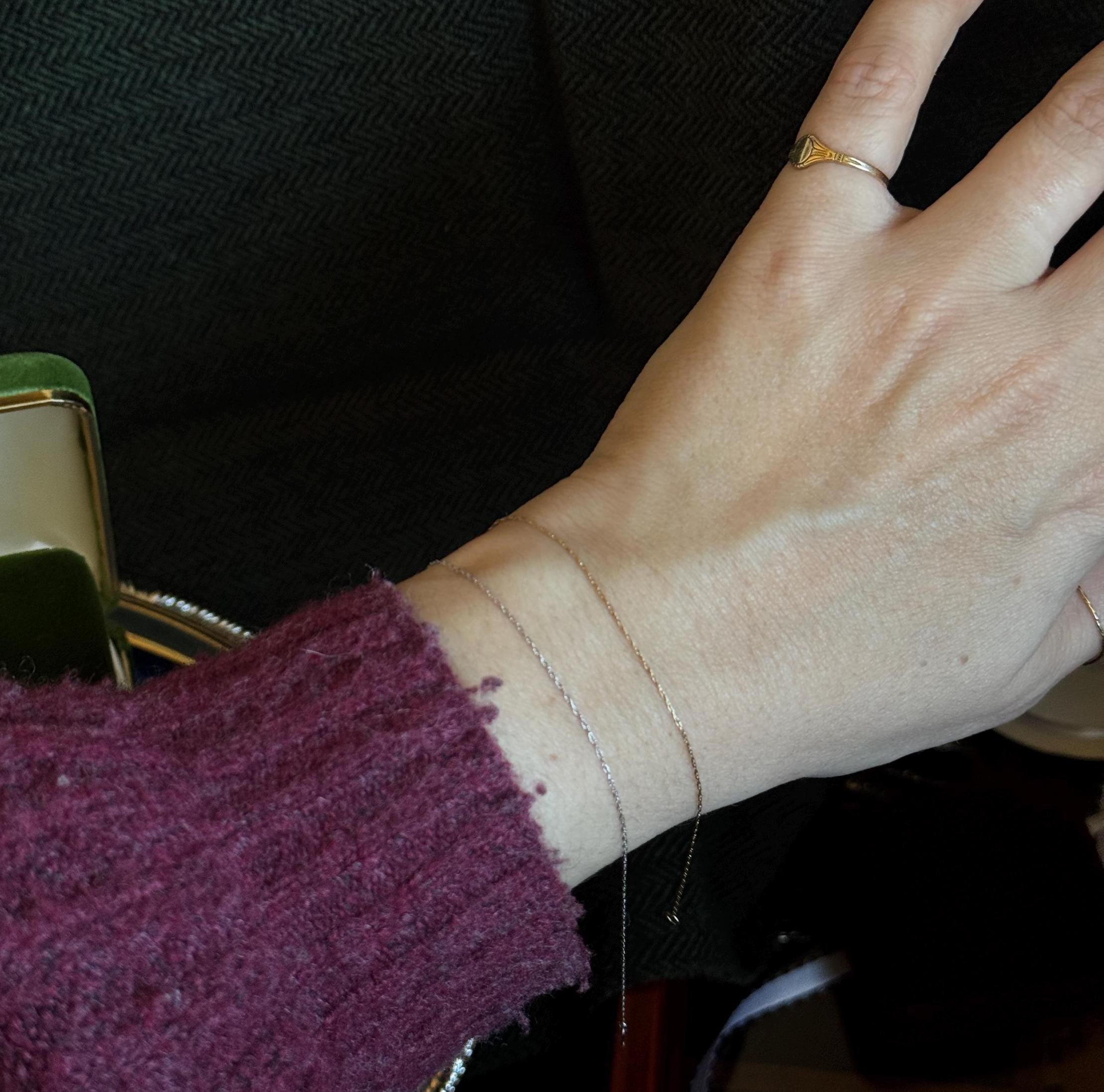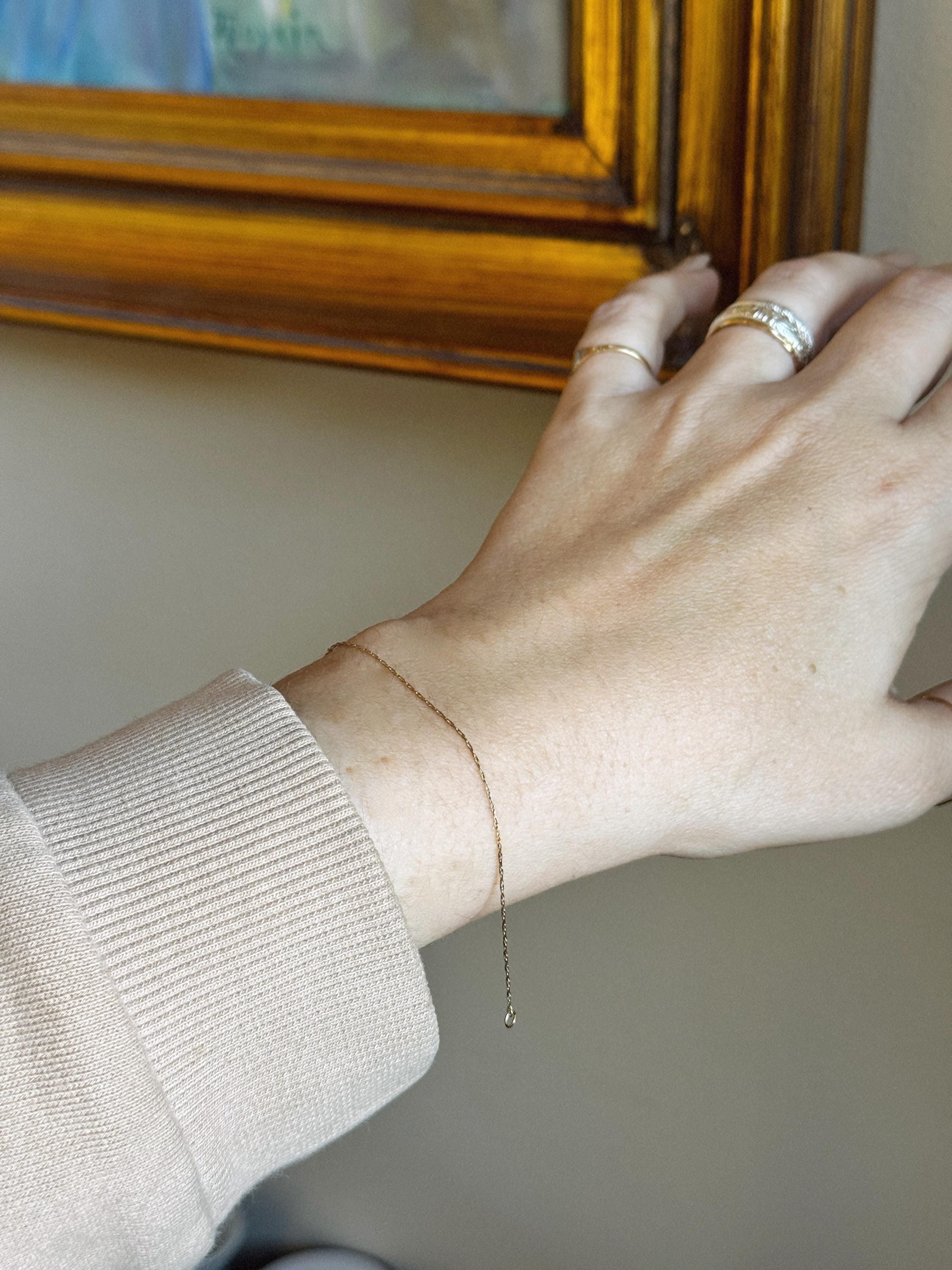 A dainty 10k solid gold chain handmade by up-cycling a vintage yellow gold chain that was destined for the melt pile. Currently measures at 6 inches long but I can add some adjustable sections to give extra length, or I can shorten it, as well. These bracelets are barely-there but they catch the light like tinsel on a tree. Please be aware that while these are solid gold, they are very dainty and could snap or stretch if caught the right way.
