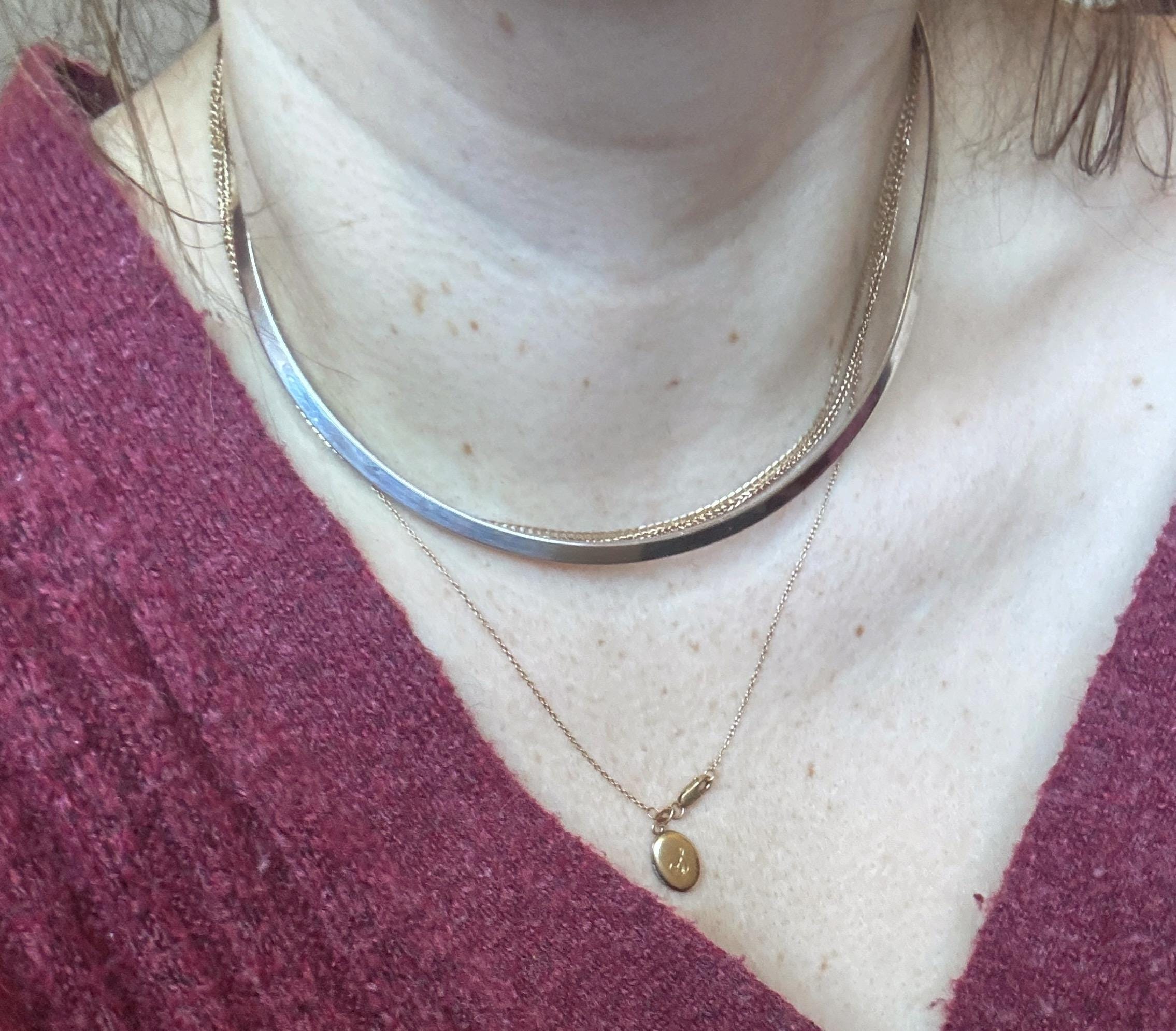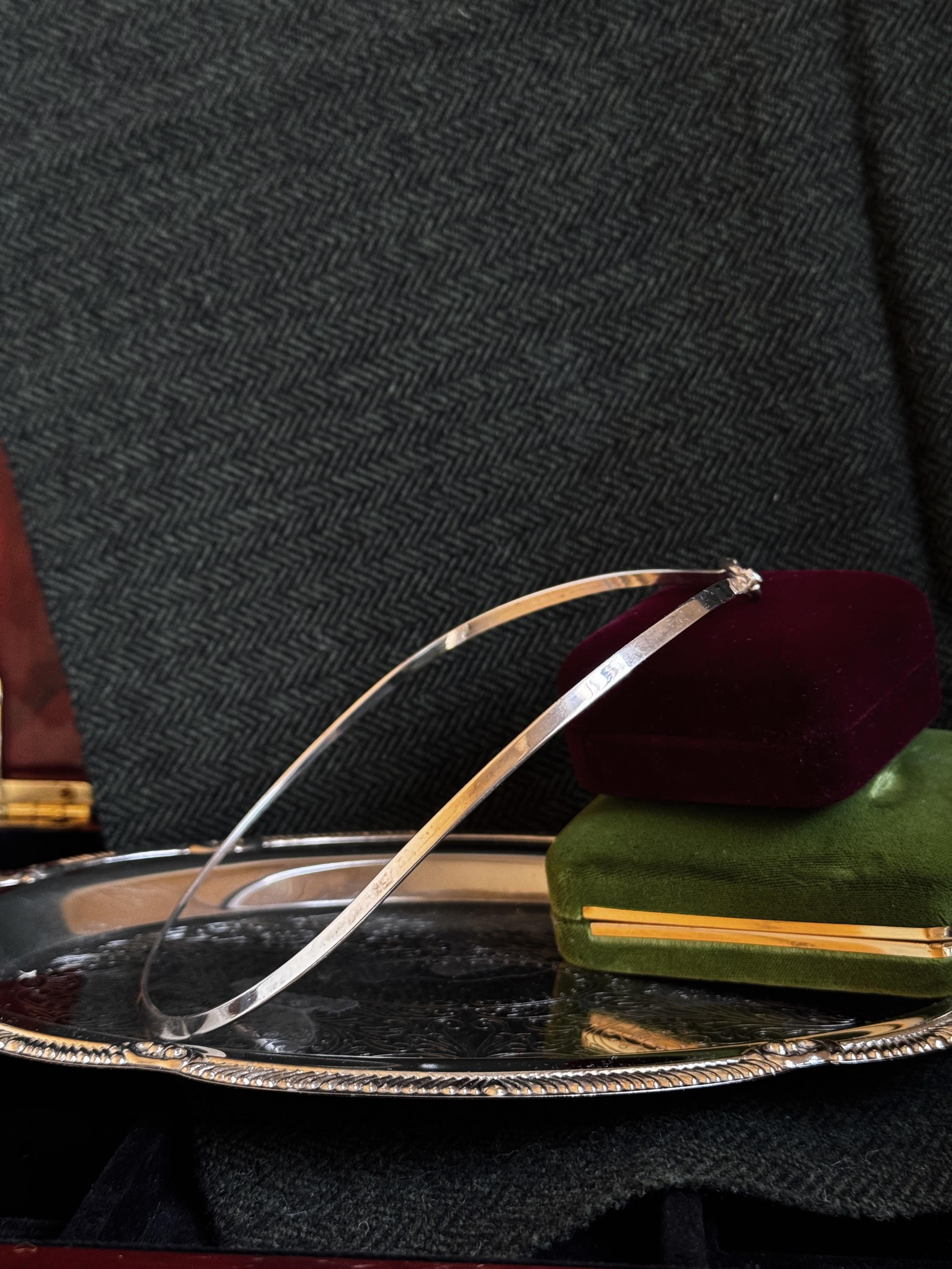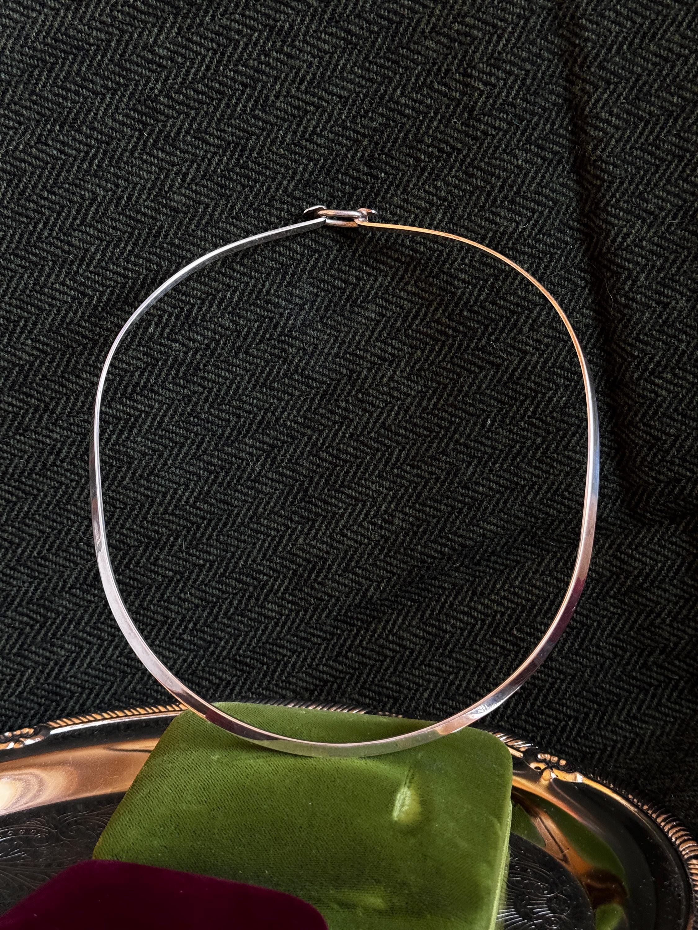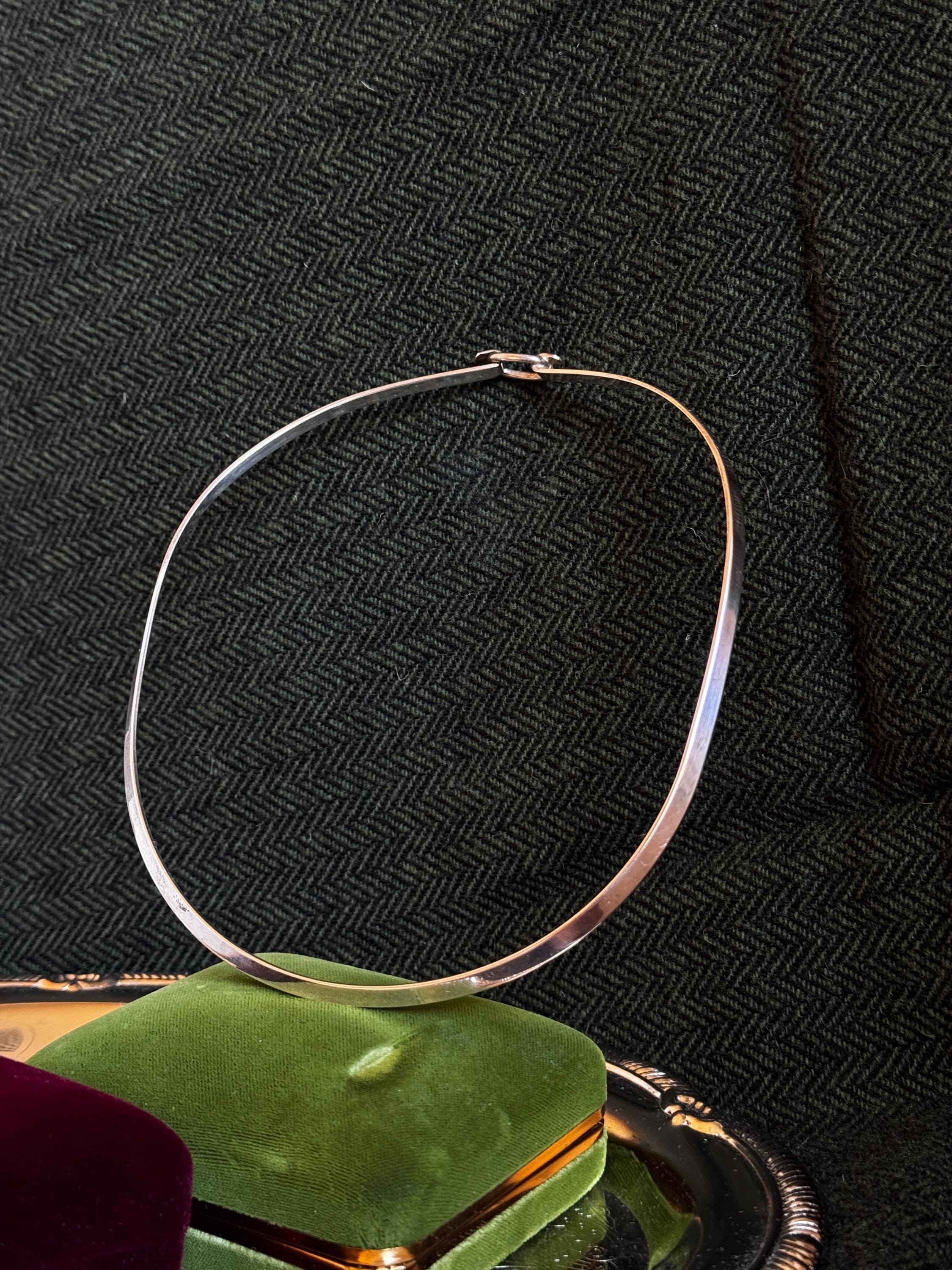 A sterling silver collar that adds a layer of cool-ness to every outfit. This is a sturdy vintage piece that opens and closes via a loop on the end of the piece. It is unmarked sterling silver. The necklace is shaped to lay perfectly and comfortably just above the collarbone.