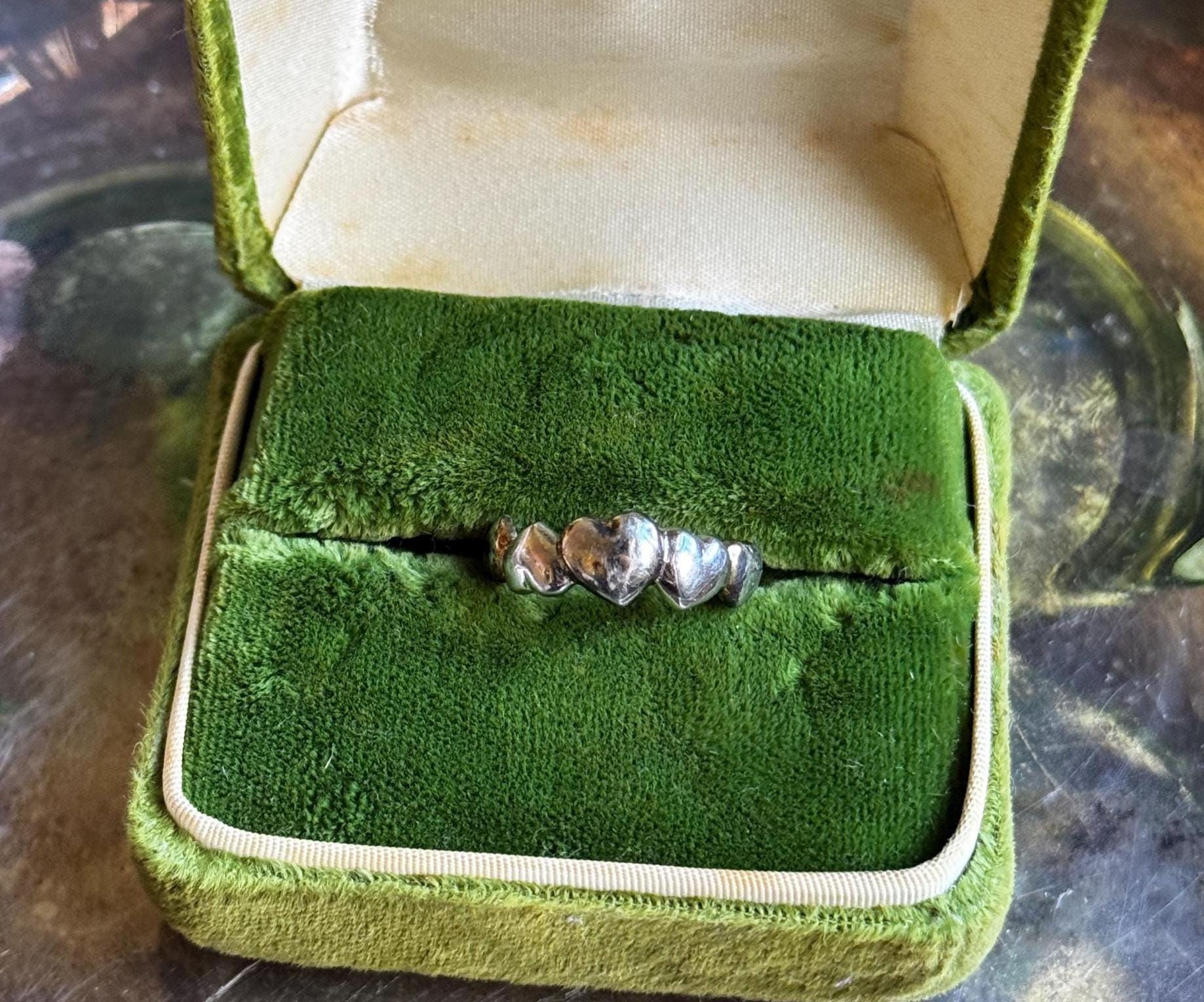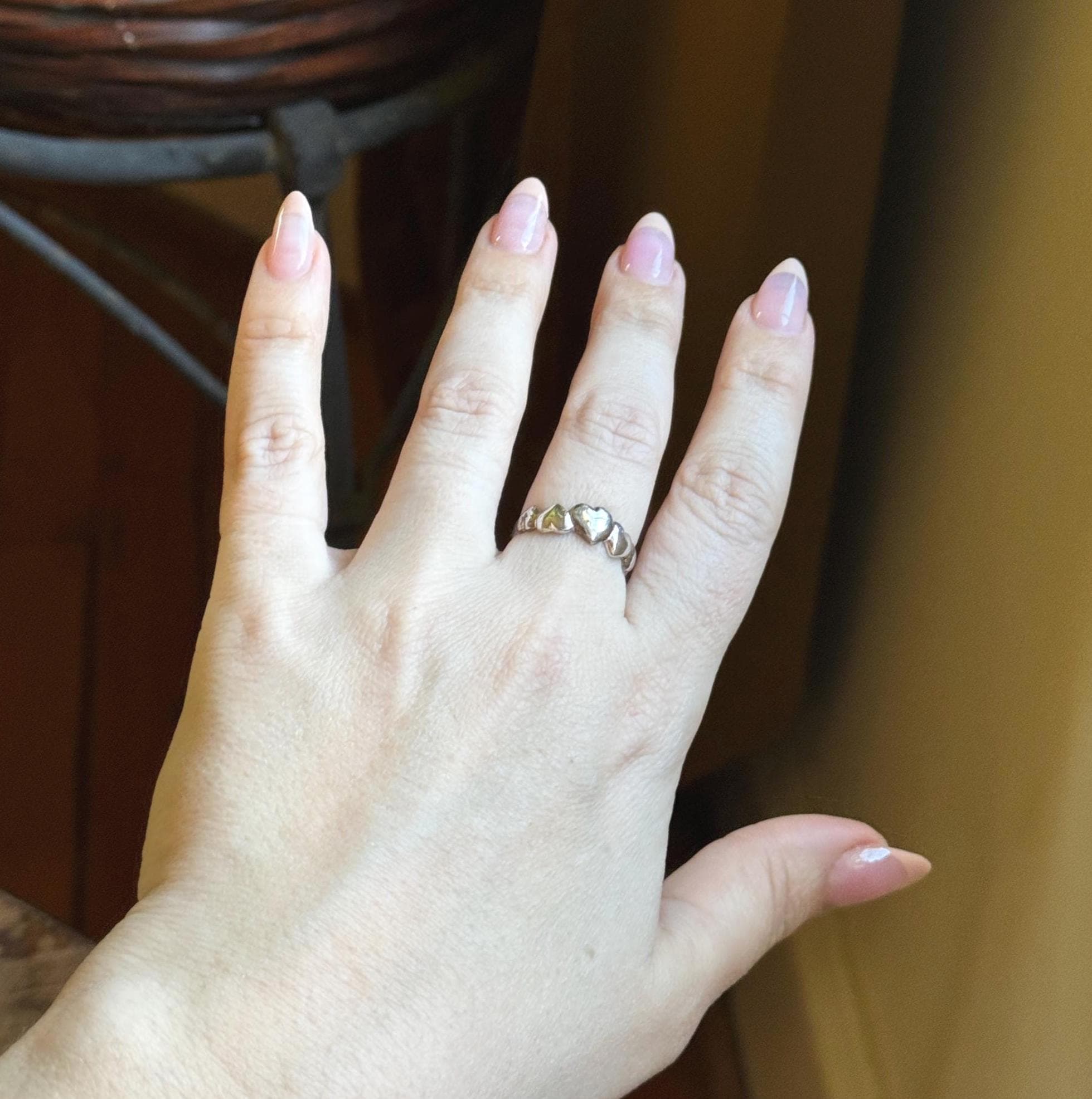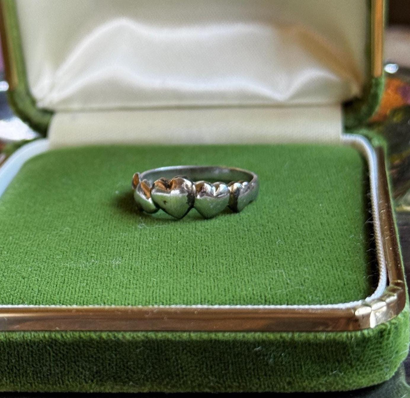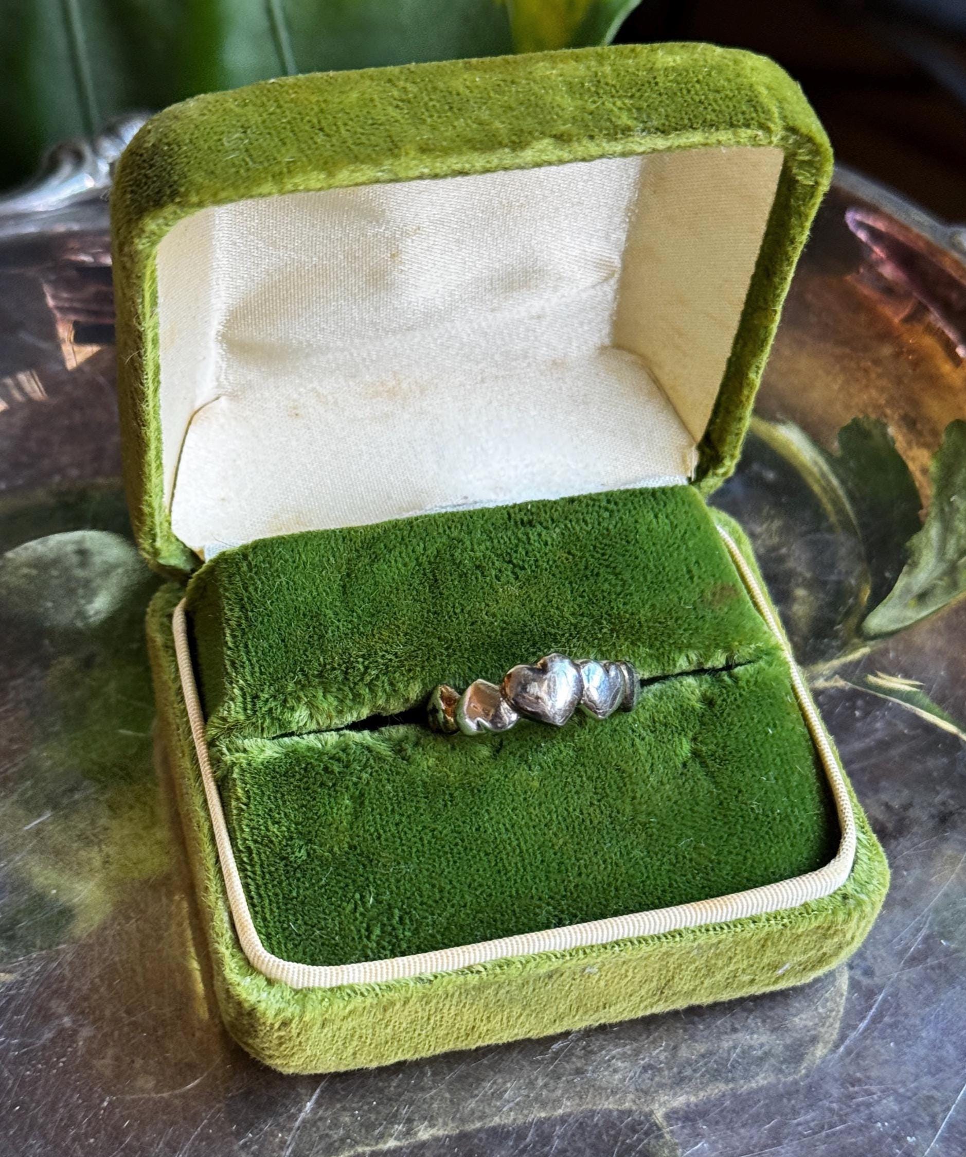 The cutest vintage ring, the most adorable Valentine's Day gift, the most precious birthday present (just TRUST ME they want jewelry!). This band of hearts looks so good on the hand, it is just substantial enough to be worn alone, but it is subtle enough to wear on a stack without being overpowering. It is very comfortable to wear, it isn't too heavy, and it's low-profile so it packs a punch without catching everything that gets near your hand.
