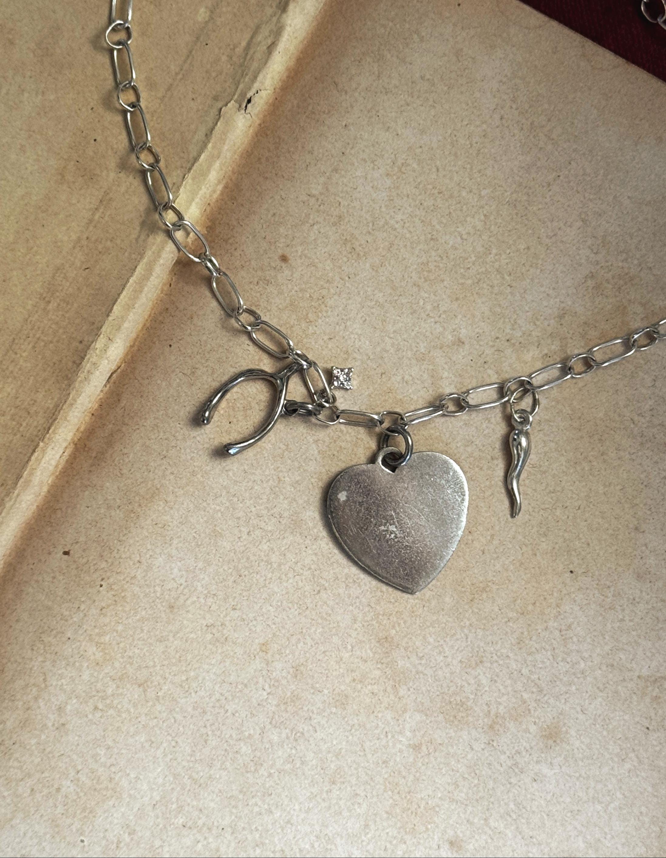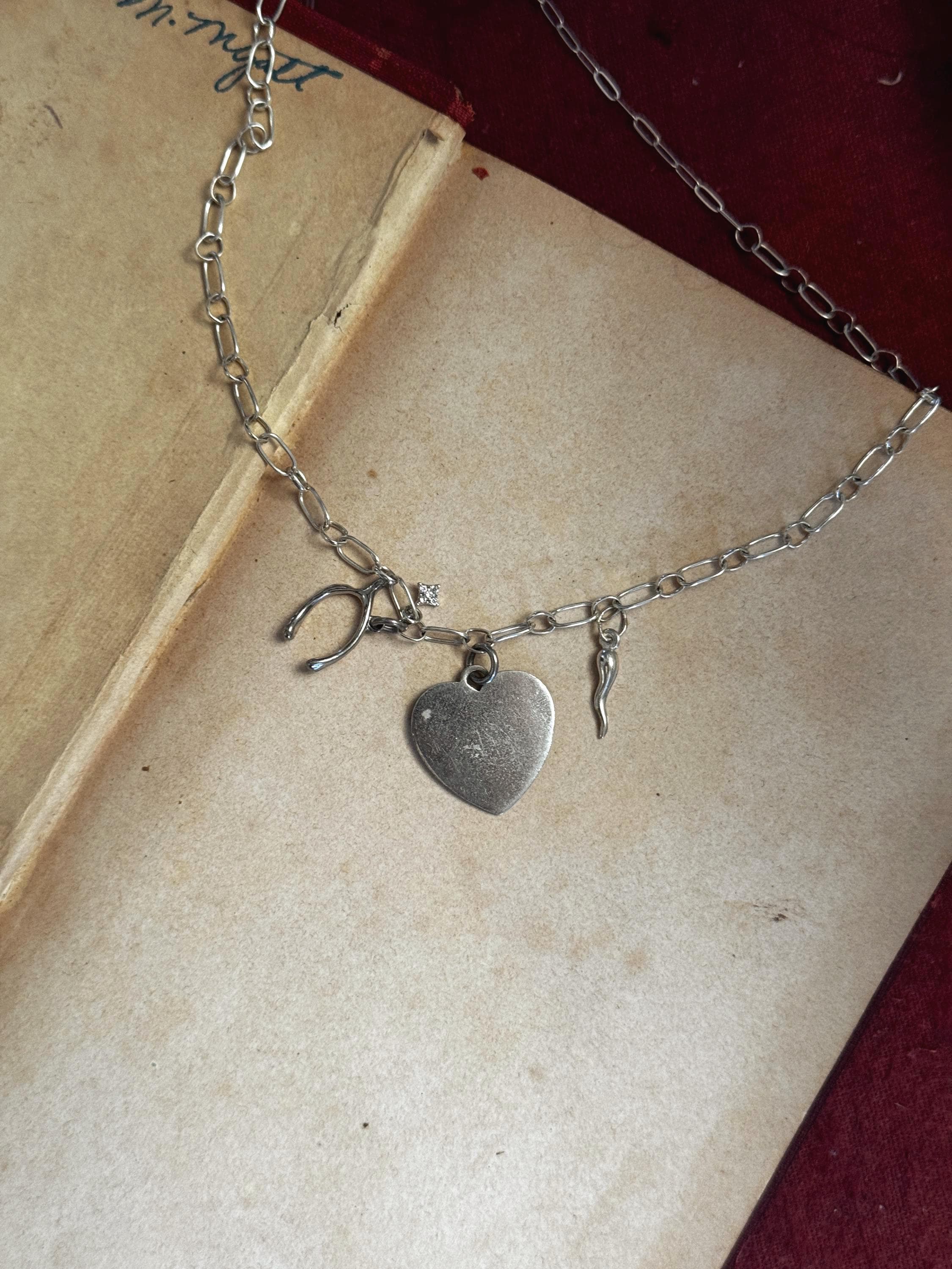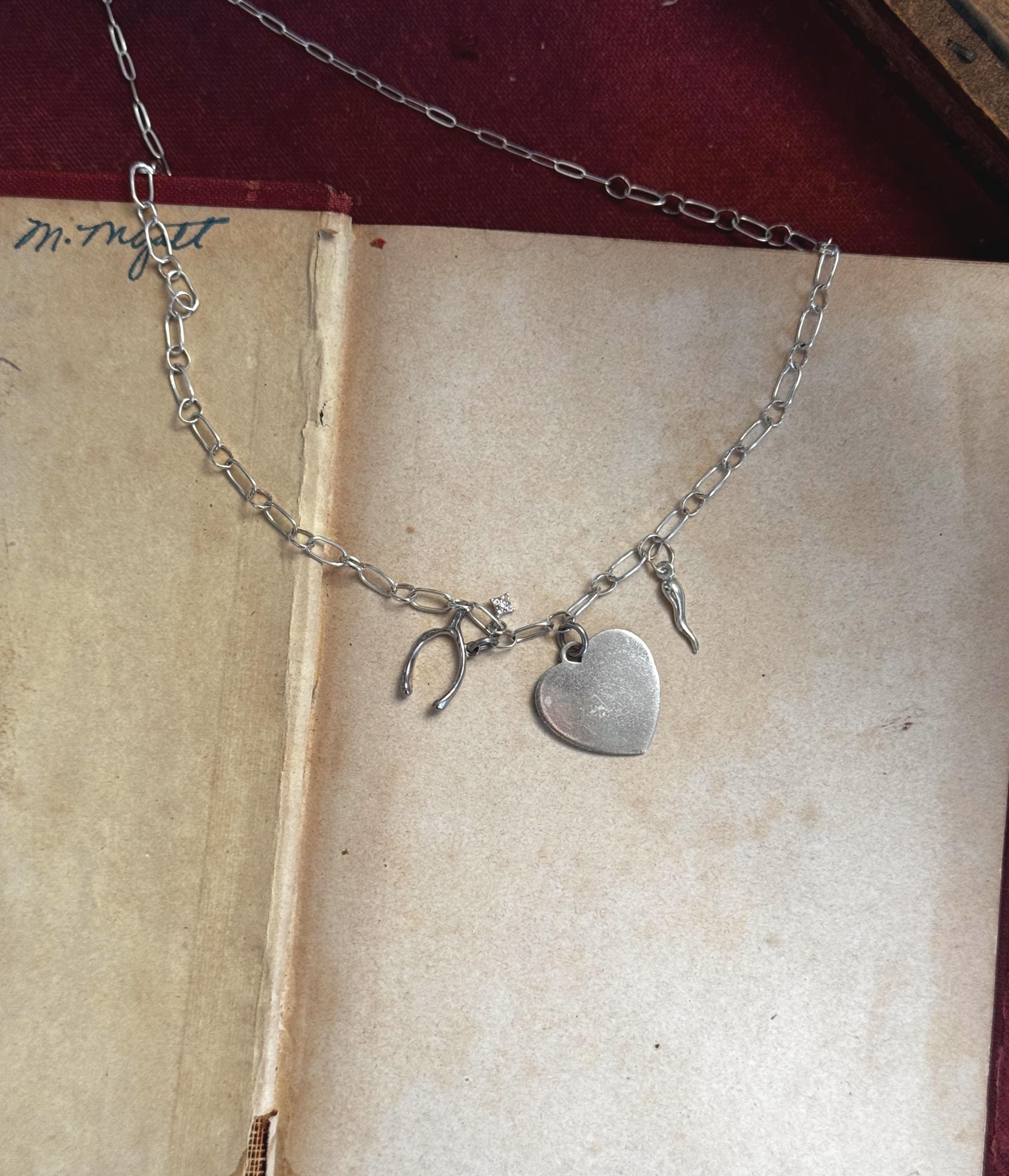 Tell them you're feeling lucky in love with this handmade charm necklace. A handmade by Feral Ties sterling silver chain and a mix of vintage (the wishbone and the blank heart) and modern (The cornicello and star) sterling silver charms. The blank heart could be engraved by a jeweler to serve as a love letter, or perhaps the perfect spot for a pet name. The entirety of the necklace measures to about 16.5 inches; this could be shortened, or I can add an extender to the chain if you desire- just send me a message!