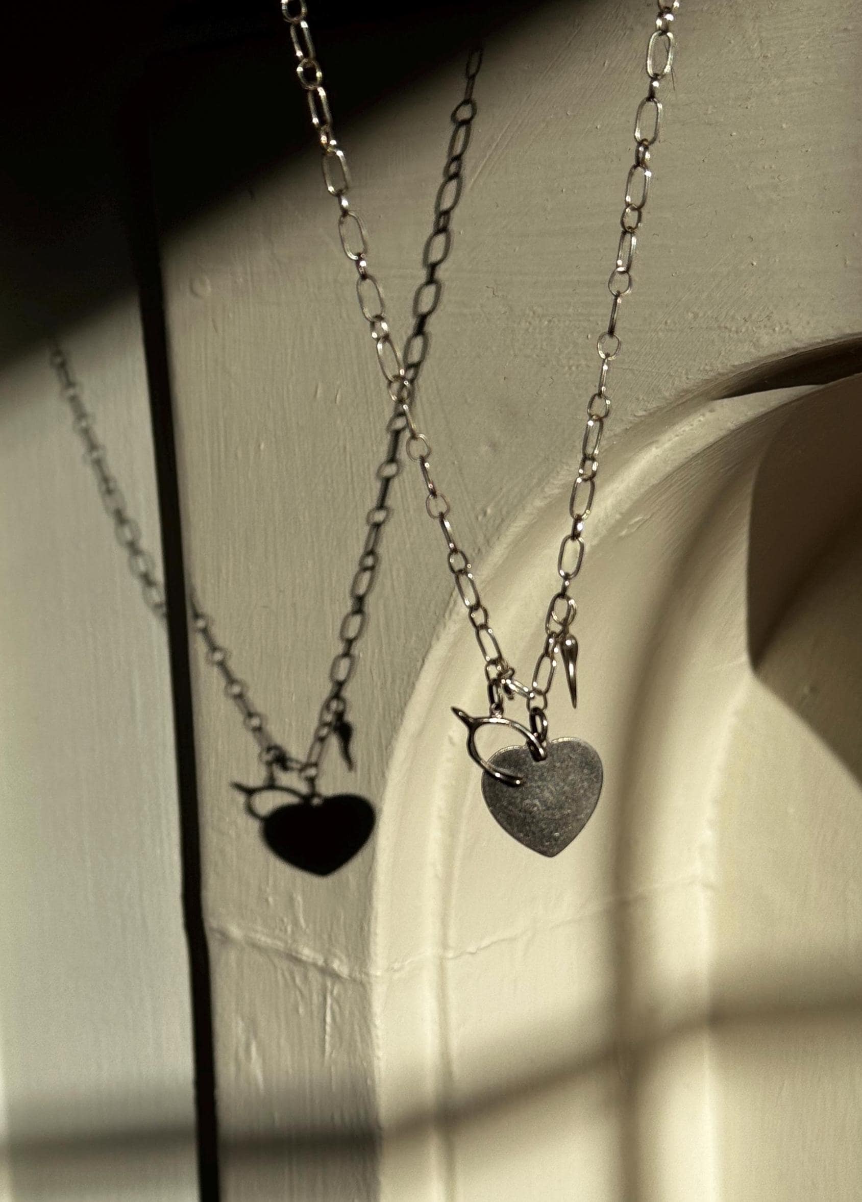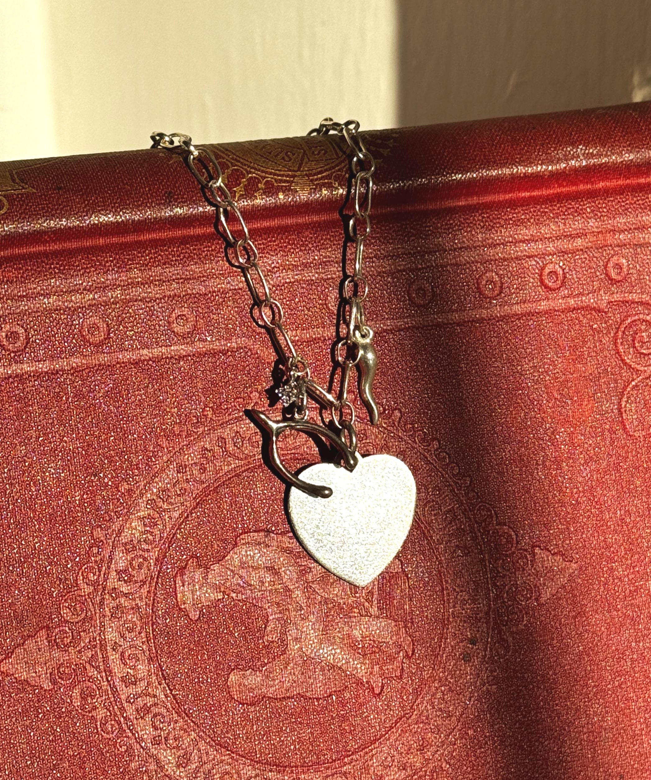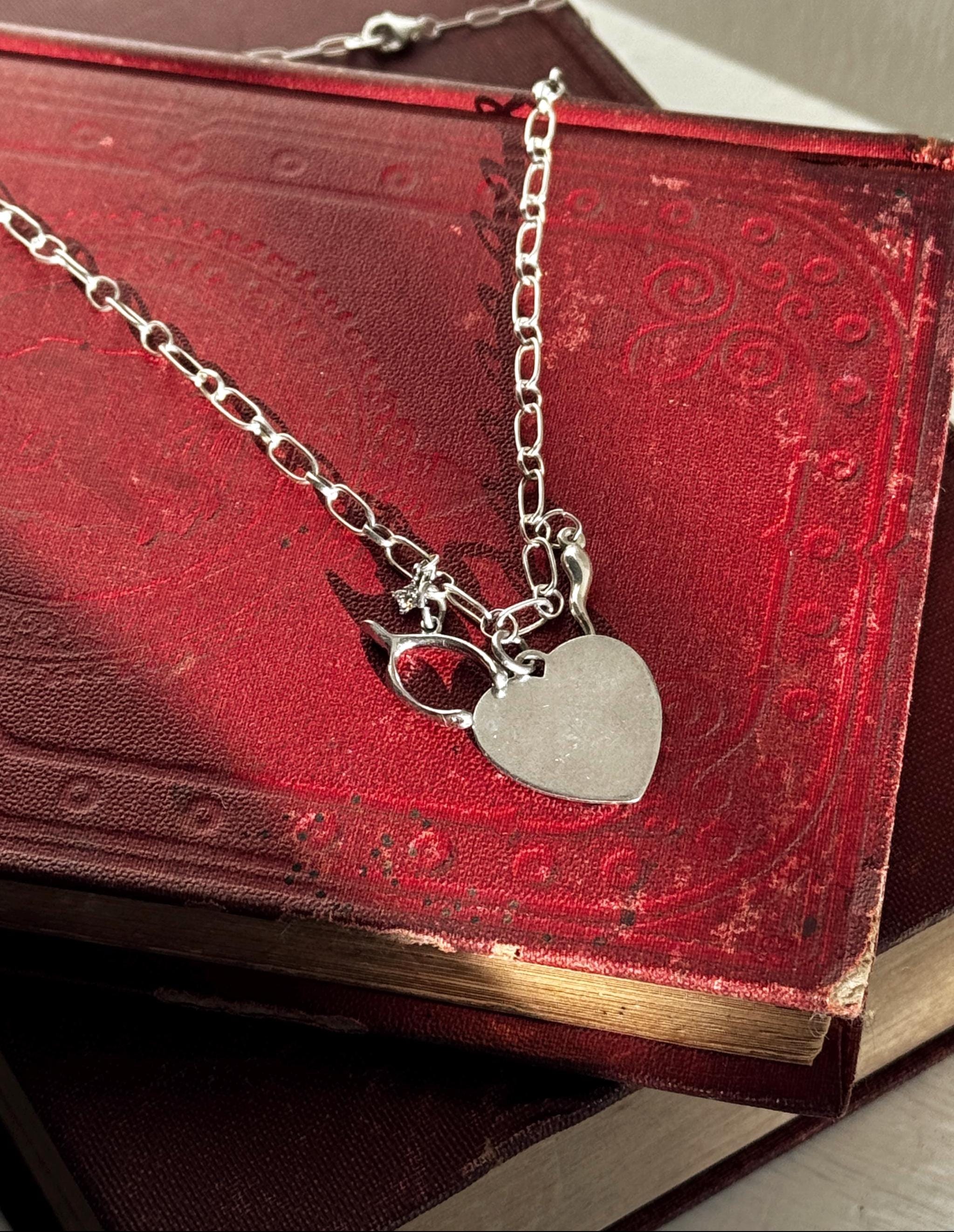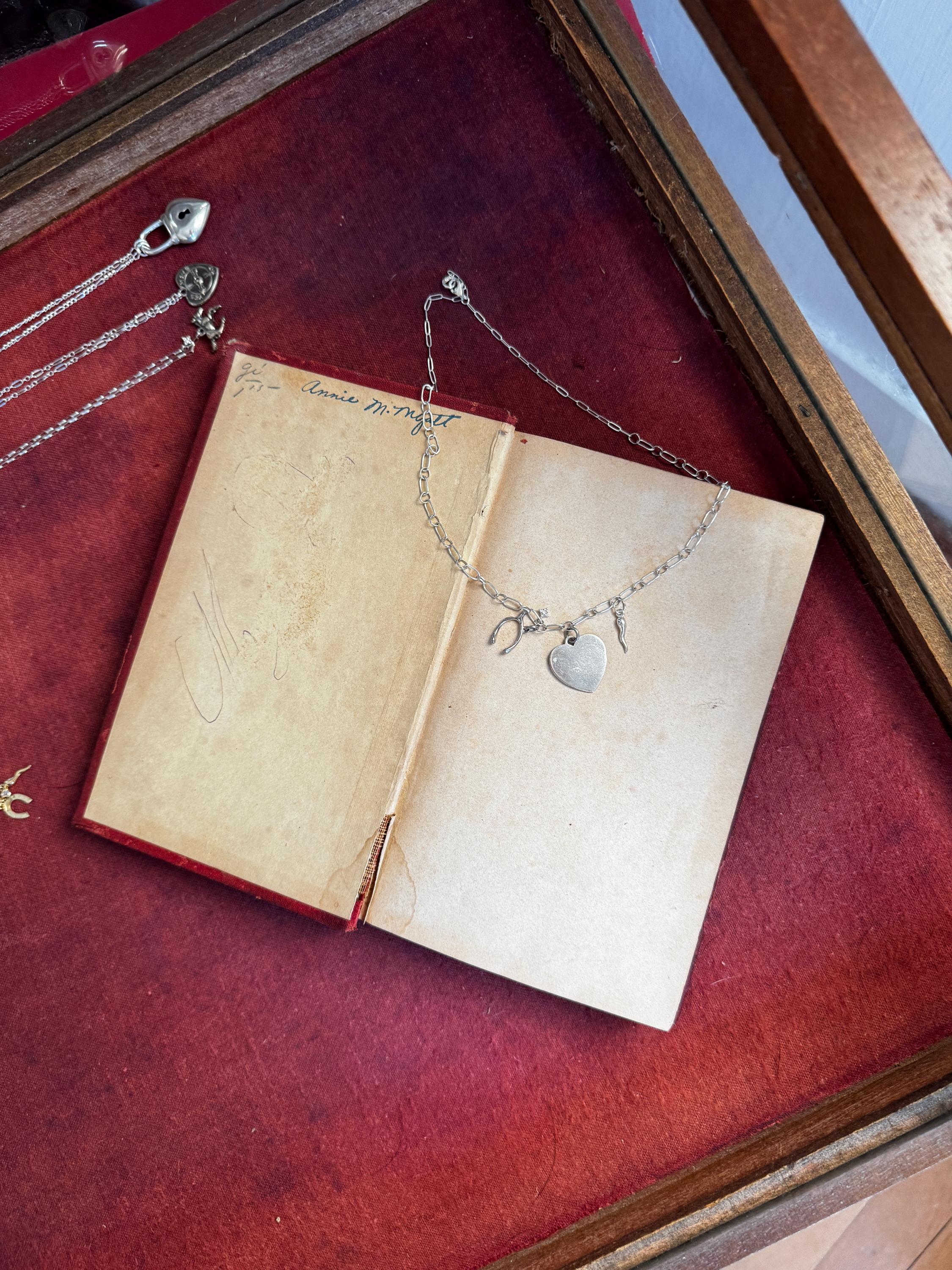 Tell them you're feeling lucky in love with this handmade charm necklace. A handmade by Feral Ties sterling silver chain and a mix of vintage (the wishbone and the blank heart) and modern (The cornicello and star) sterling silver charms. The blank heart could be engraved by a jeweler to serve as a love letter, or perhaps the perfect spot for a pet name. The entirety of the necklace measures to about 16.5 inches; this could be shortened, or I can add an extender to the chain if you desire- just send me a message!