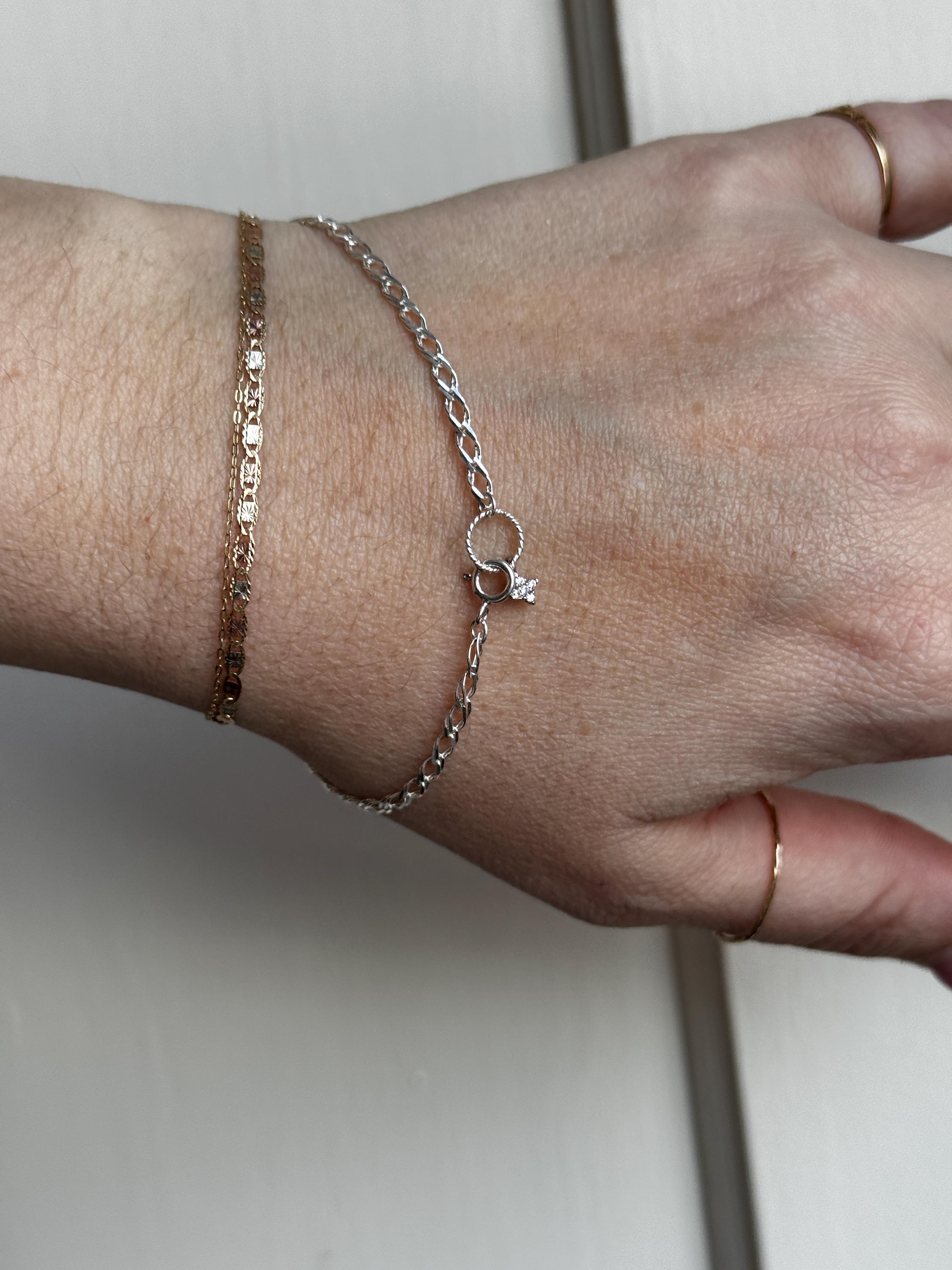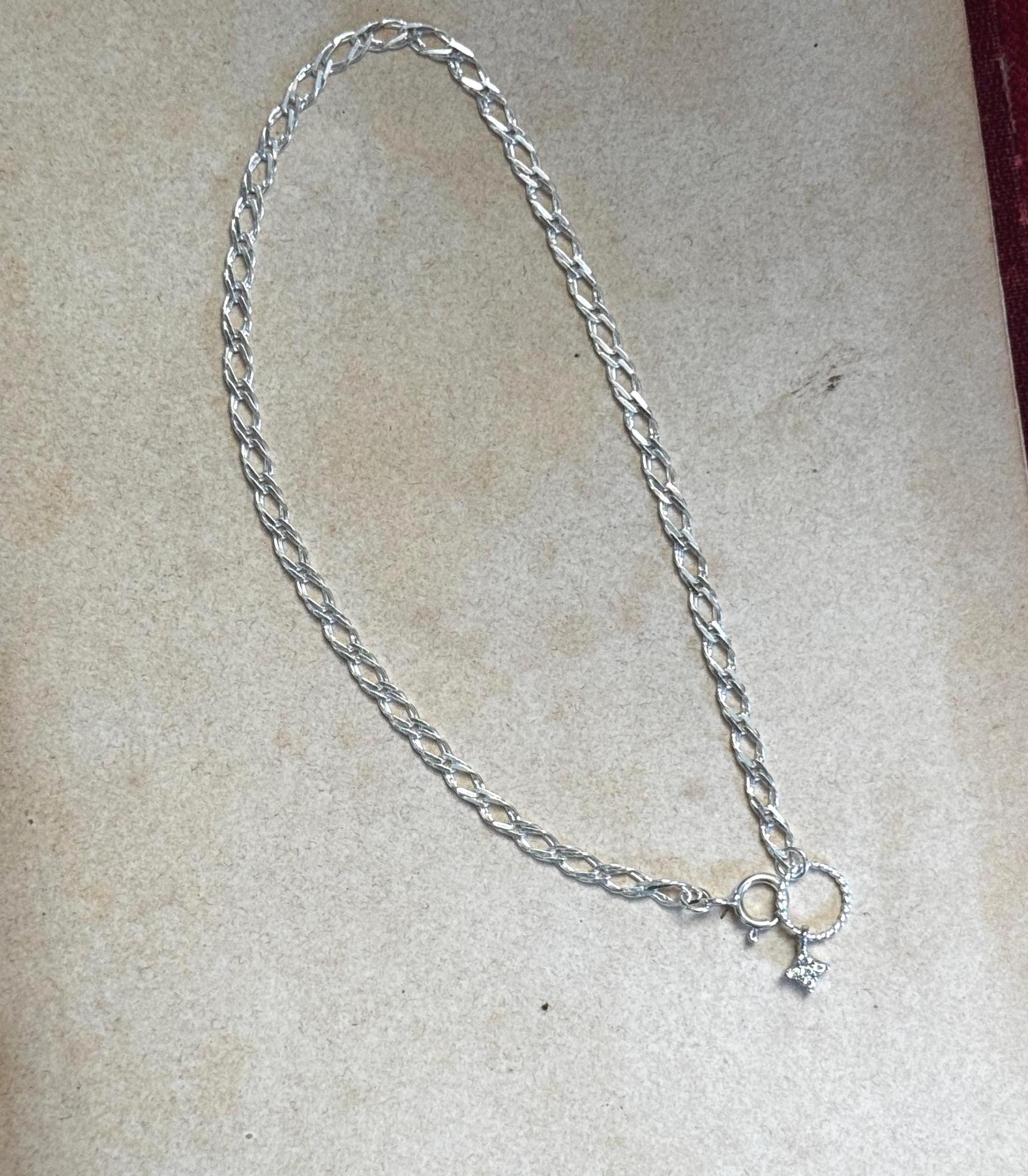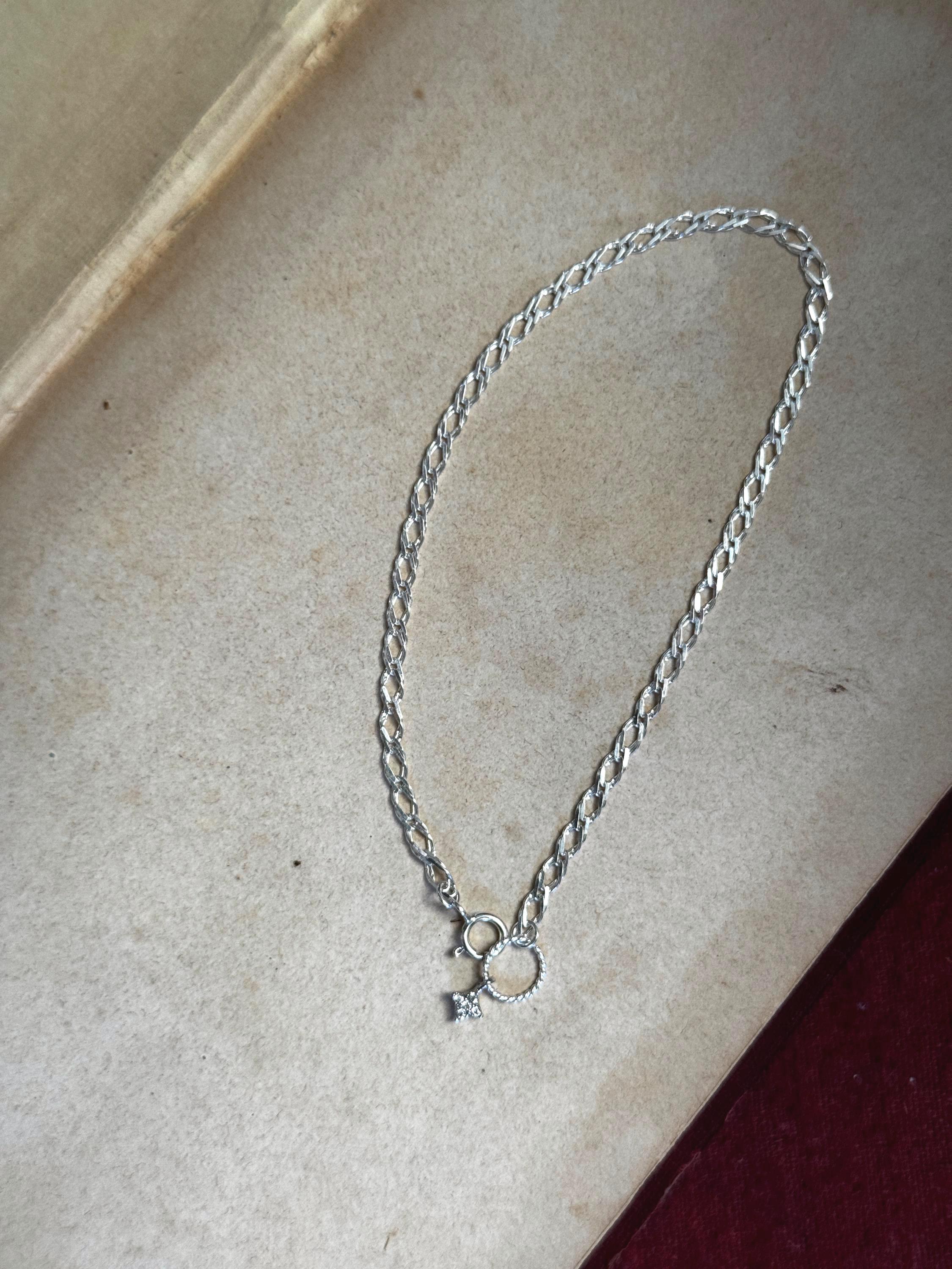 A handmade by Feral Ties openwork Rambo chain that feels like the links are interwoven like fabric. At the clasp there is a star charm with tiny CZ stones connected to the twisted loop. This bracelet is sterling silver, made using modern components. It measures a little over 7 inches but can be shortened if requested- let me know what size you prefer!