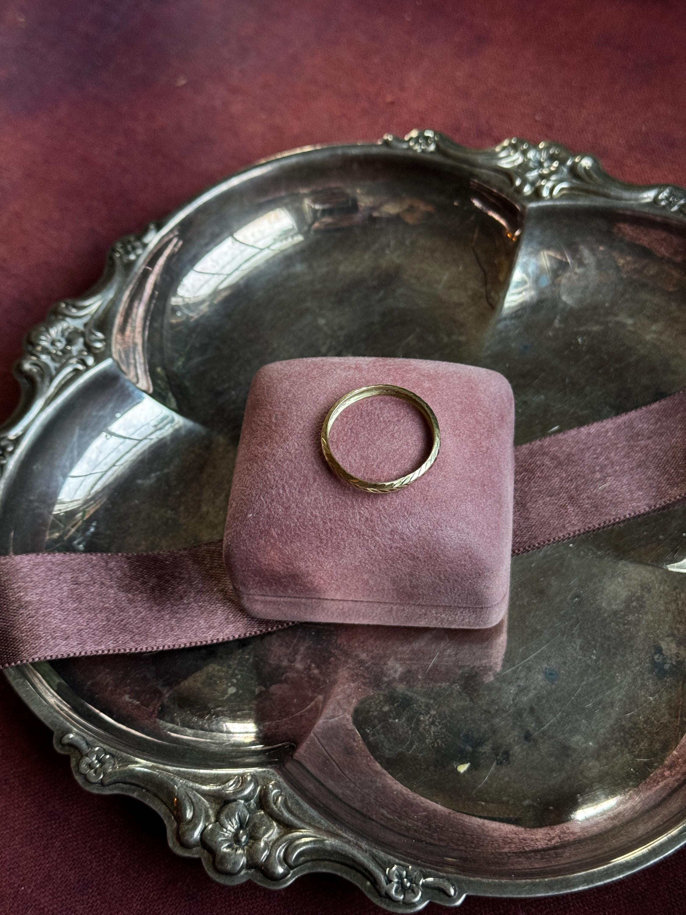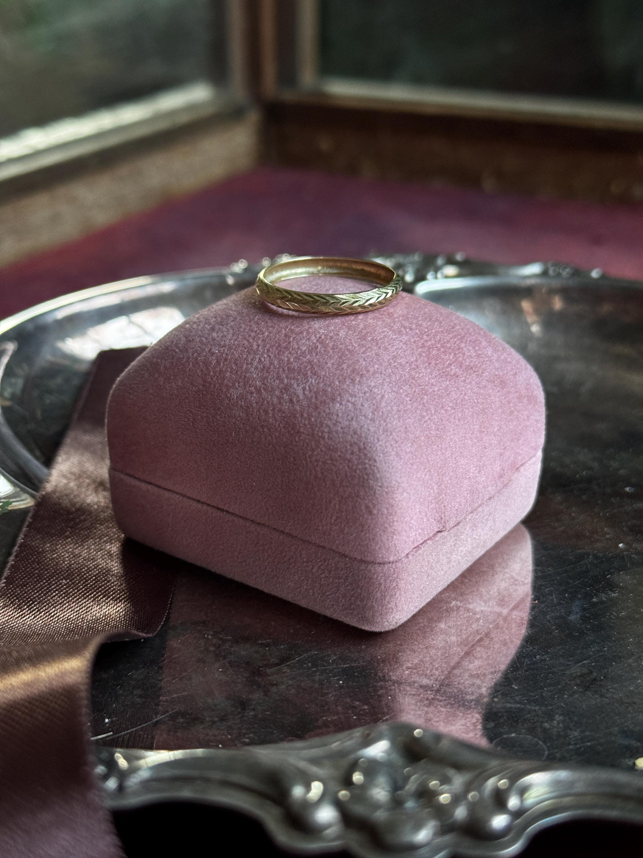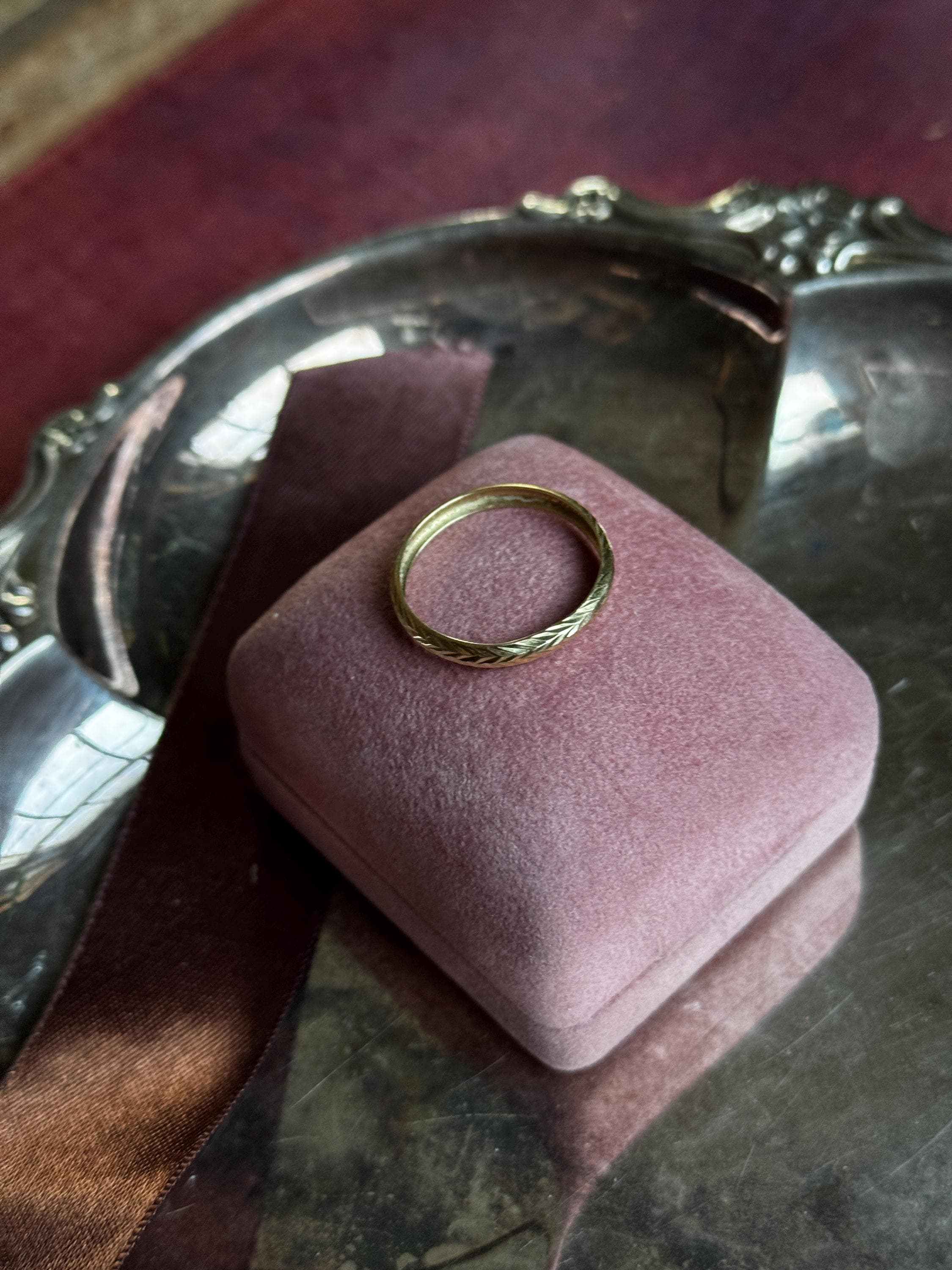 This is a beautiful and timeless vintage 14k solid gold ring. It has a diamond-cut Wheat pattern detail around the outer edge that adds texture and catches light. This ring is lightweight and has a curved design that offers a puffed look without feeling too substantial.