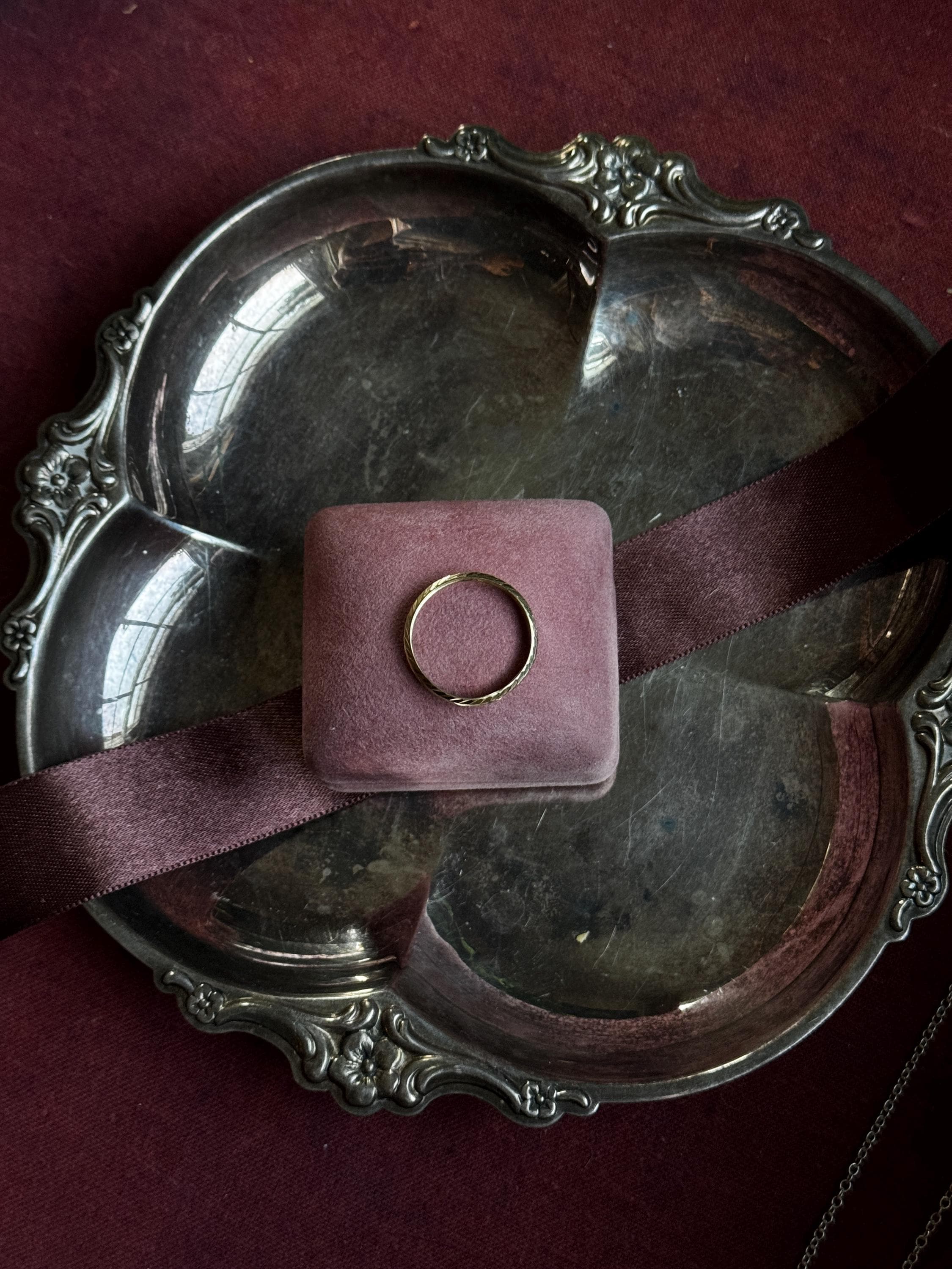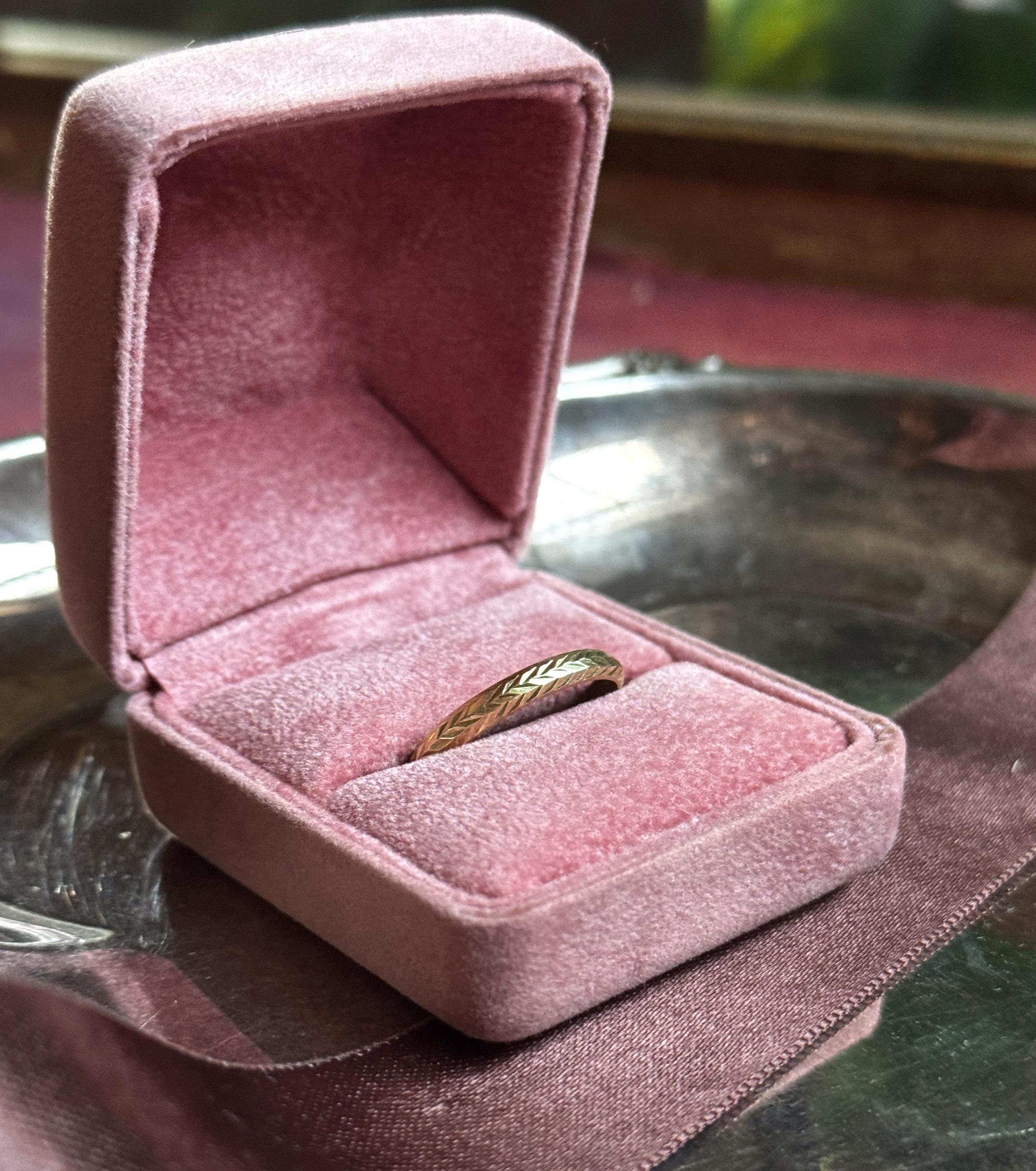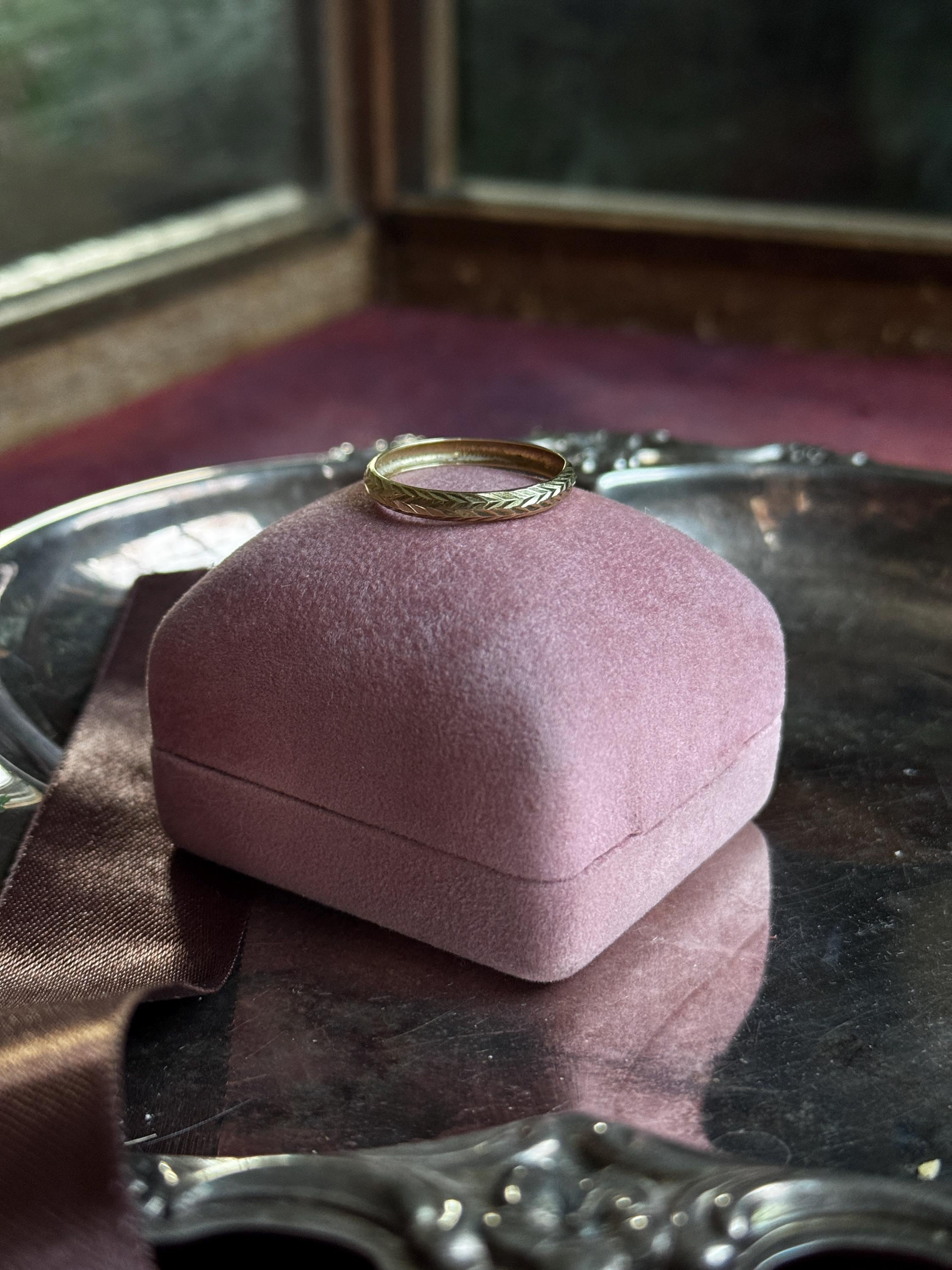 This is a beautiful and timeless vintage 14k solid gold ring. It has a diamond-cut Wheat pattern detail around the outer edge that adds texture and catches light. This ring is lightweight and has a curved design that offers a puffed look without feeling too substantial.